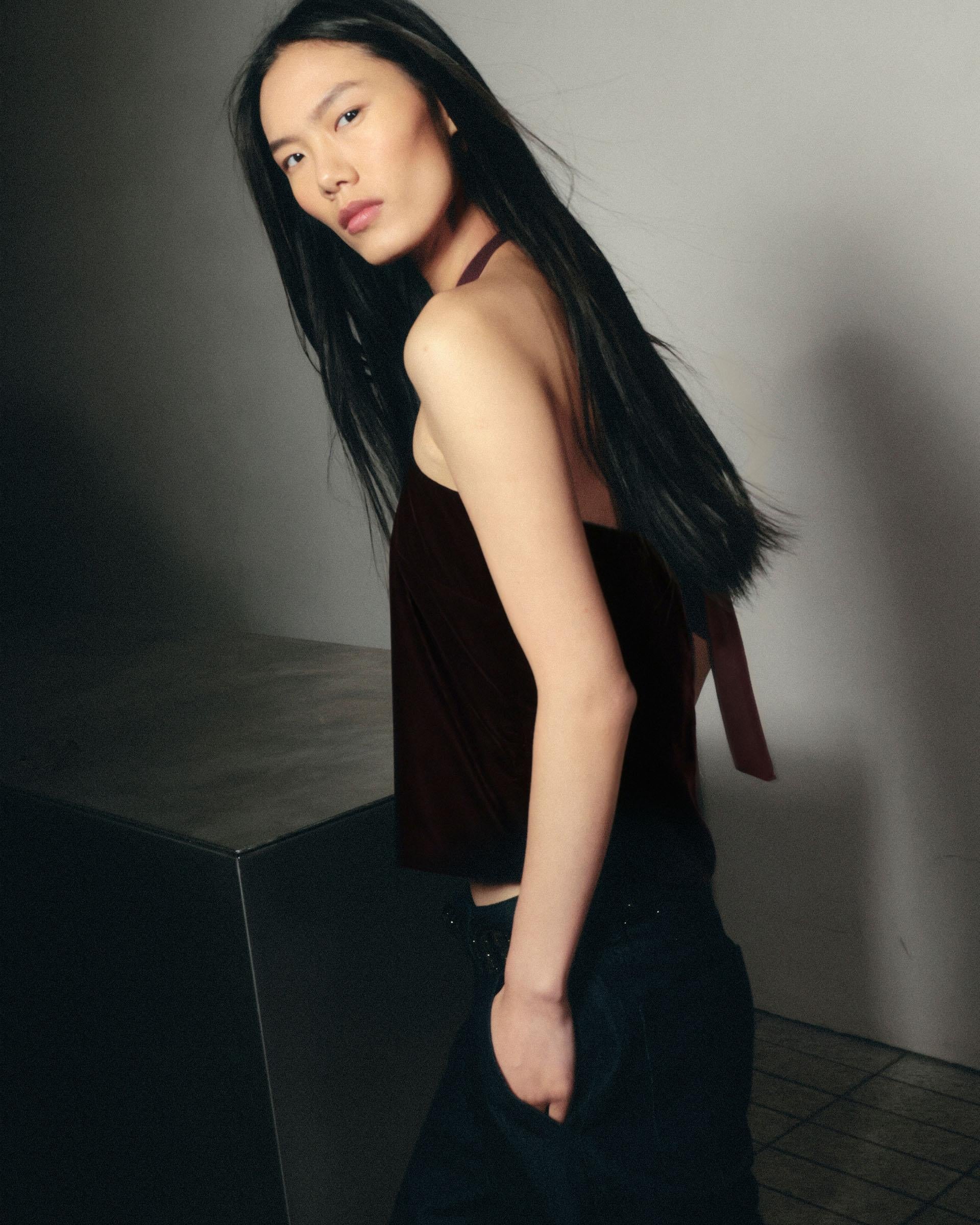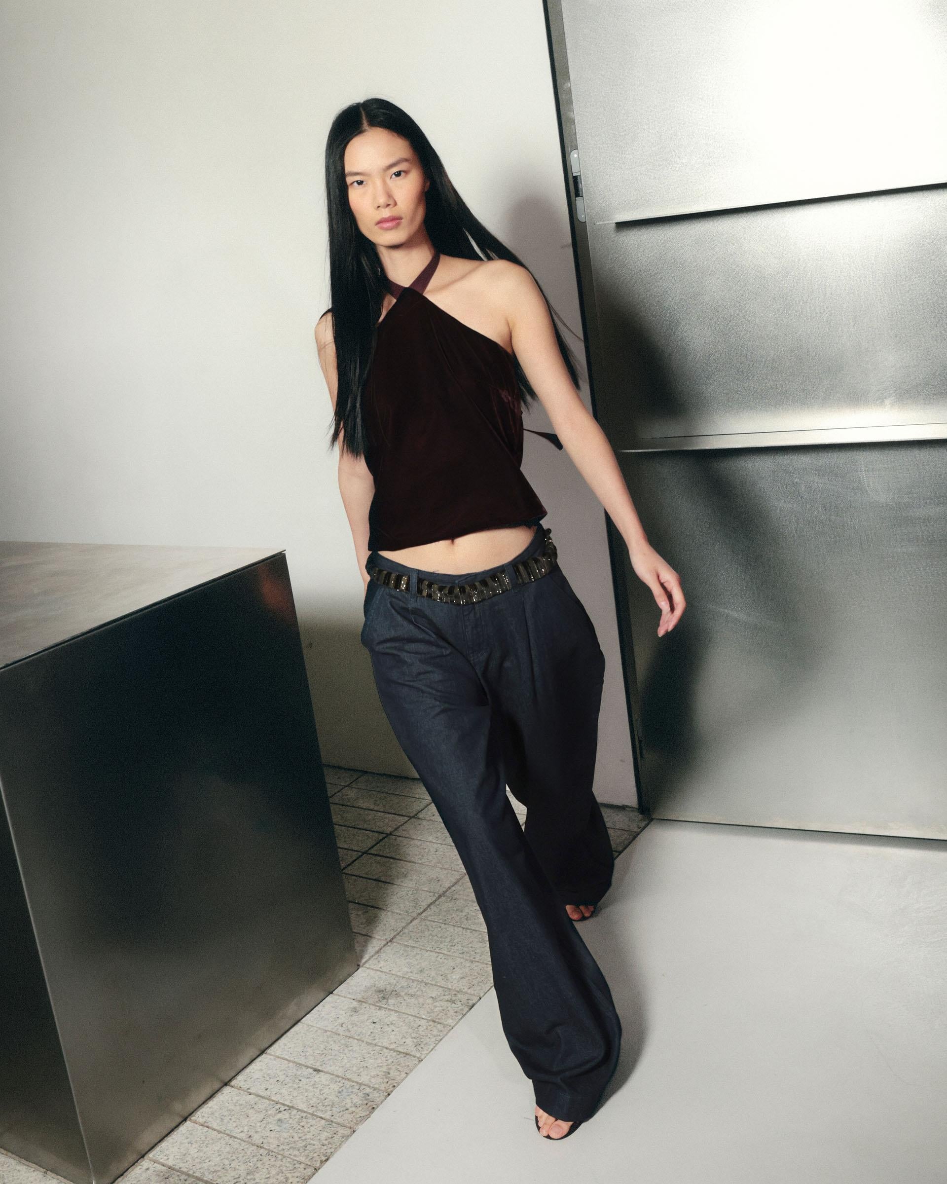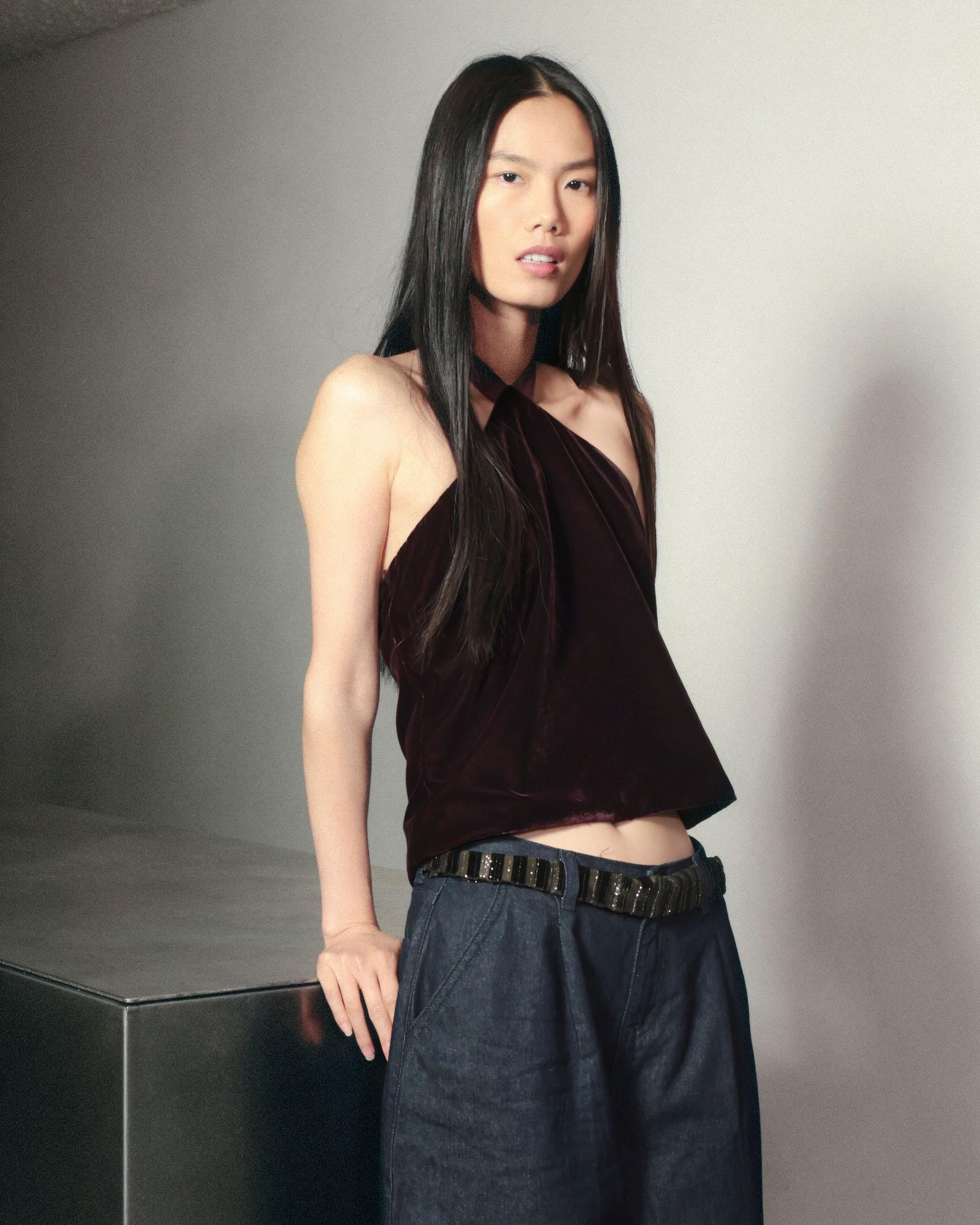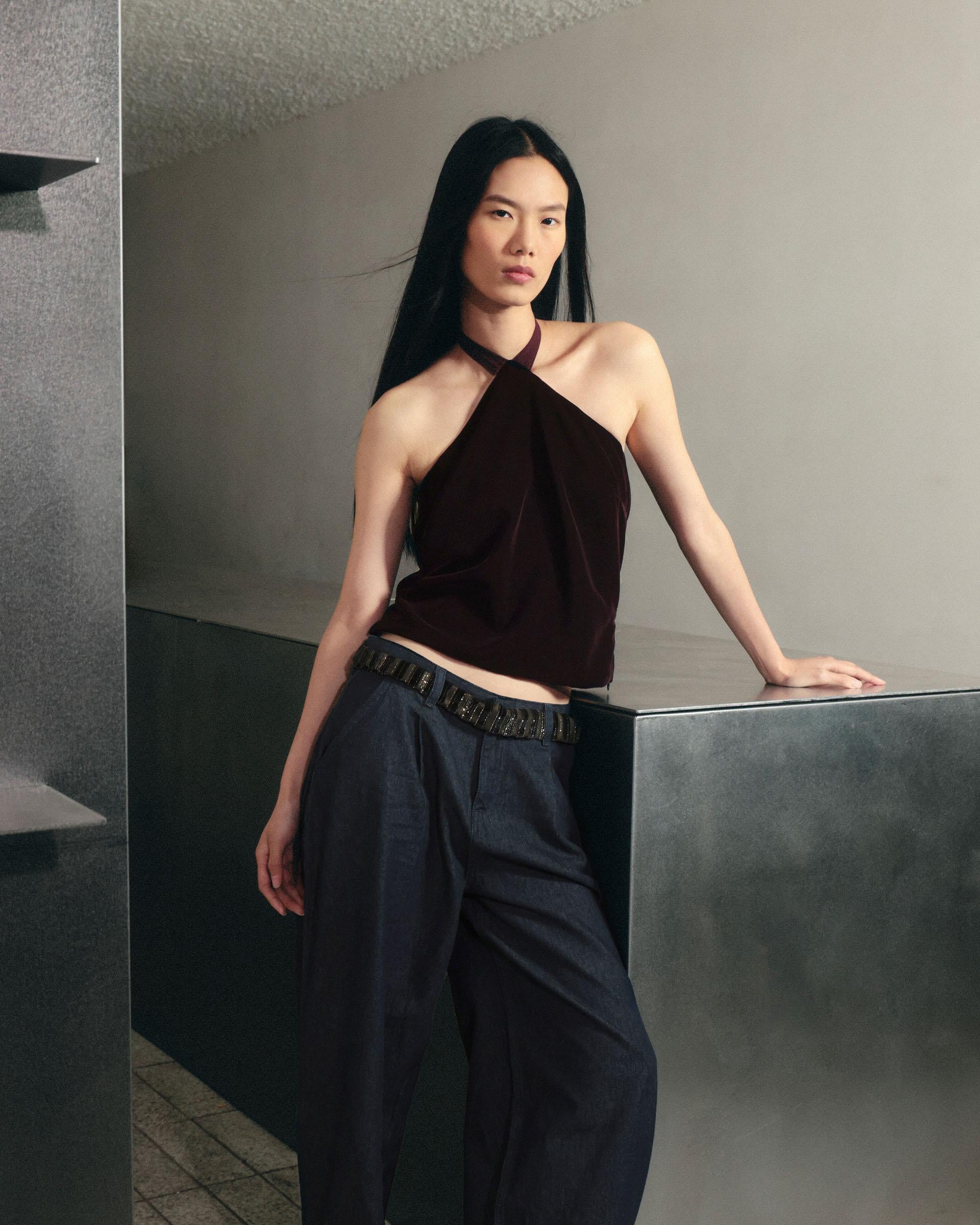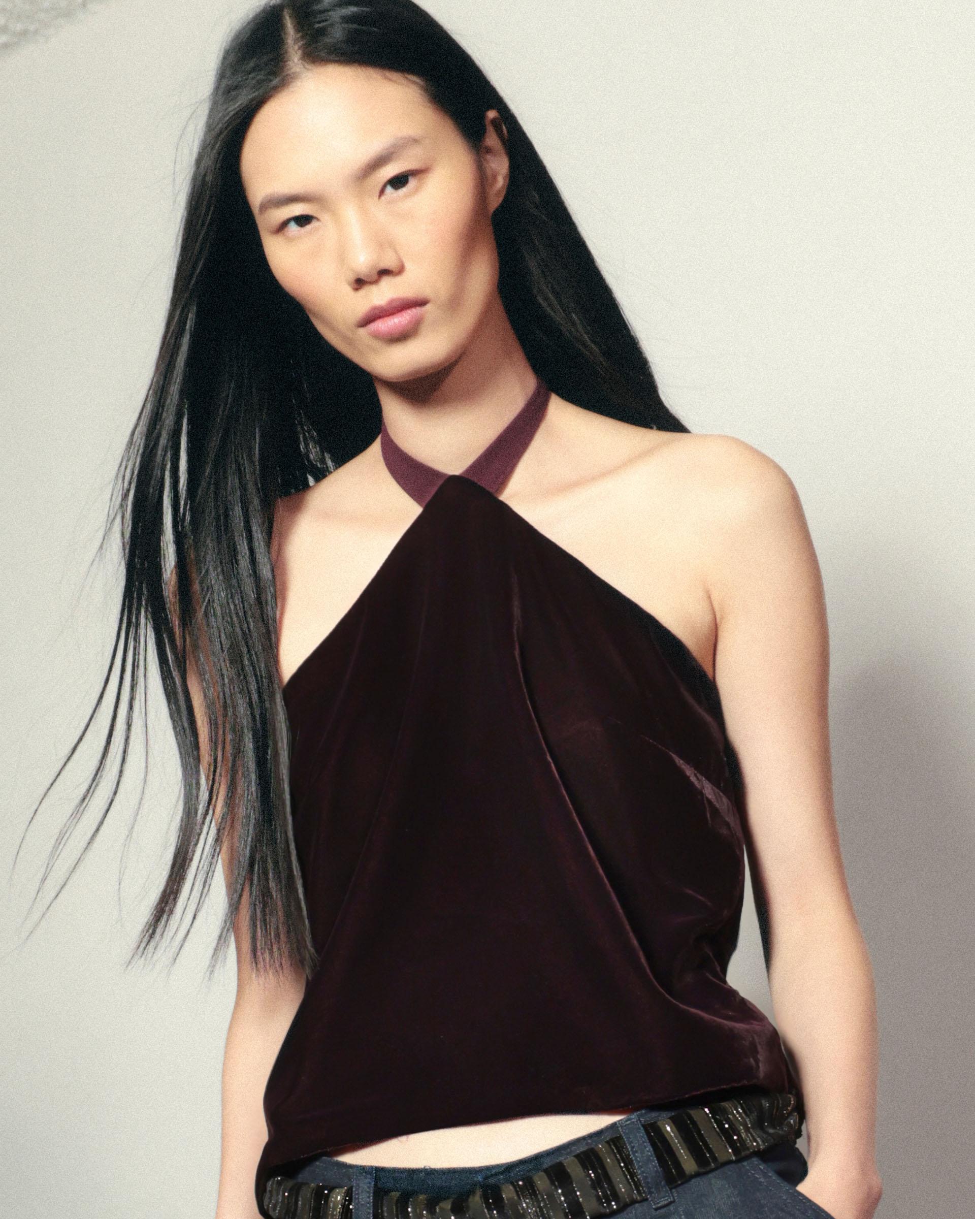 Top de terciopelo de color burdeos con escote halter con detalle de lazada al cuello.