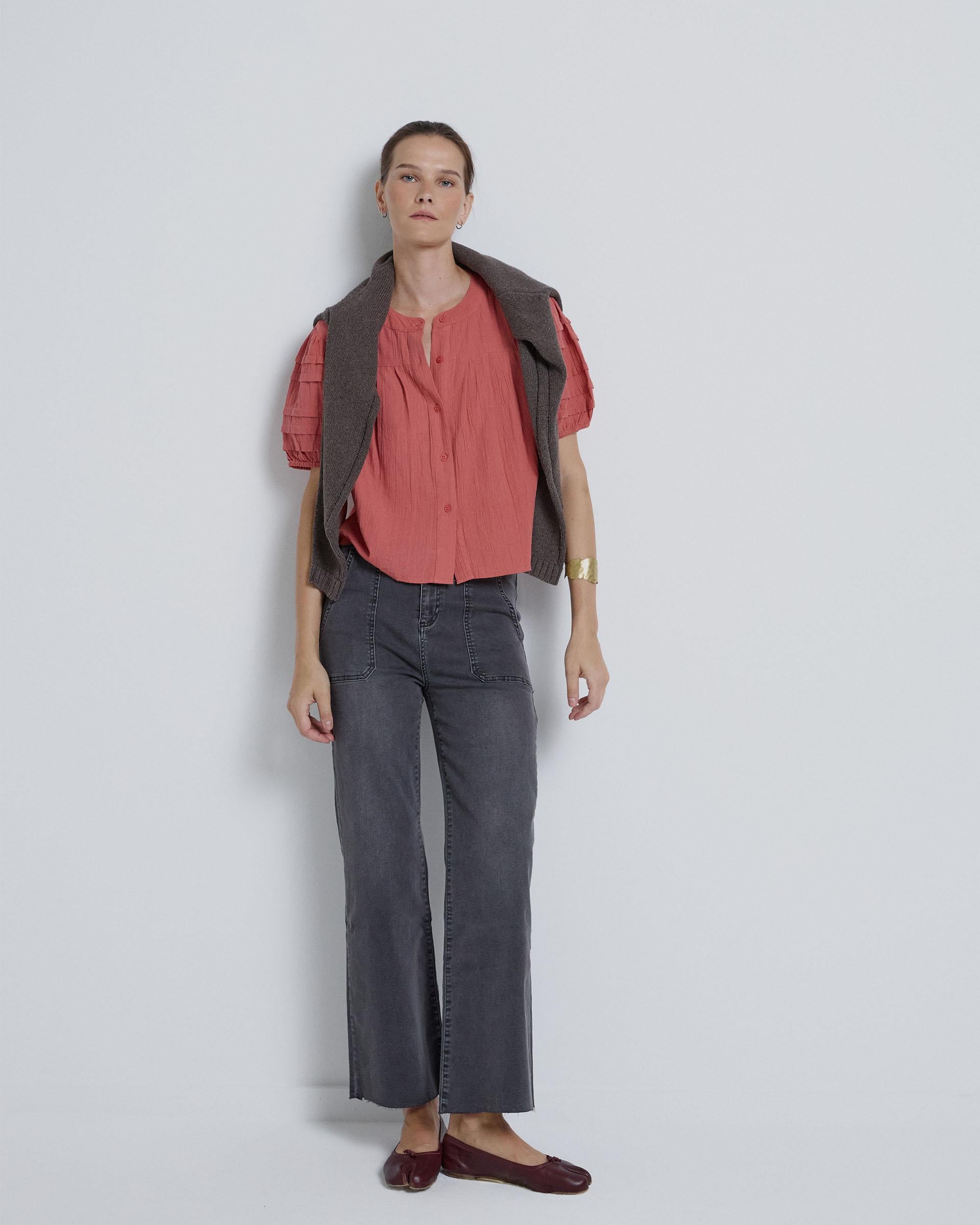 Blusa de manga corta y abullonada con botones traseros.
