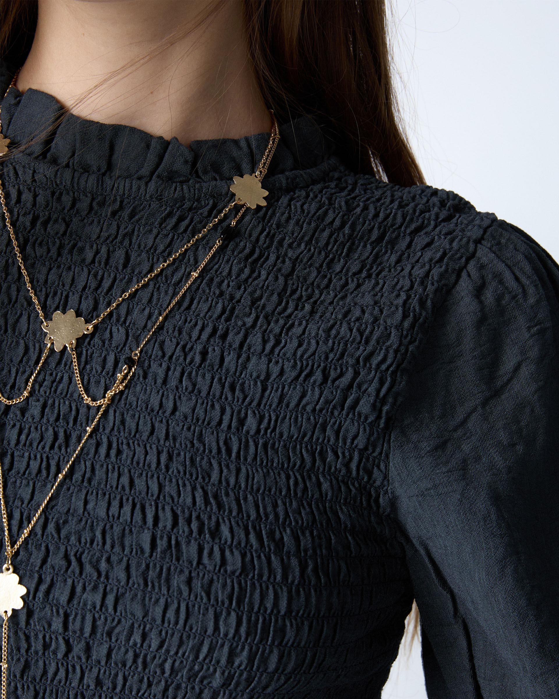 Blusa de manga larga en color gris con nido de abeja y detalle de volante en cuello.