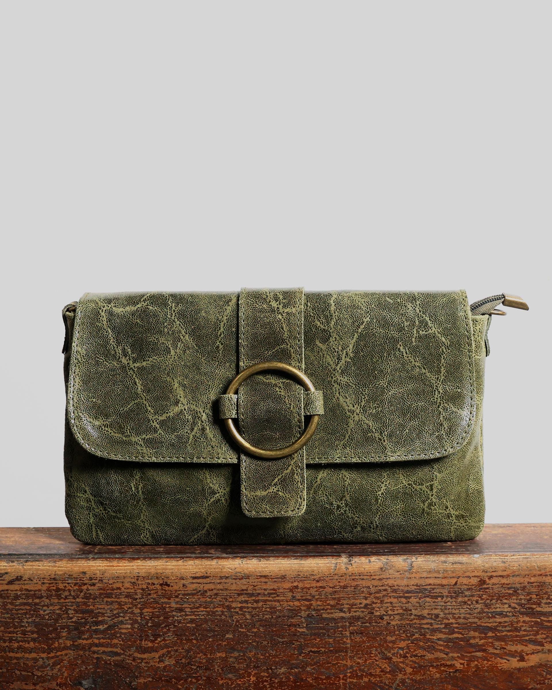 Bolso pequeño tipo sobre, con hebilla a modo de cierre y correa larga para colgar, de color verde.