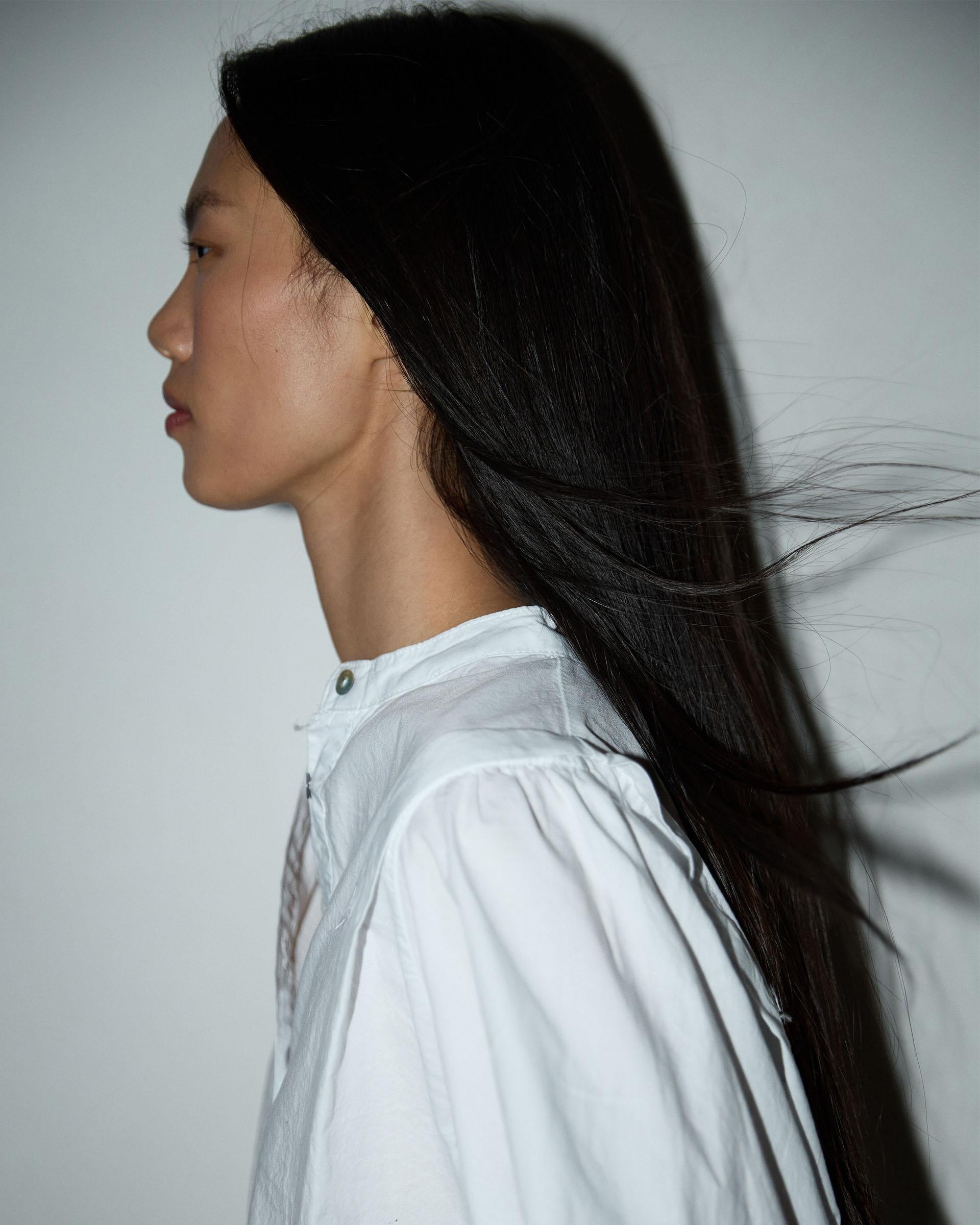 Camisa de color blanco con cuello mao, detalle de solapa en hombro y canesú en bajo.