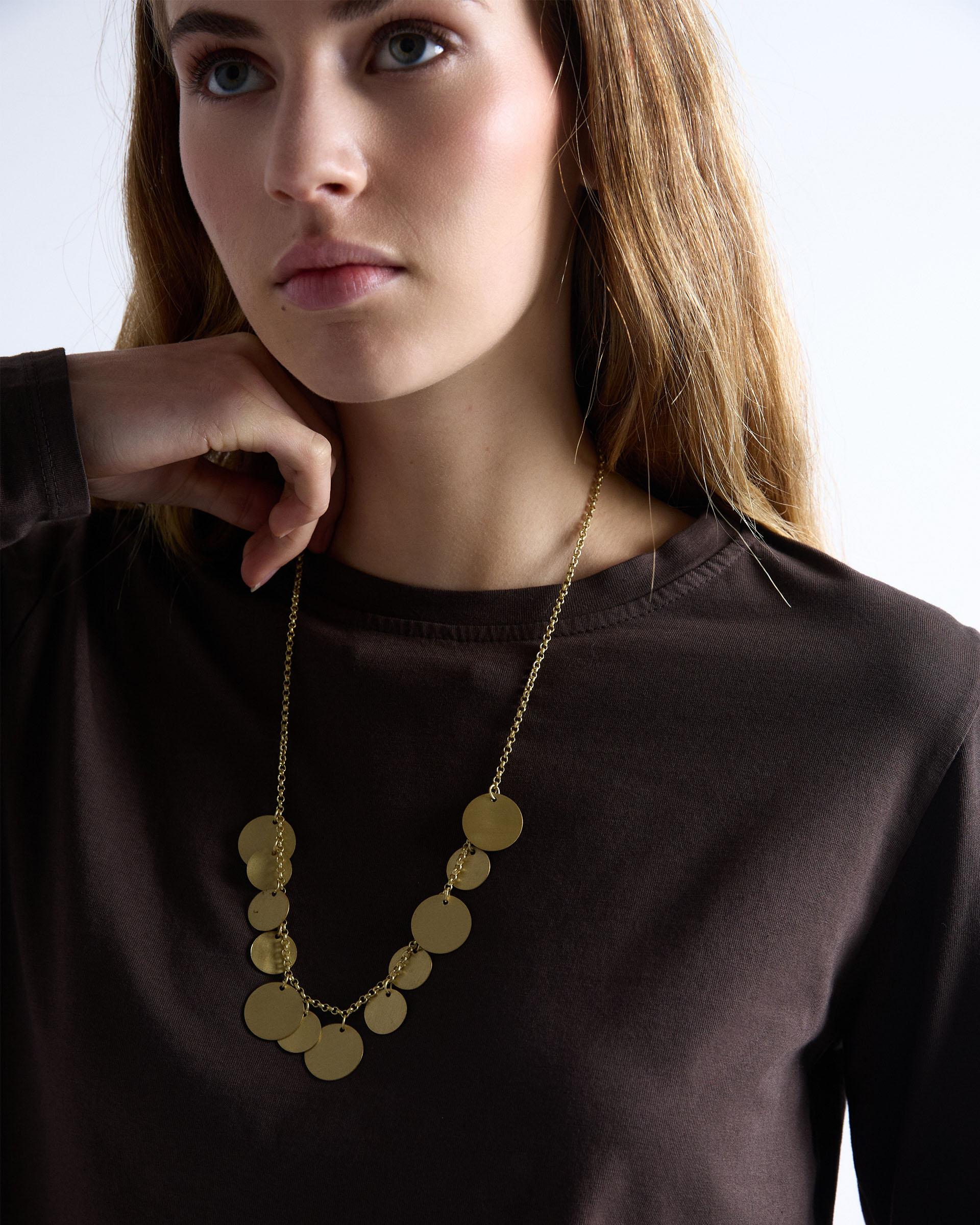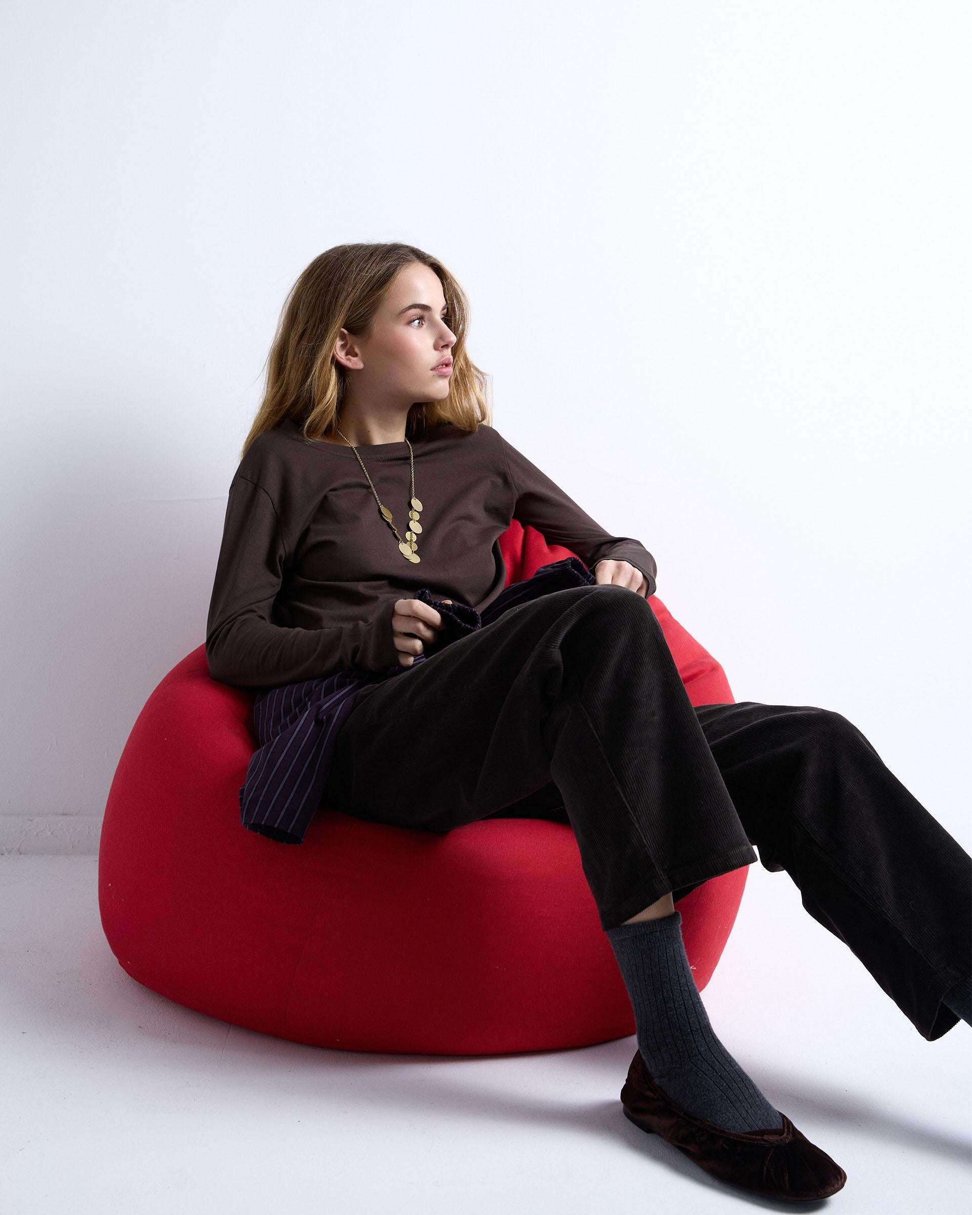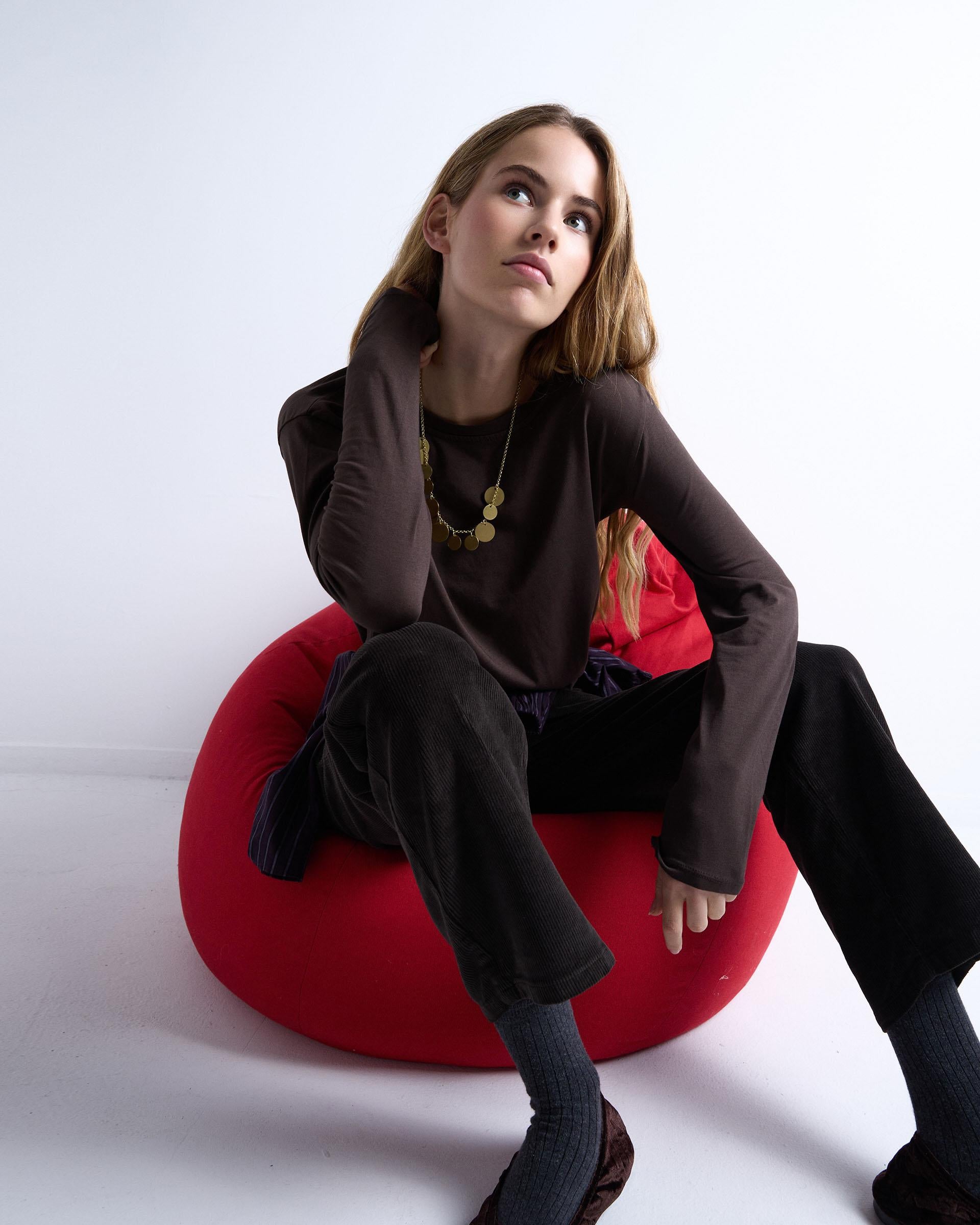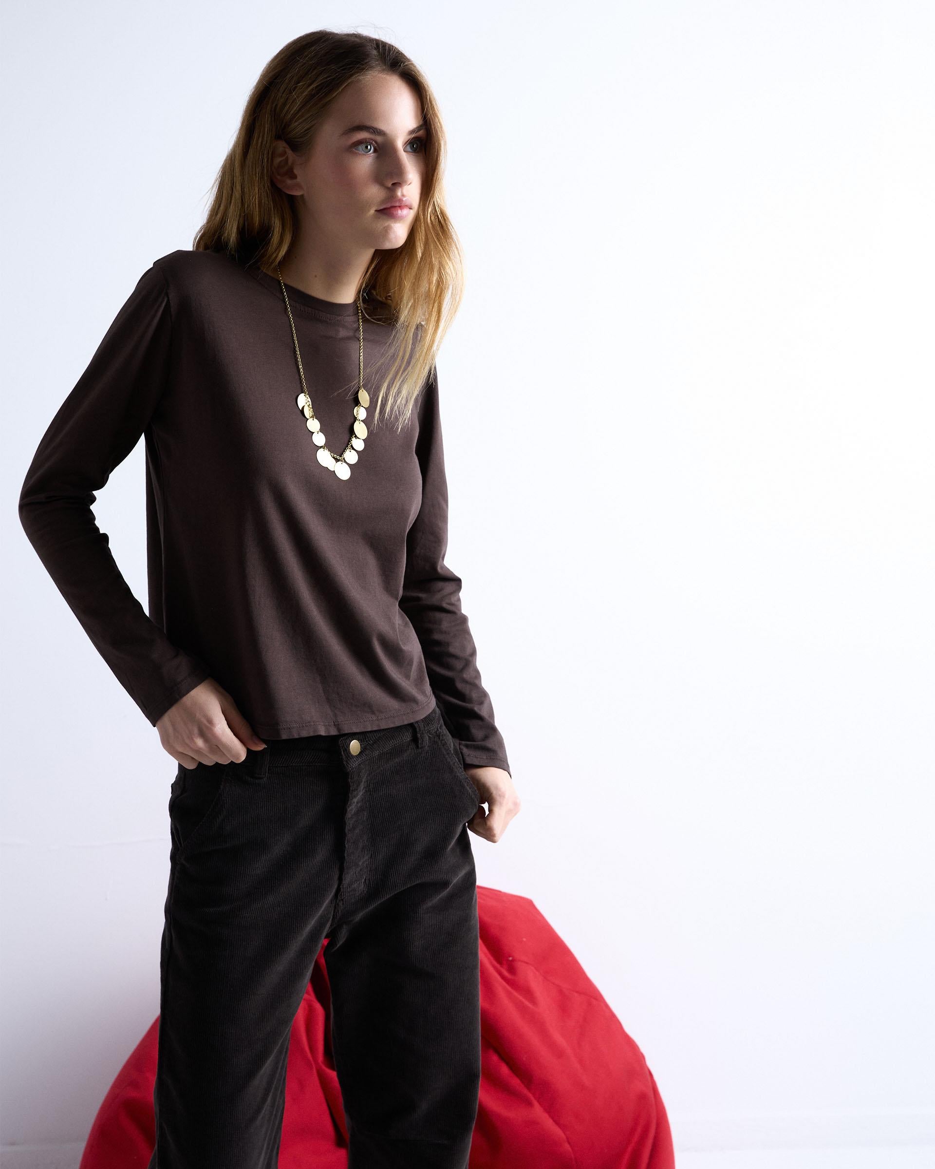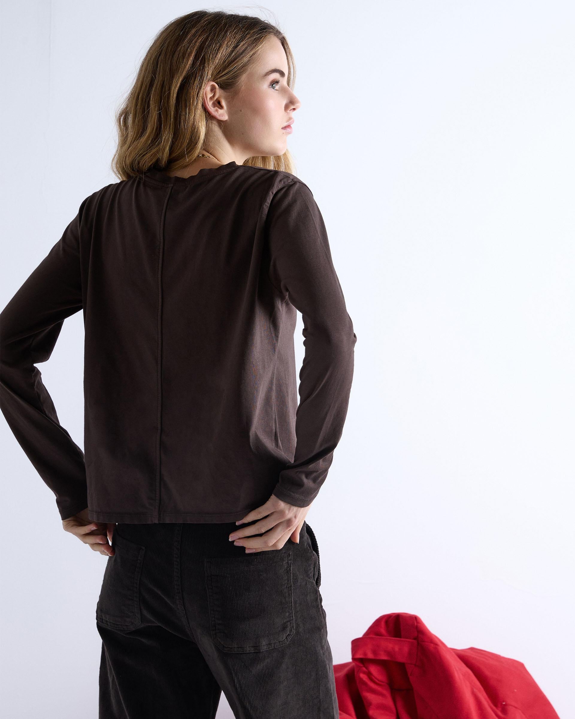 Camiseta básica de manga larga con cuello redondo, en color marrón.