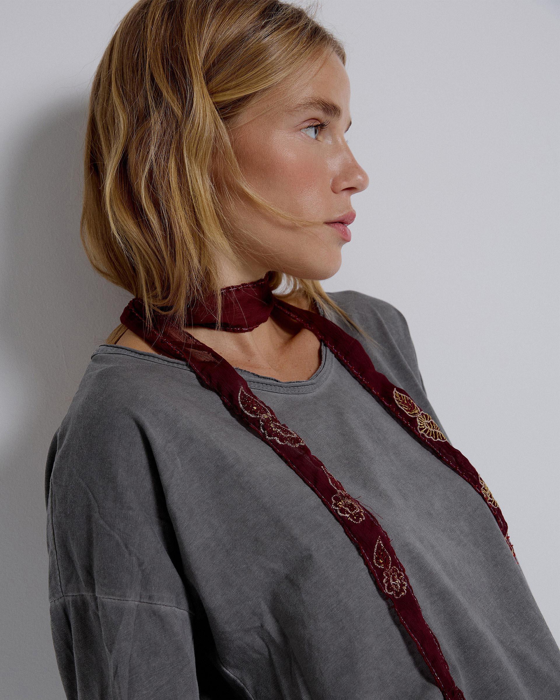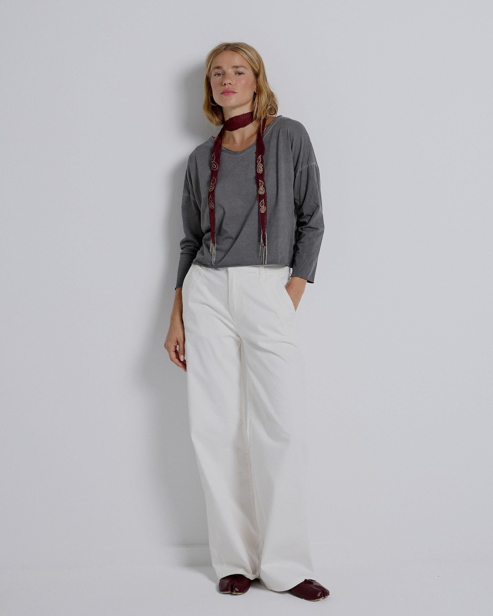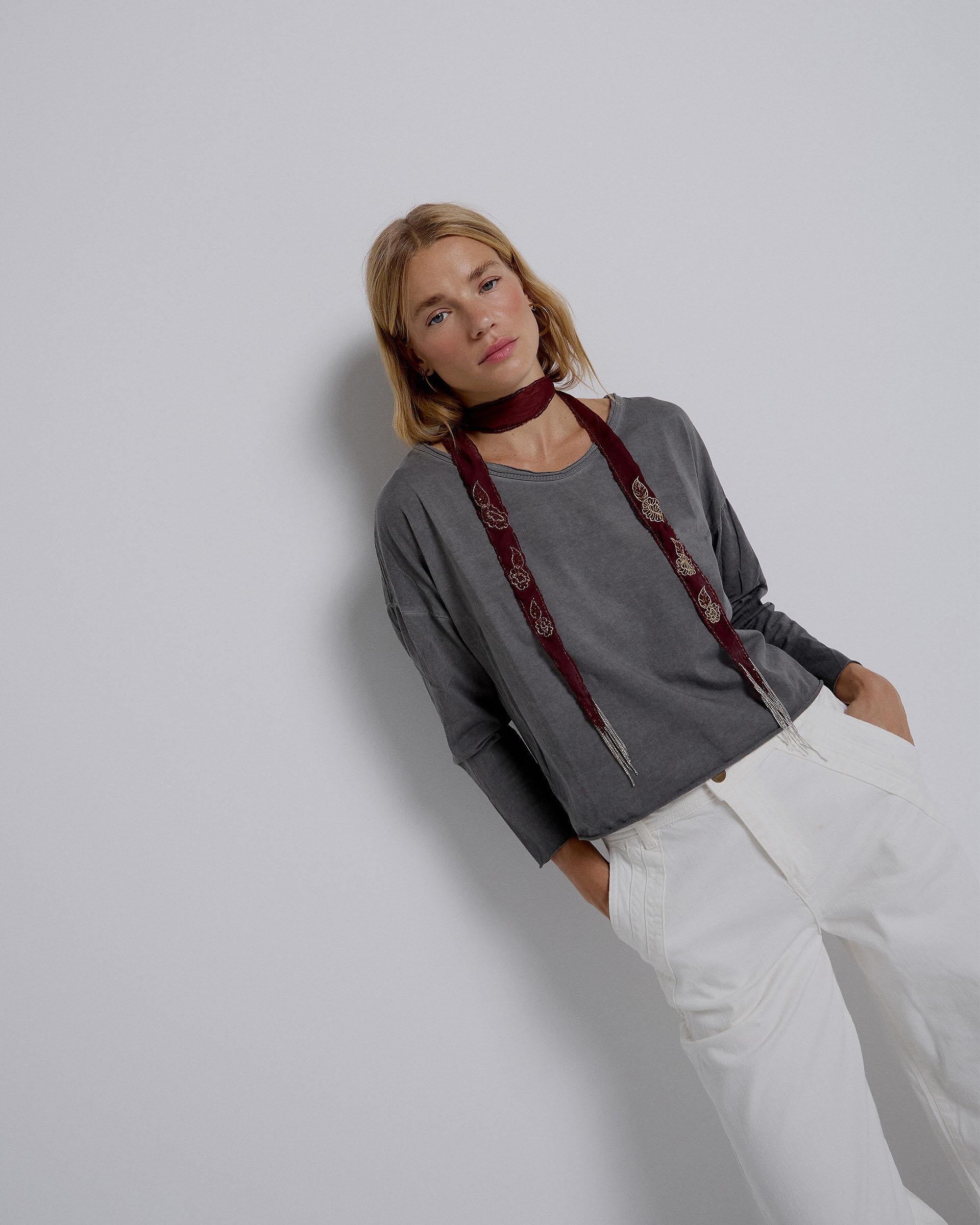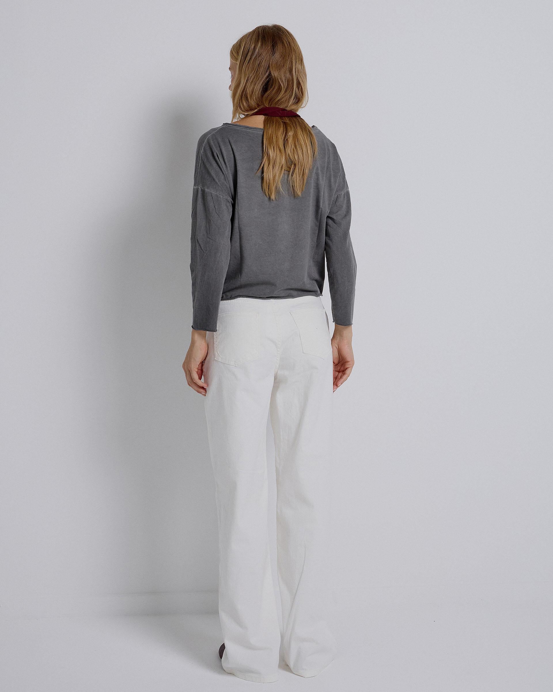 Camiseta básica de color antracita de manga larga con cuello pico.