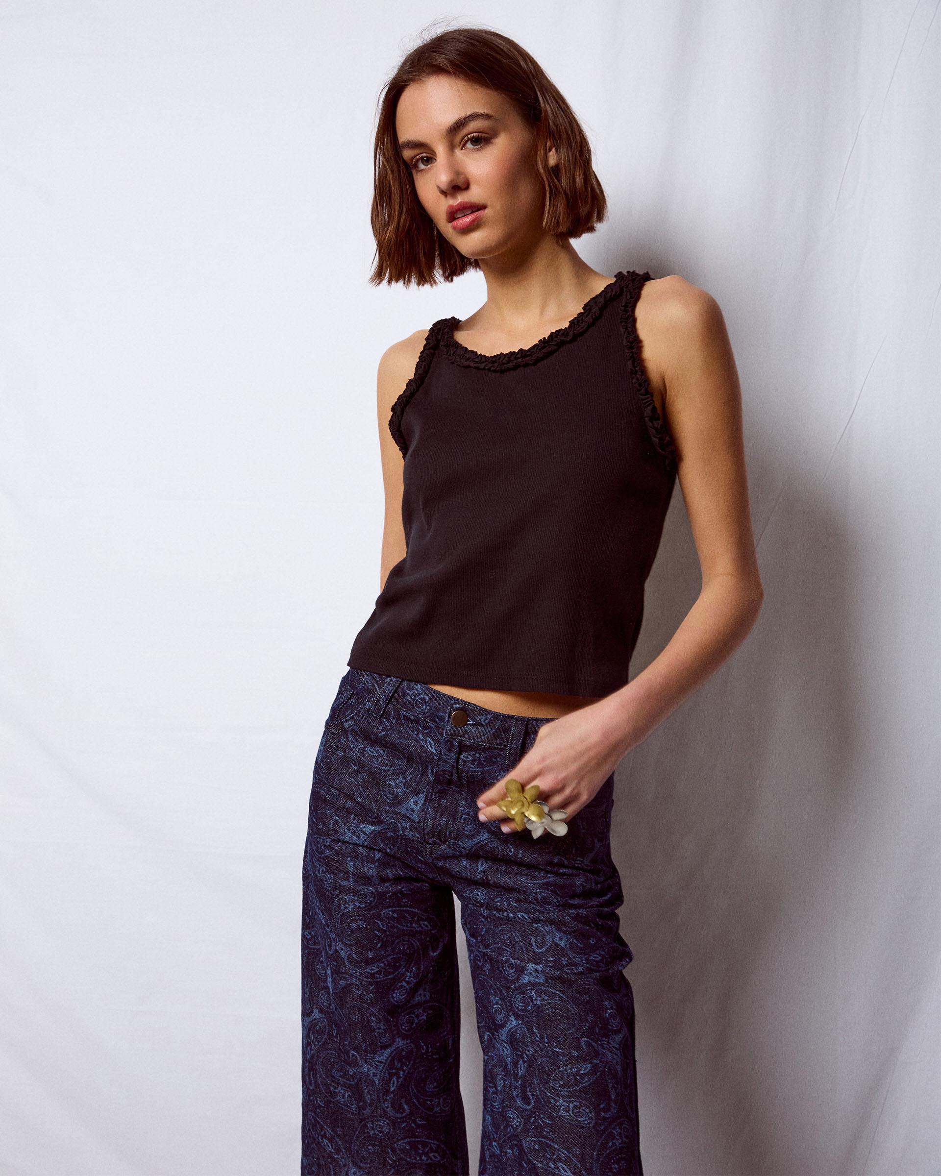 Camiseta tipo tank de color azul con volante en cuello y sisa.