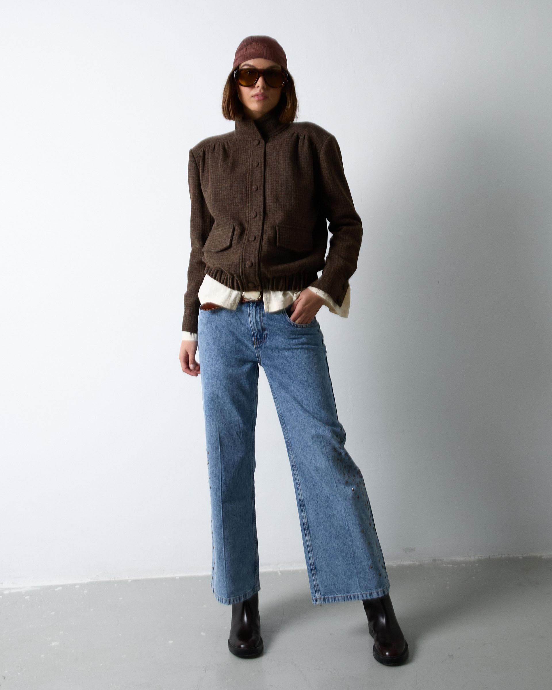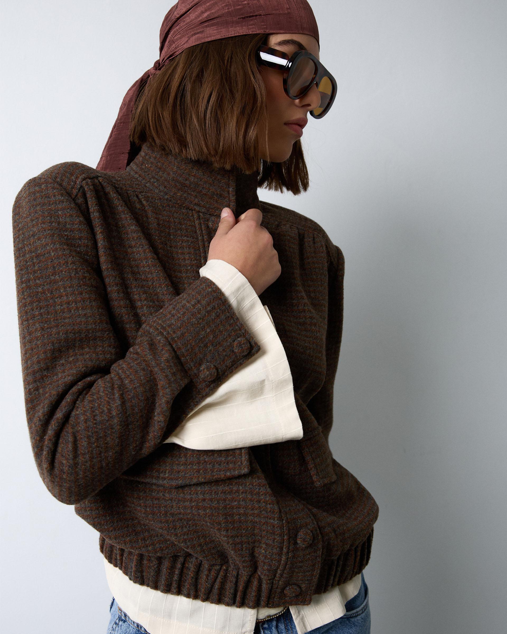 Chaqueta tipo bomber con botones forrados, bolsillos y goma en bajo, de cuadros en tonos marrones con lana.