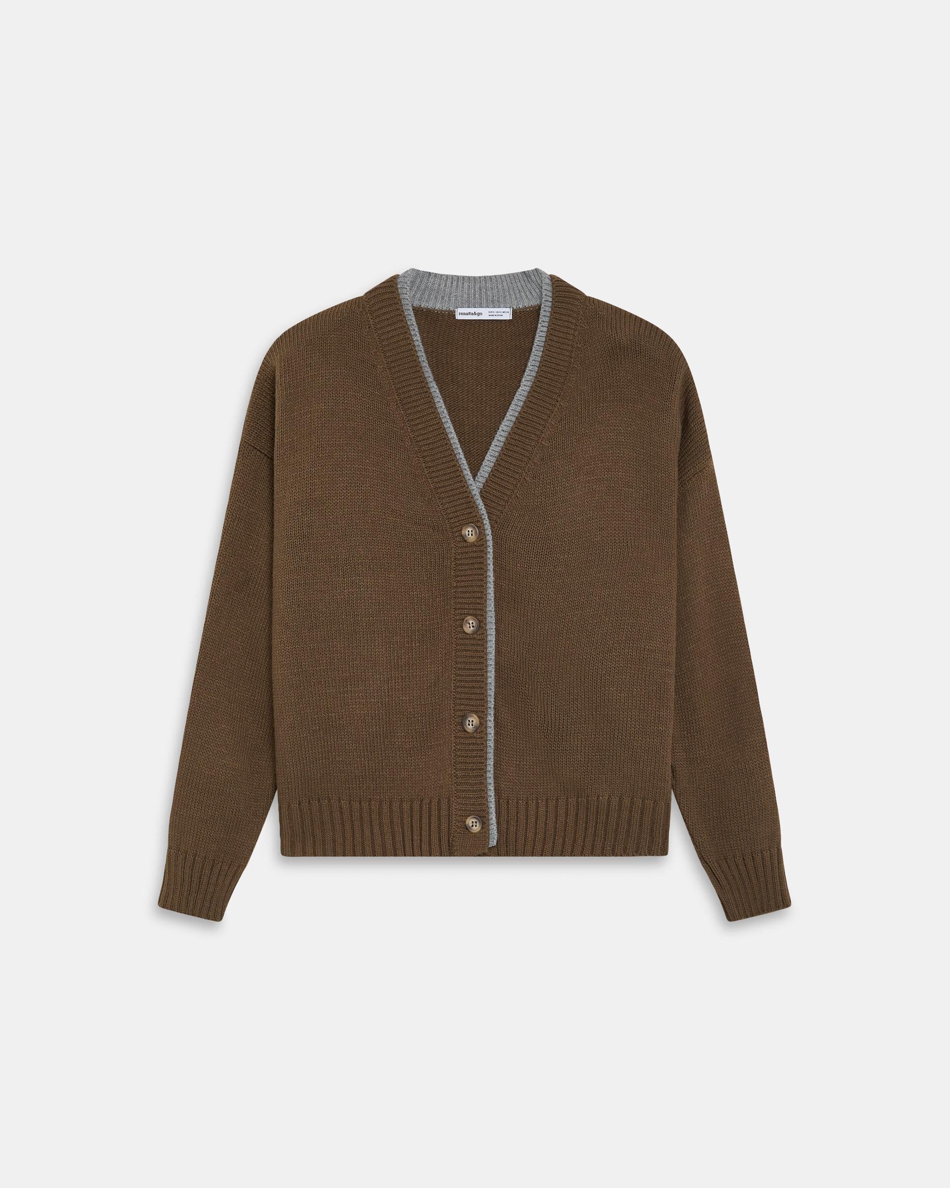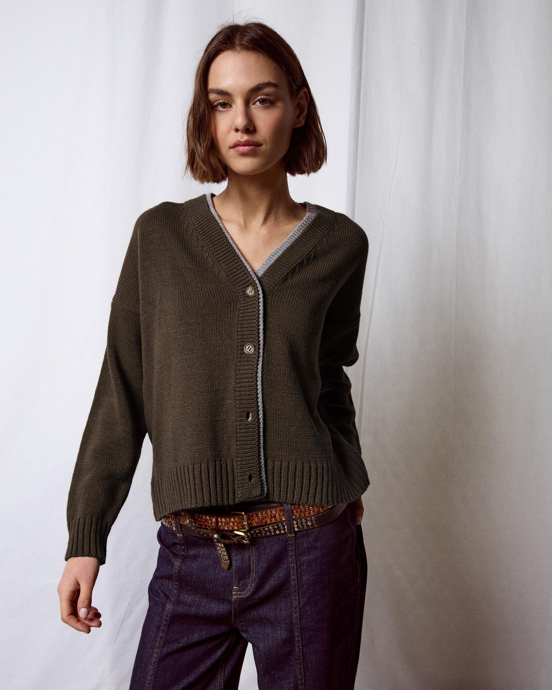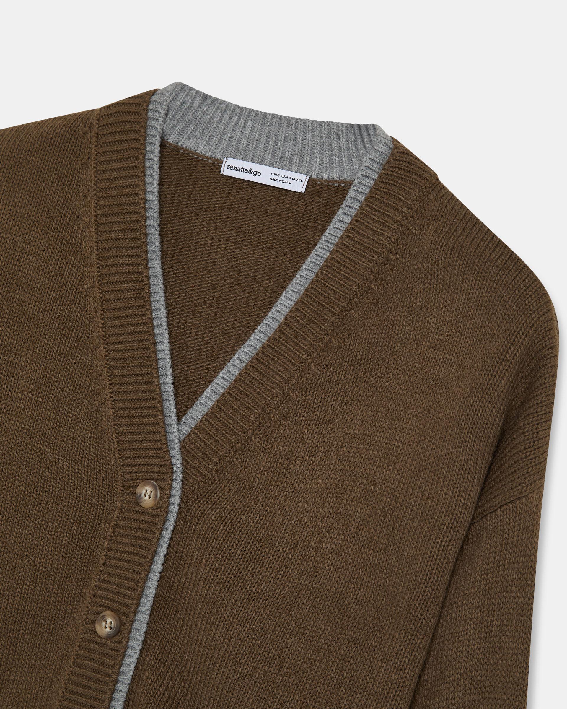 Chaqueta de punto en color kaki con detalle de contraste en gris, escote en pico y botones en delantero.