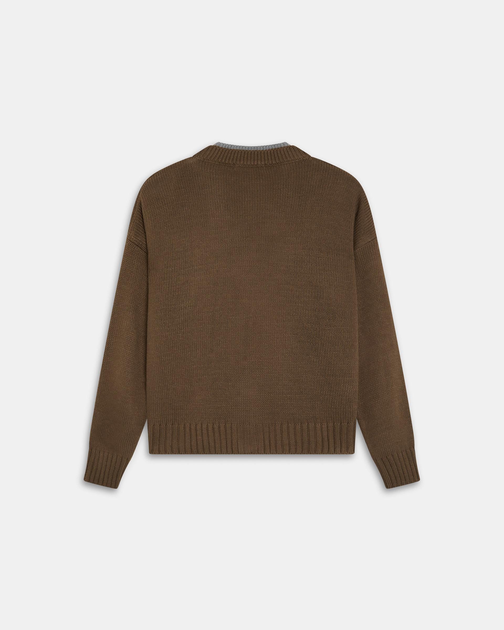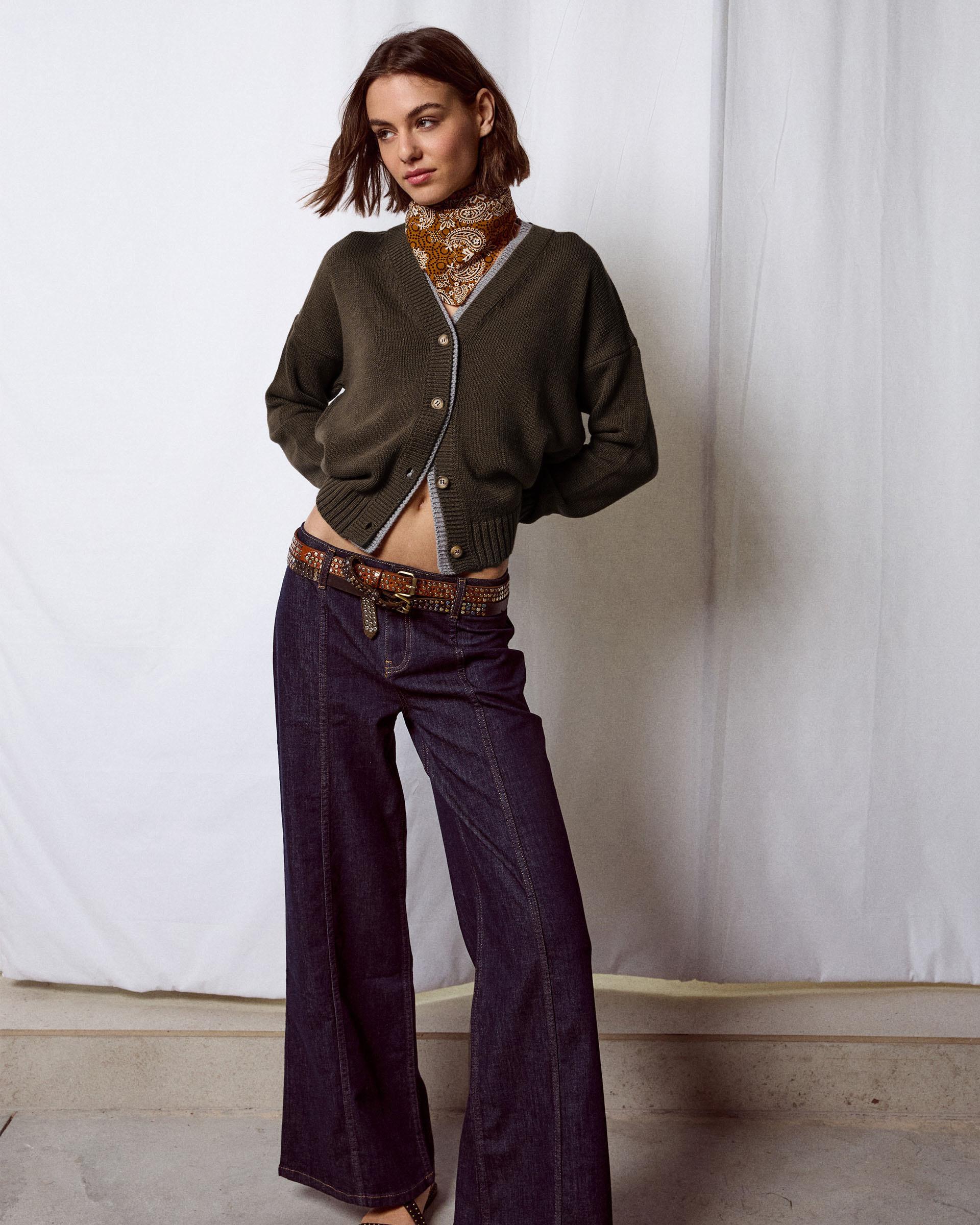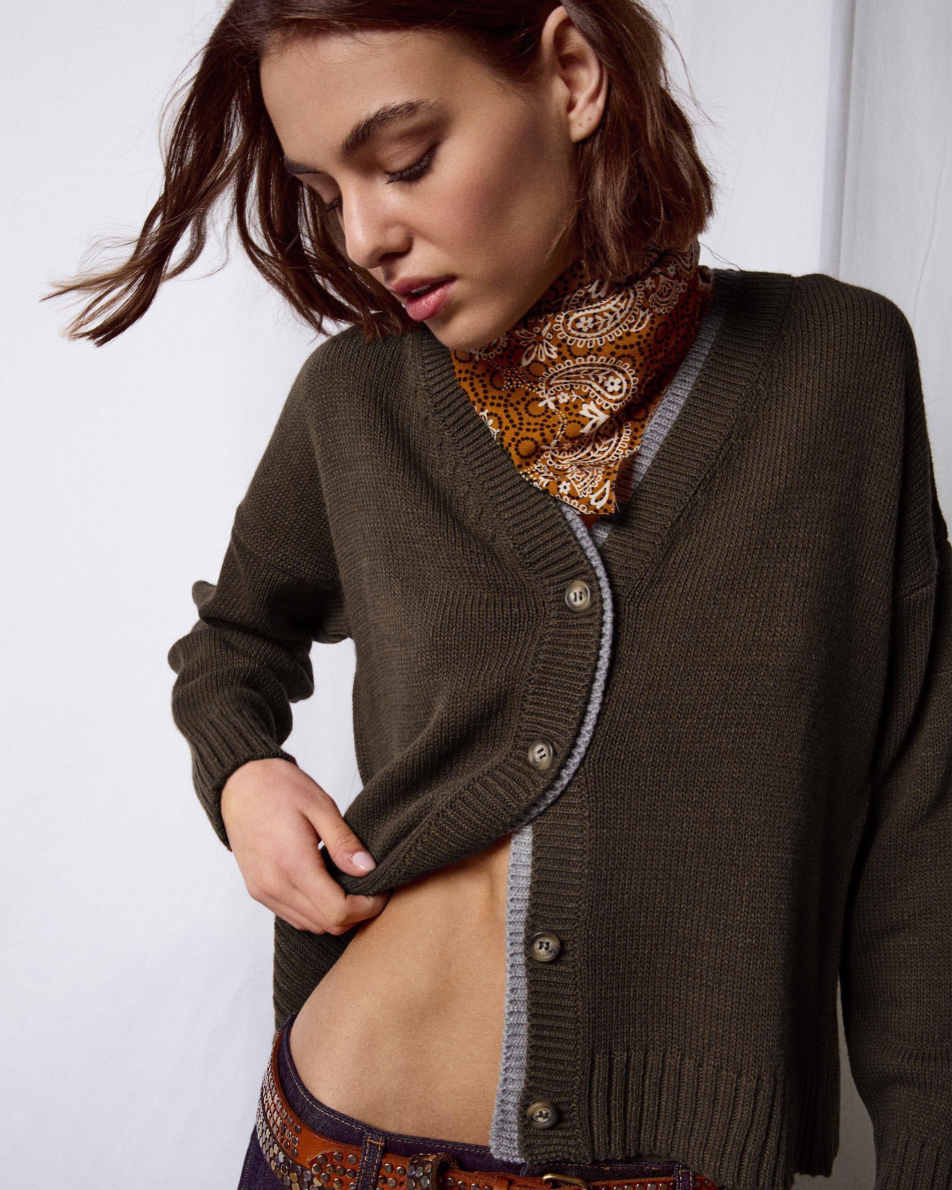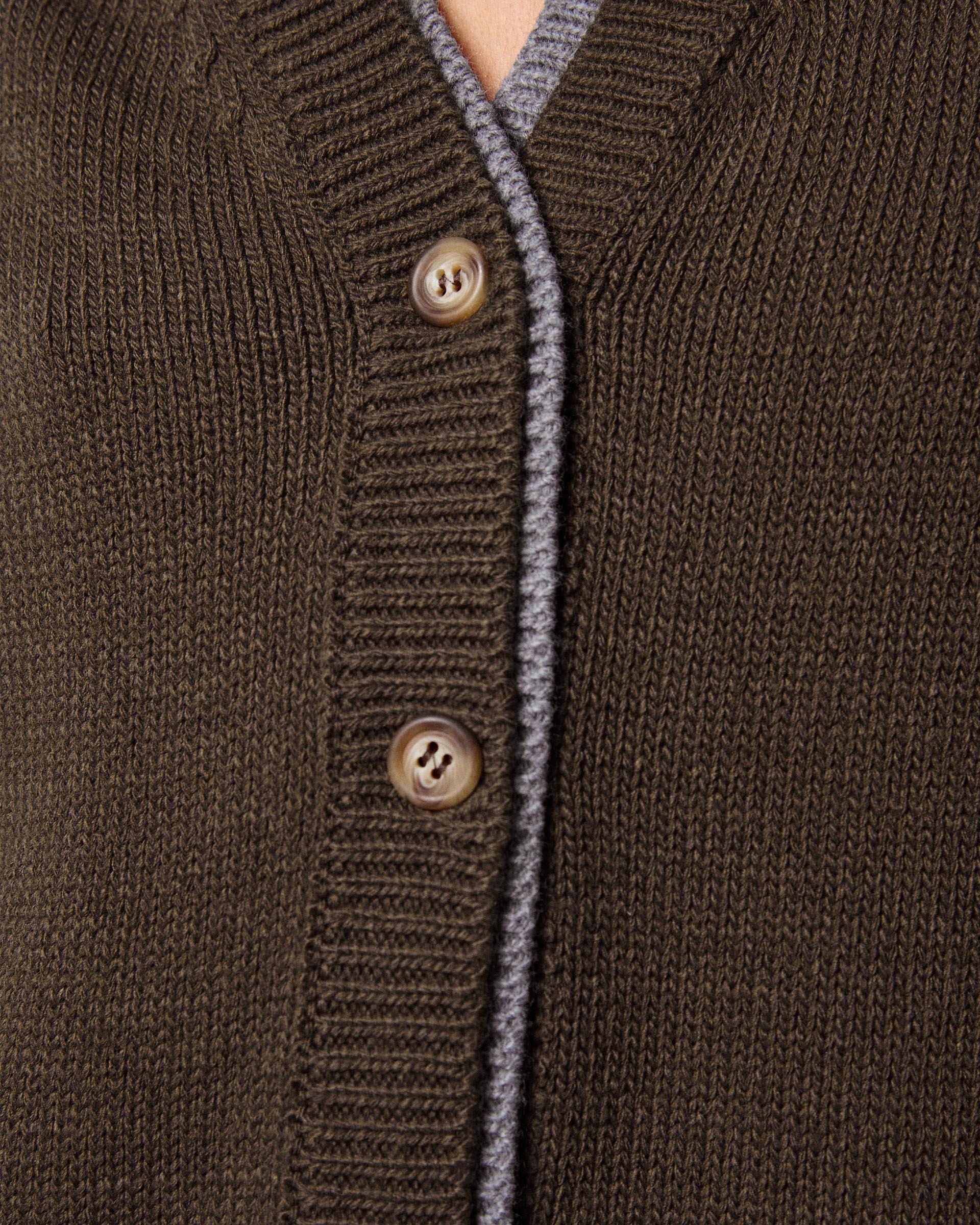 Chaqueta de punto en color kaki con detalle de contraste en gris, escote en pico y botones en delantero.