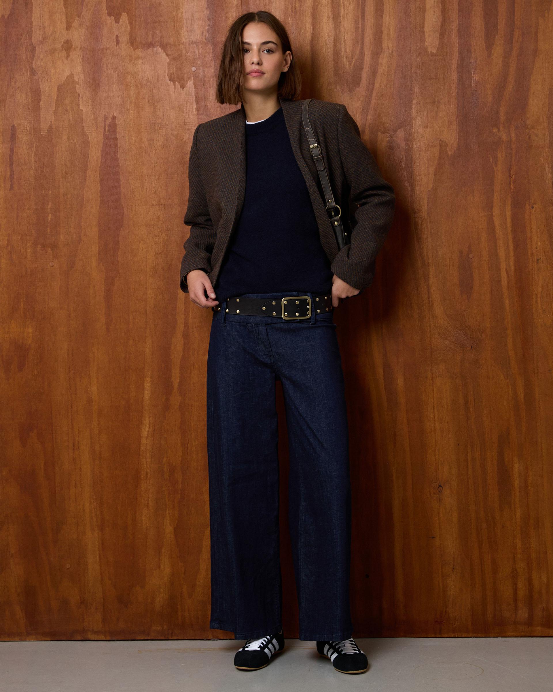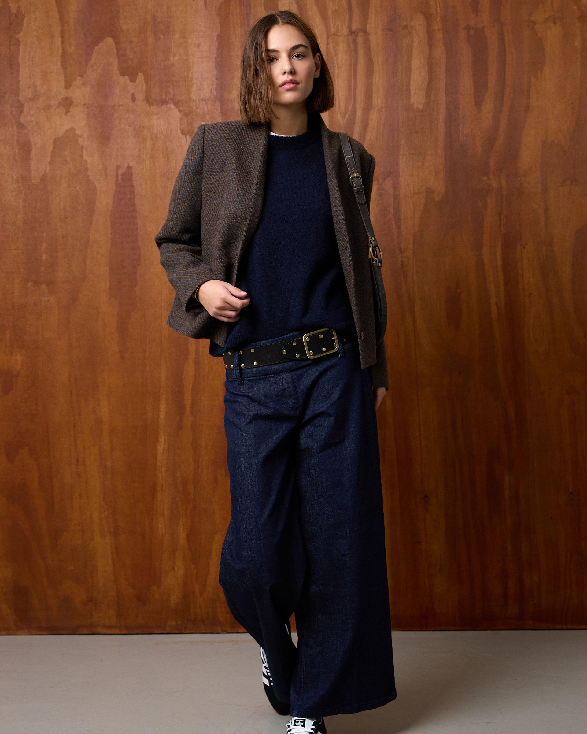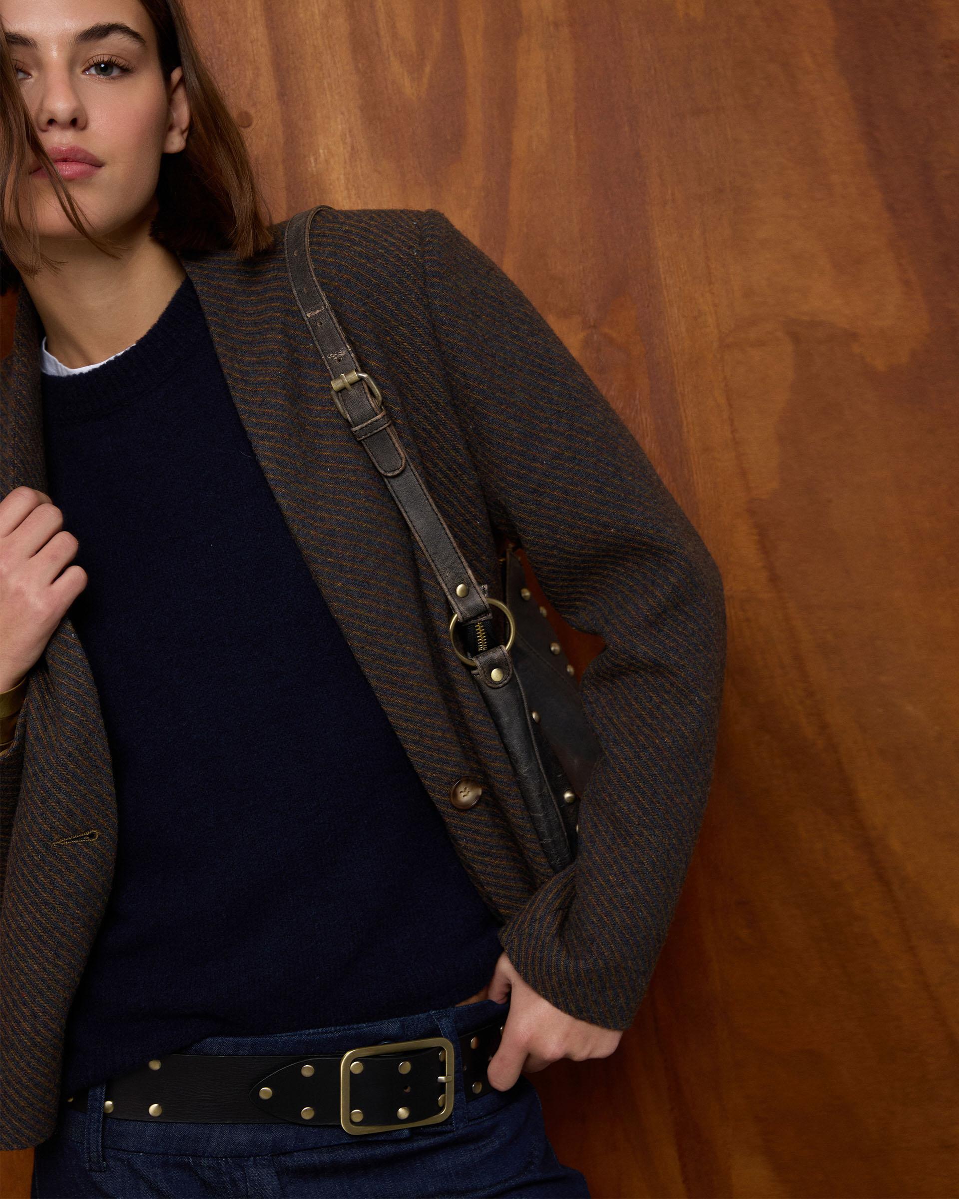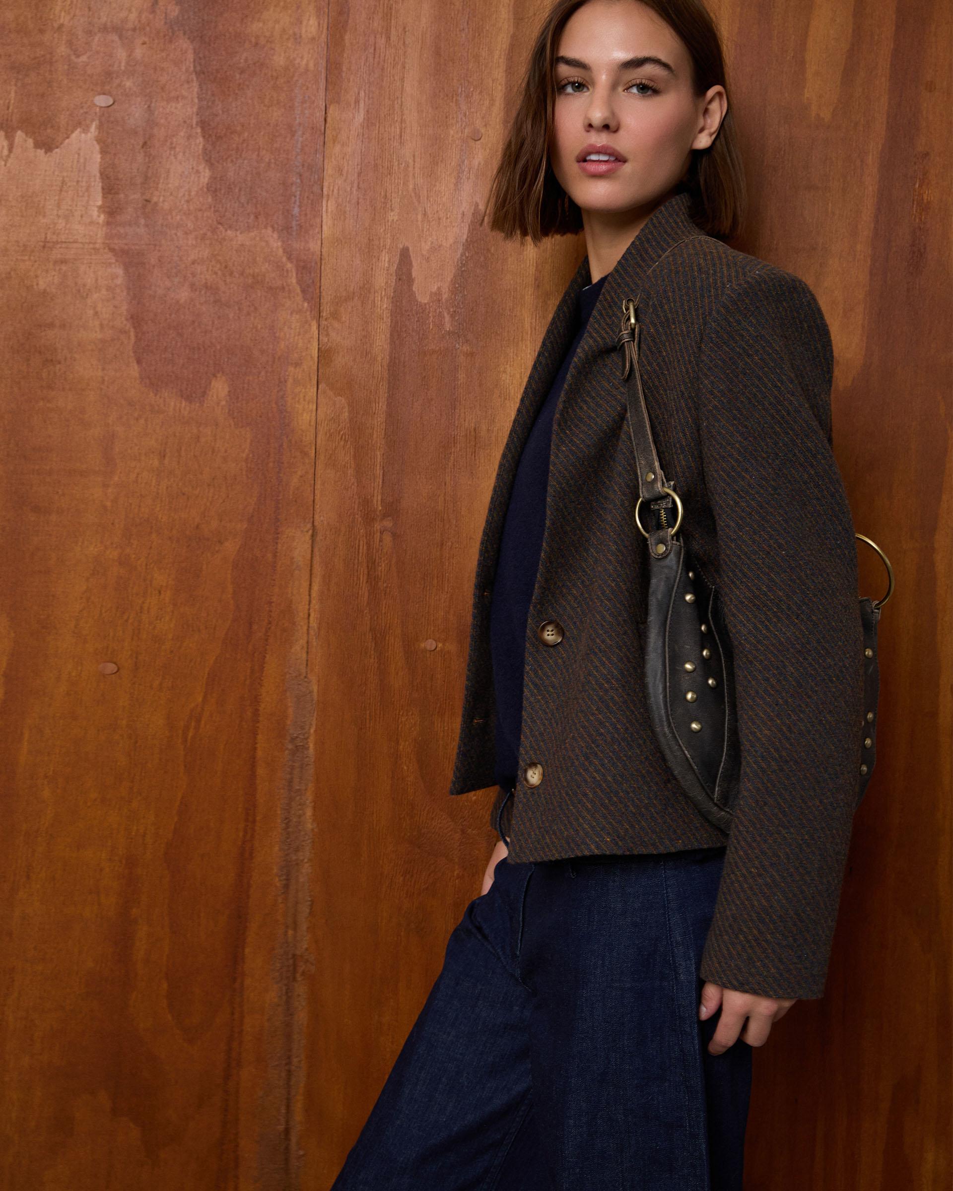 Chaqueta con botones en delantero, de rayas en tonos marrones y azules, escote V y cuello subido y mezcla de lana.