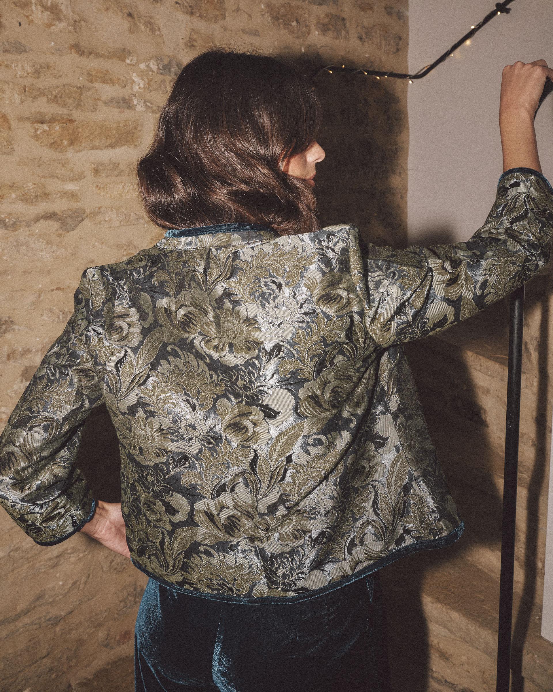 Chaqueta estilo blazer de jacquard estampado en verde agua, verde y azul, con ribete en terciopelo azul marino, cuello mao y cierre con botones invisibles.