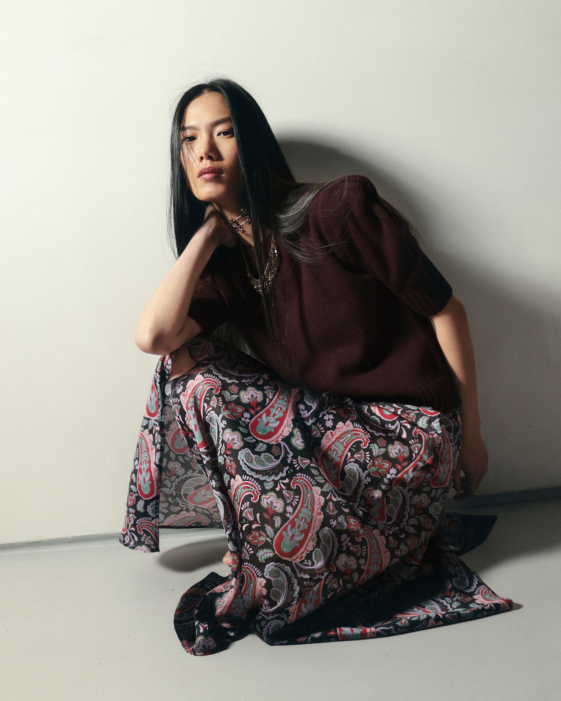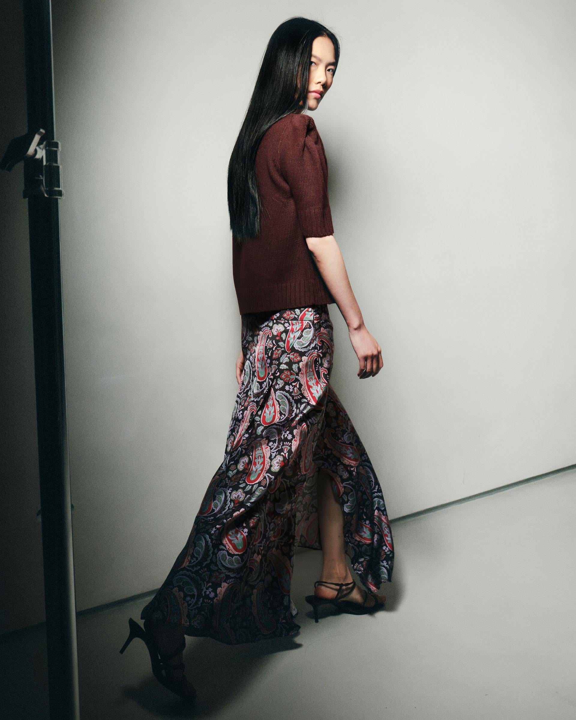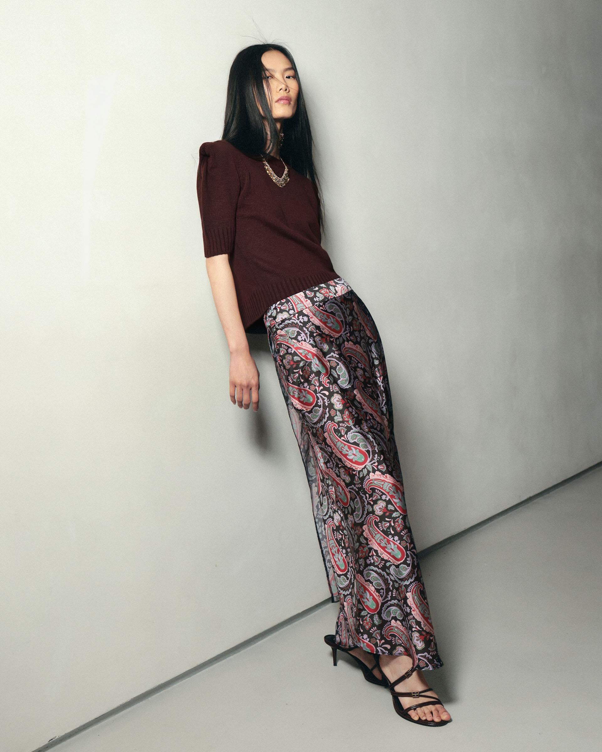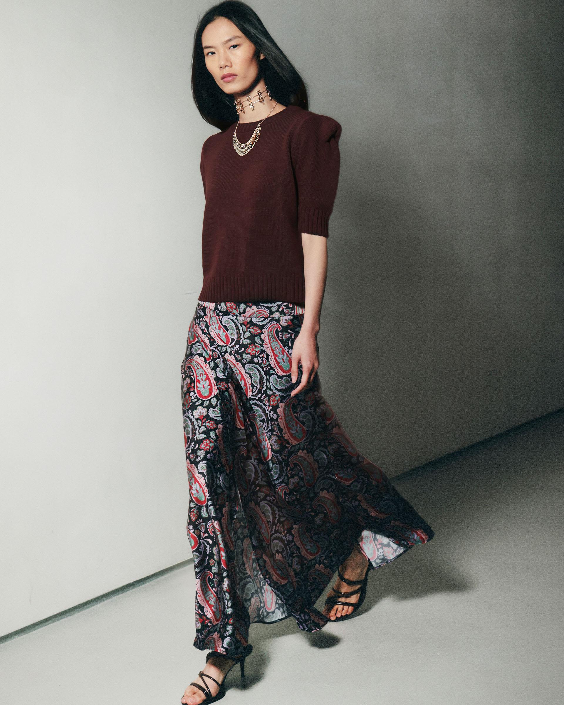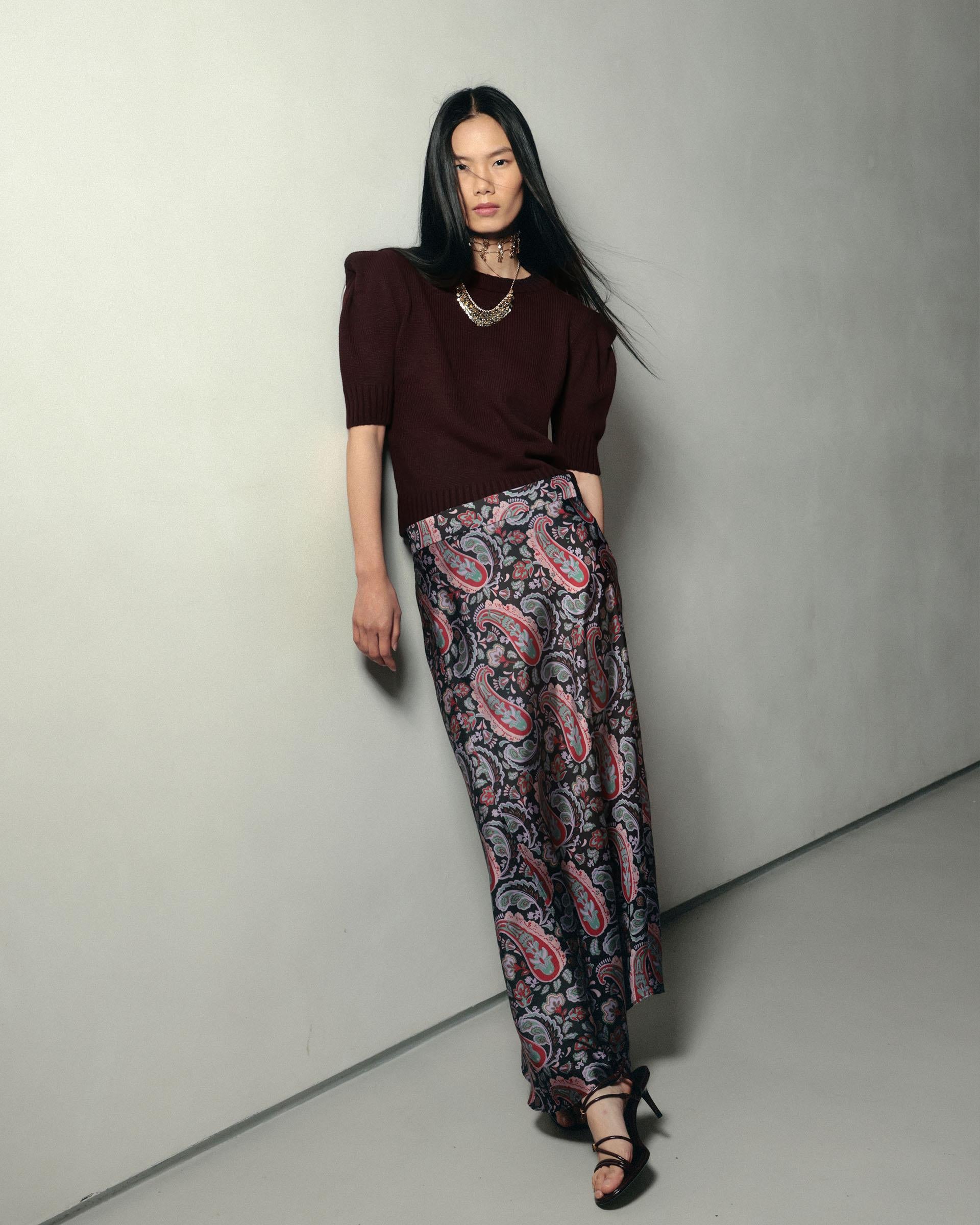 Falda larga con estampado de amebas de colores con detalle de capas y cierre con cremallera lateral.