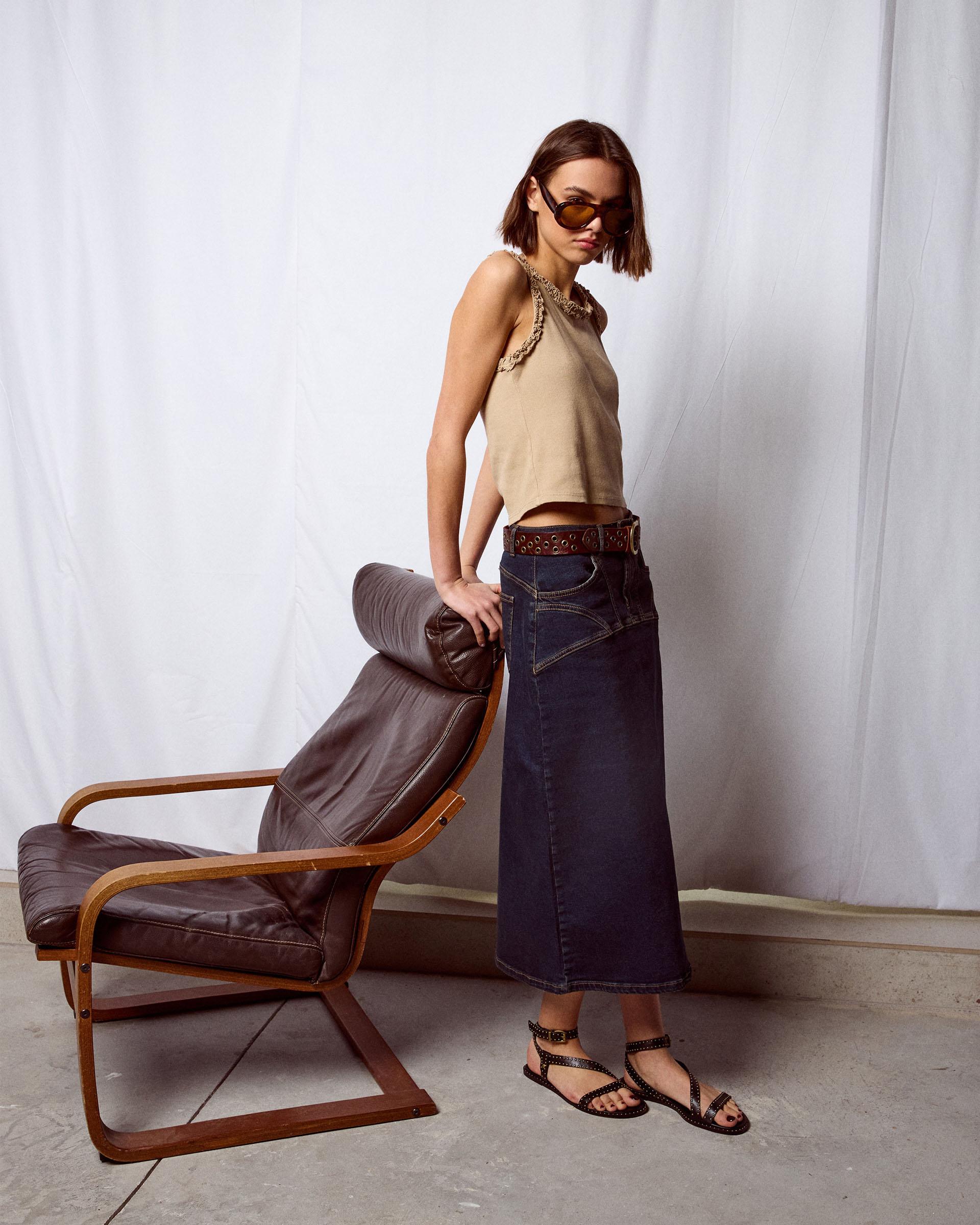 Falda tipo denim en color azul oscuro con detalle de costuras en delantero y cierre con cremallera y botón.