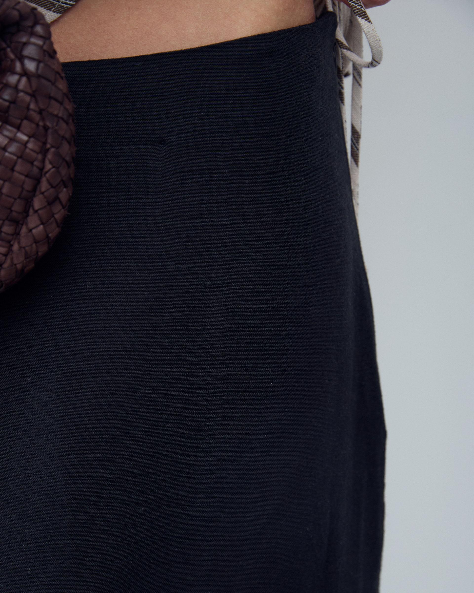 Falda larga fluida de color negro y cierre lateral con cremallera.