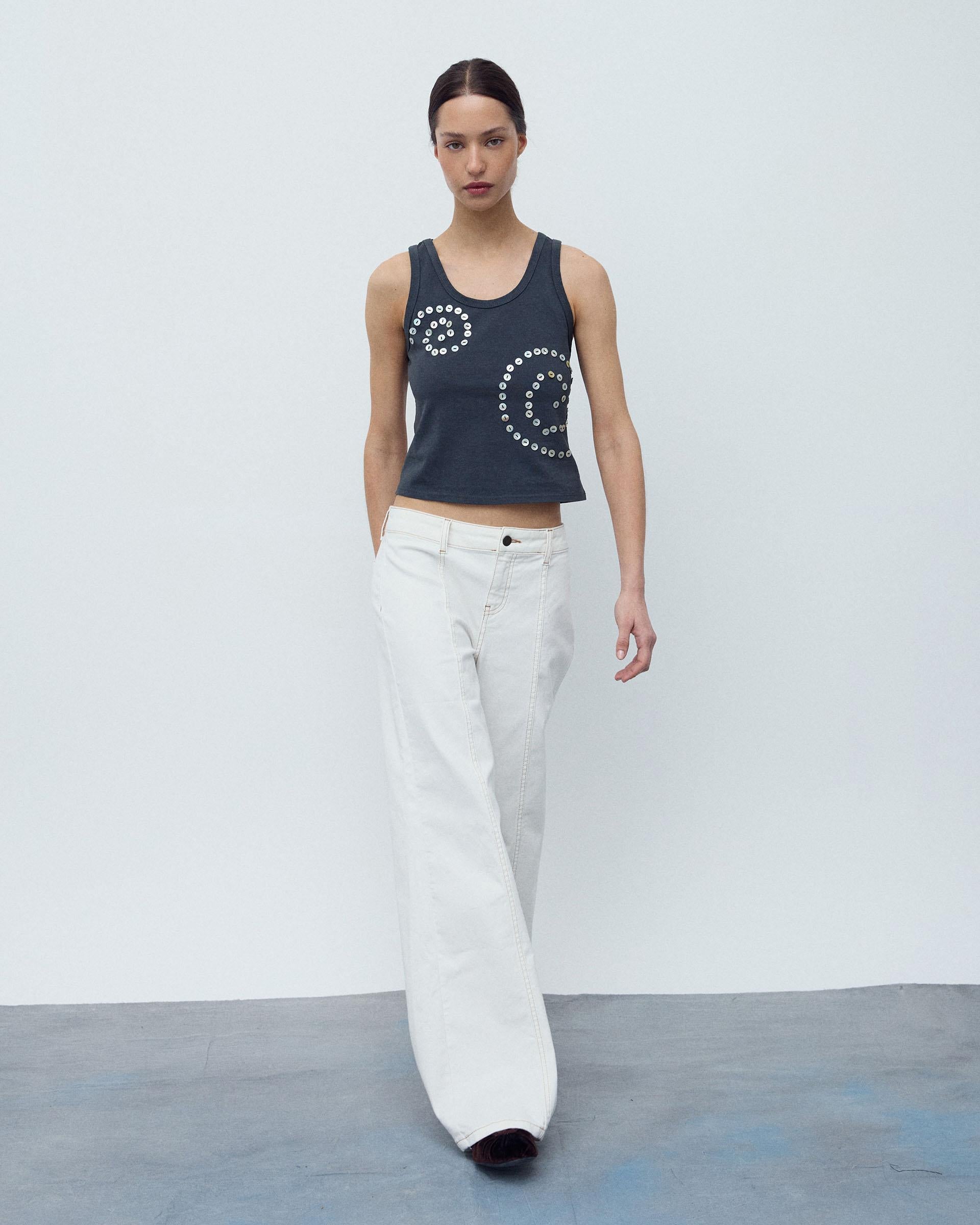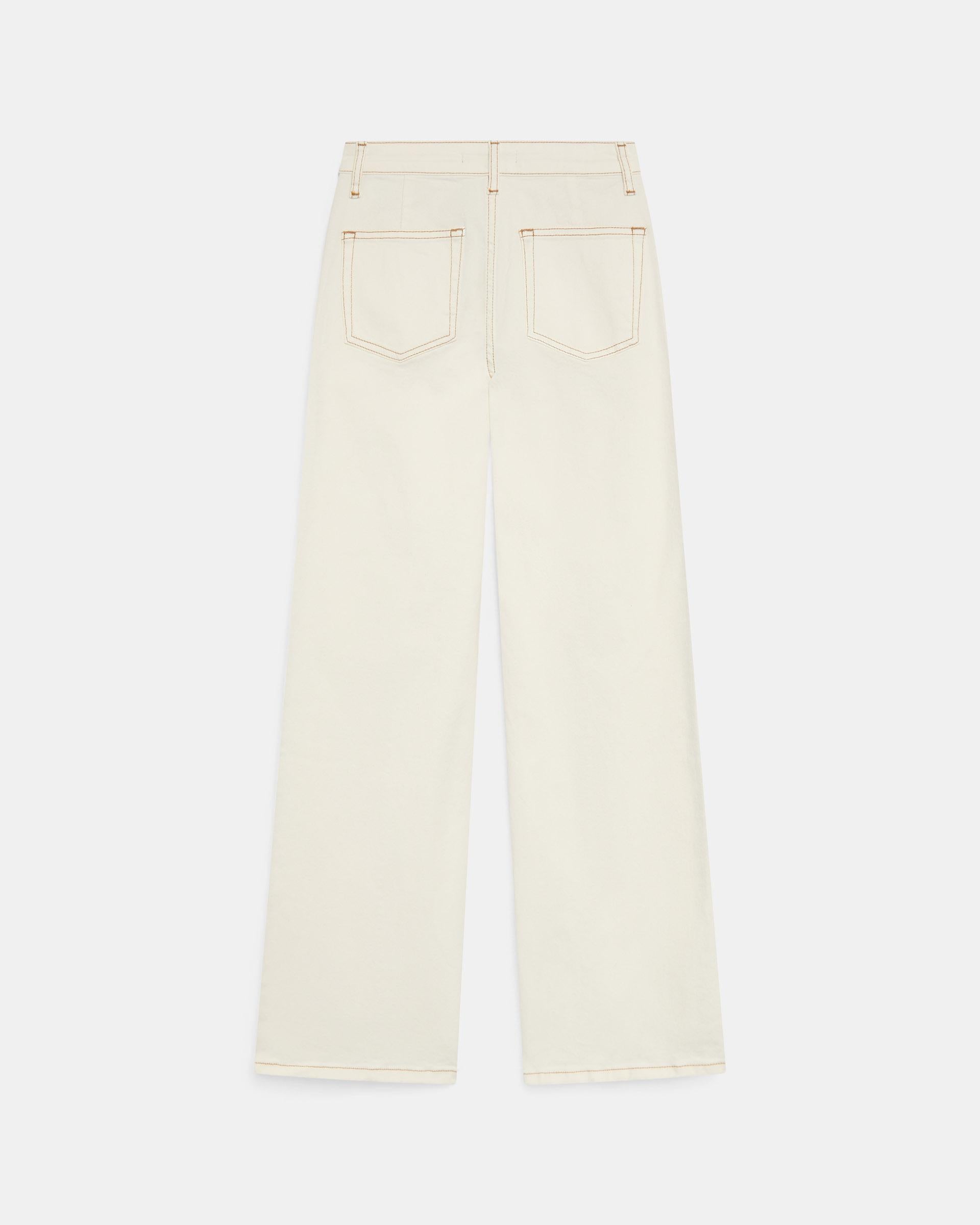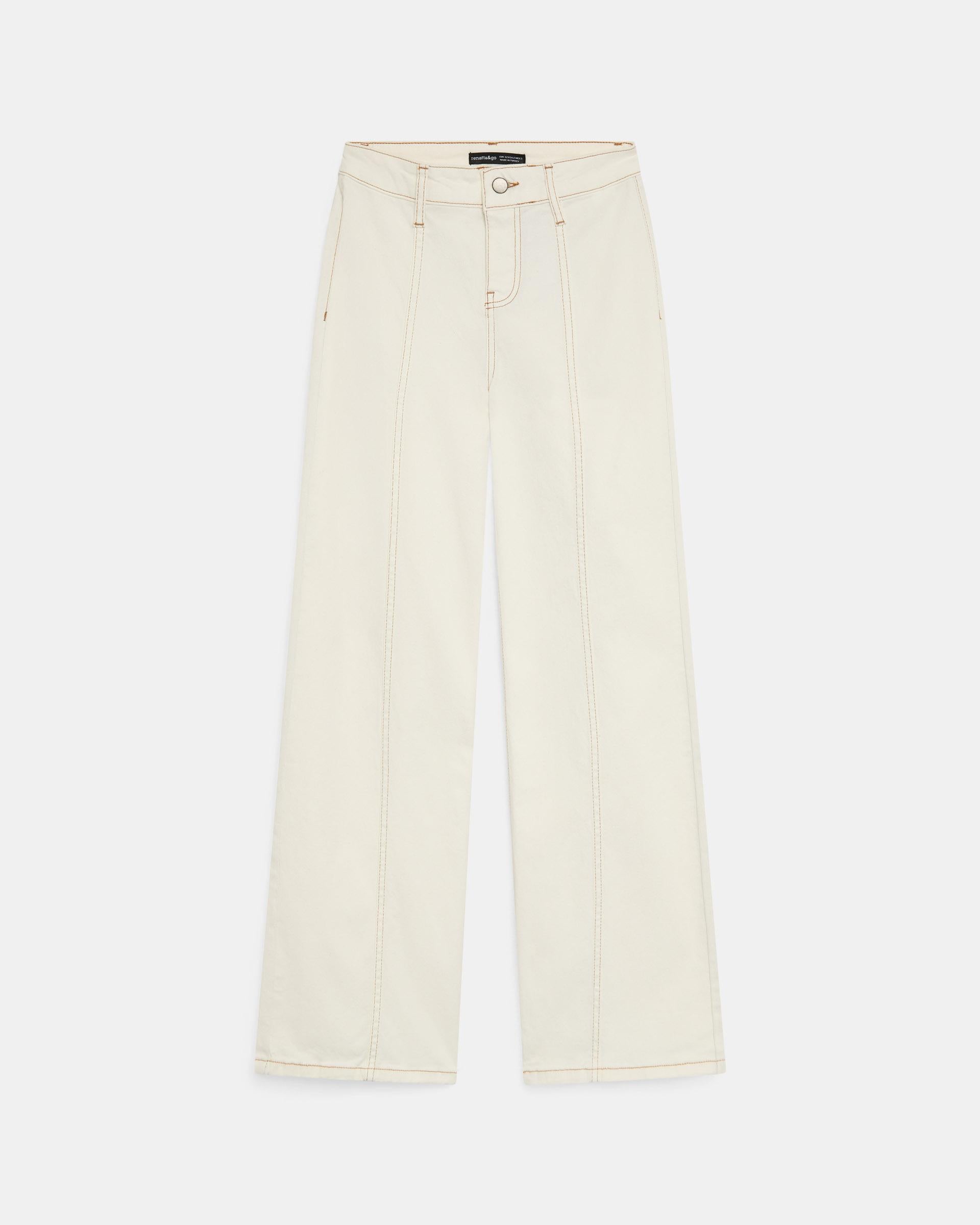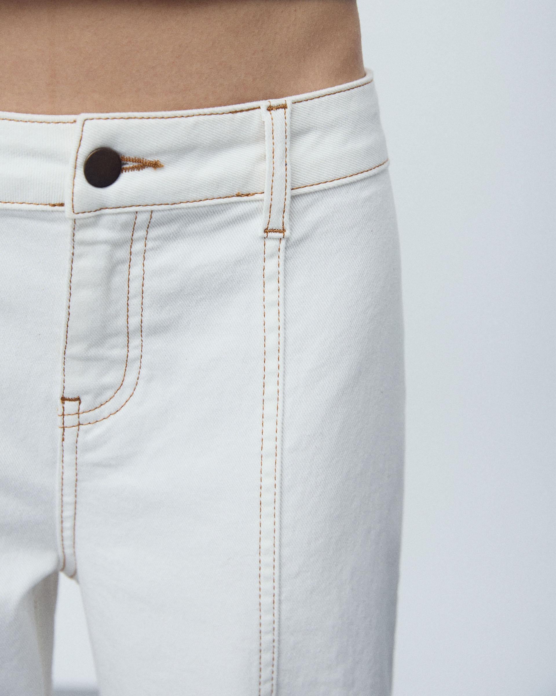 Pantalón tipo denim de color blanco con detalle de costuras y pespuntes en contraste, y cierre con cremallera y botón.
