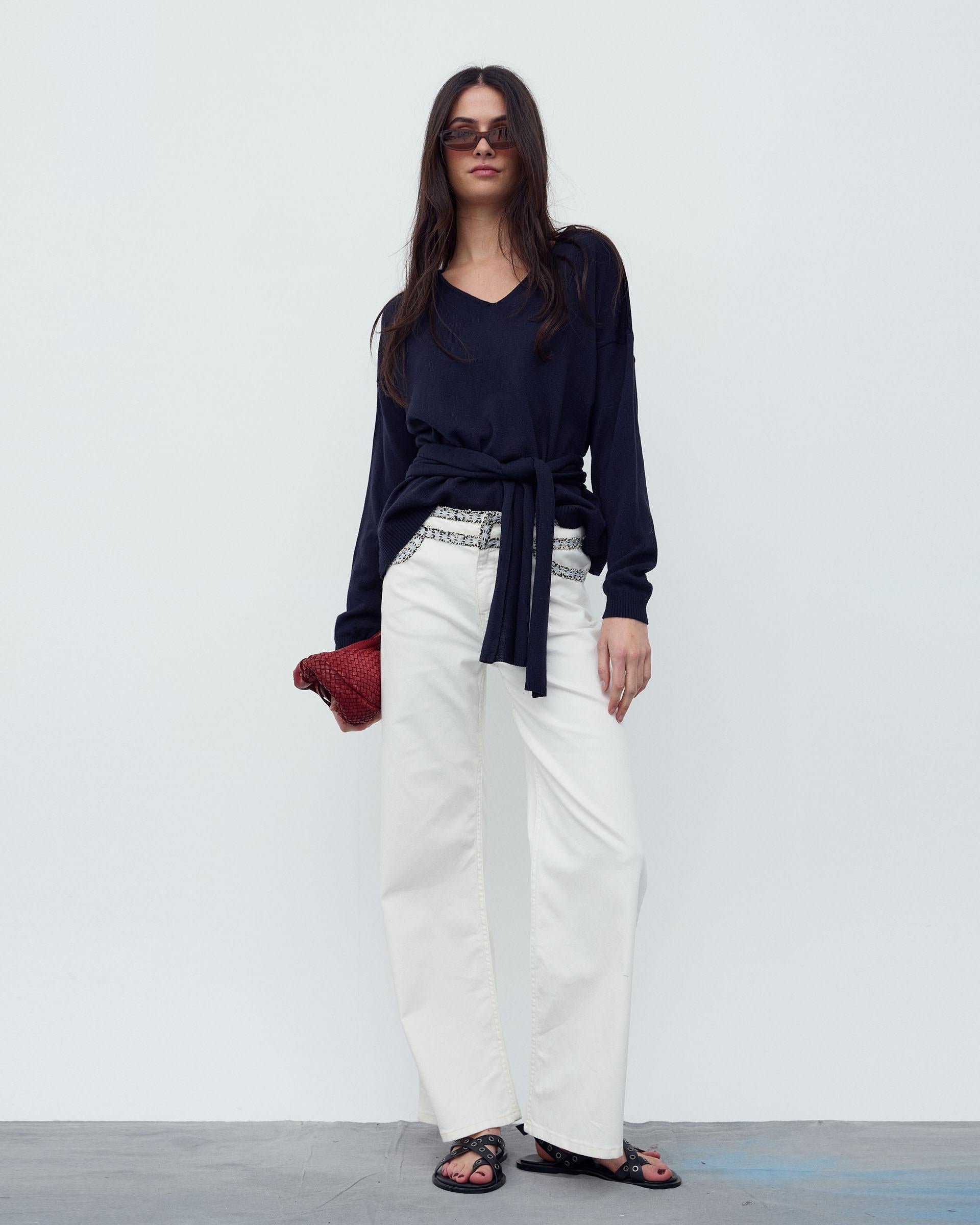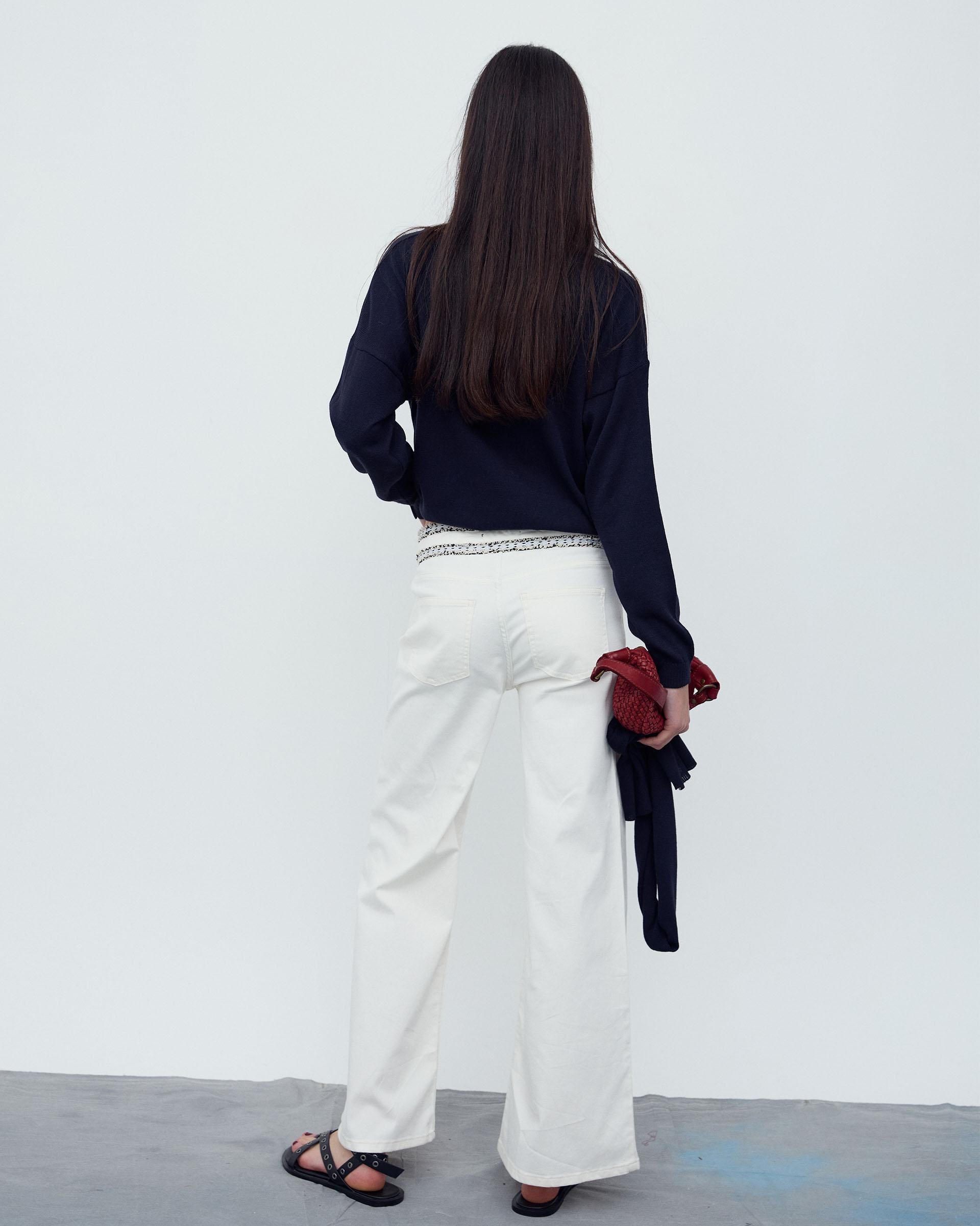 Jeans rectos de color blanco con detalle de cinturilla en contraste en colores y cierre con cremallera y corchete.