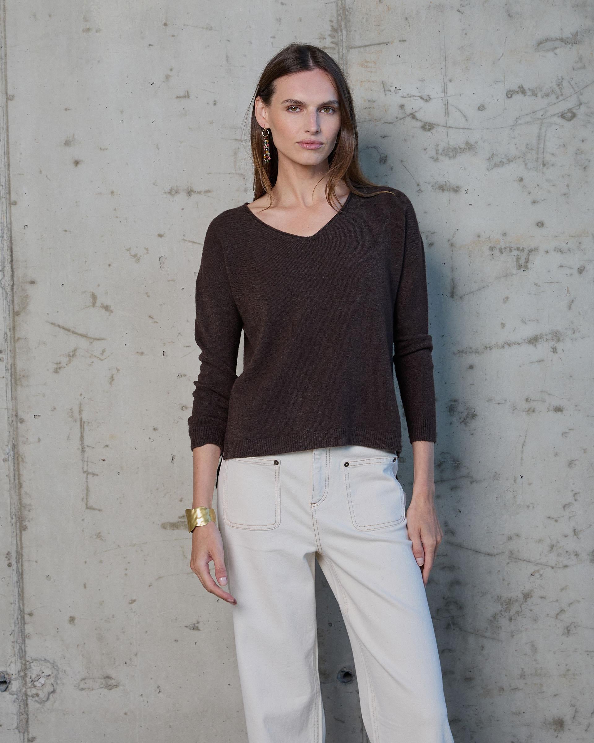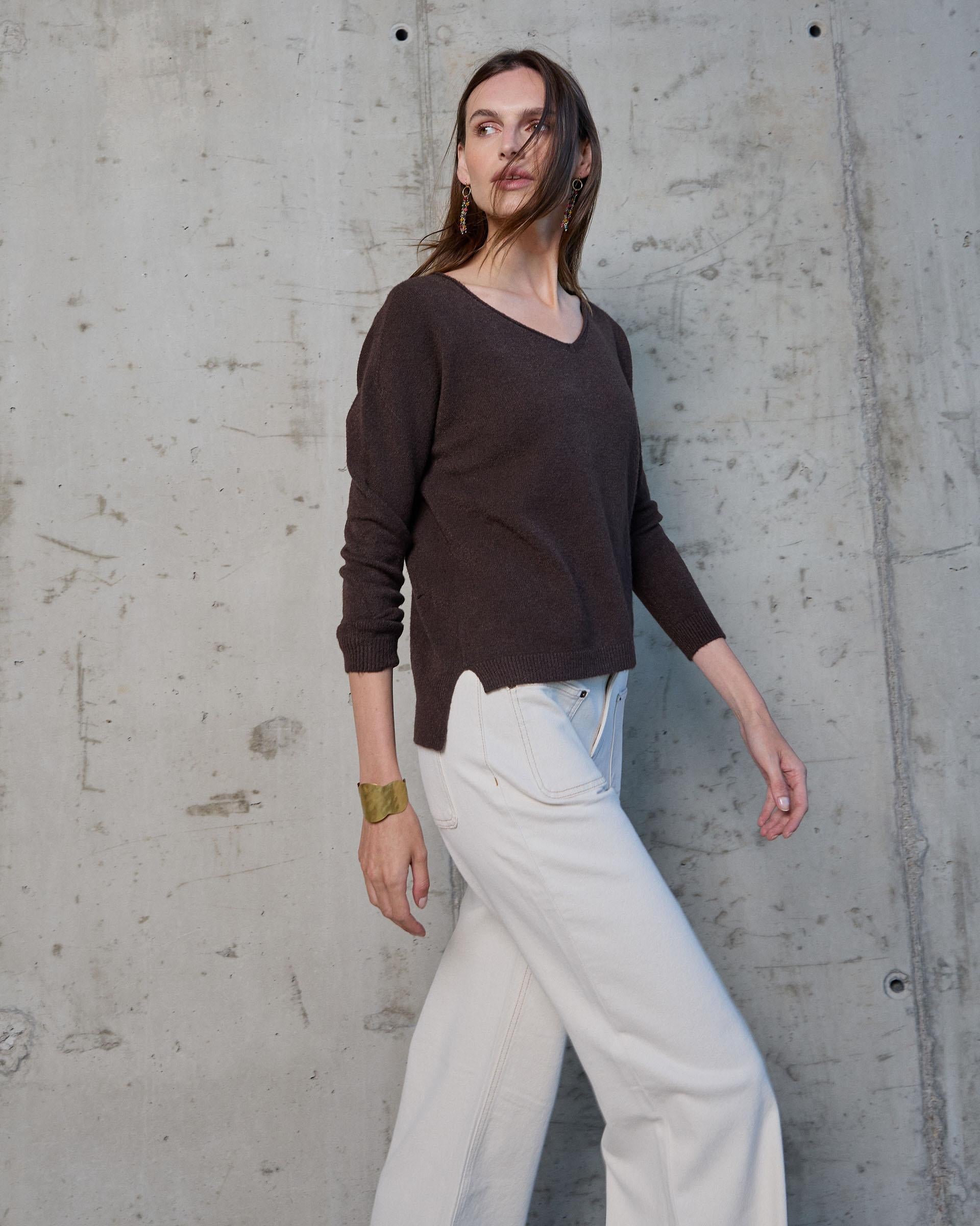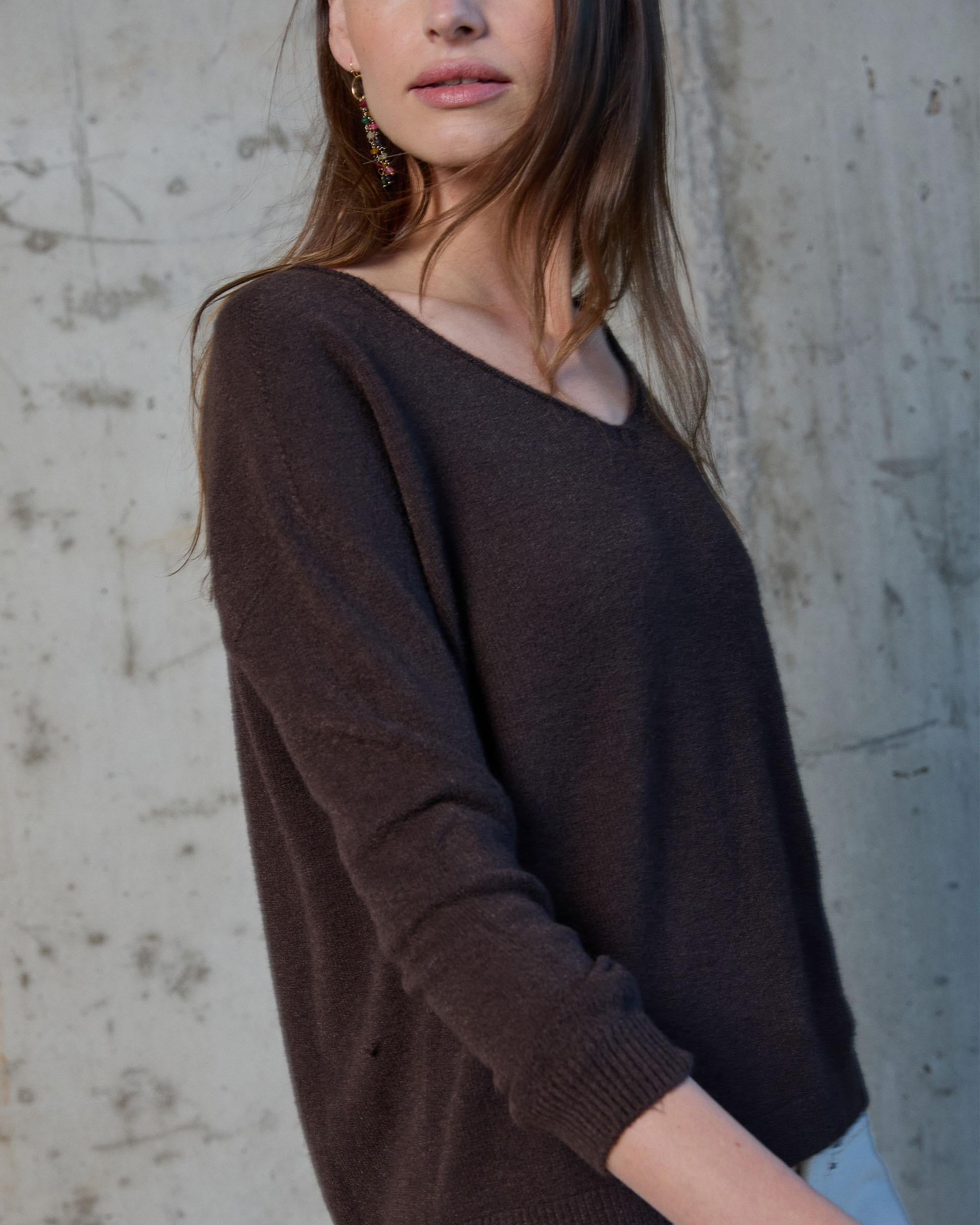 Jersey de punto de color marrón estilo oversize, con cuello pico y bajo asimétrico.