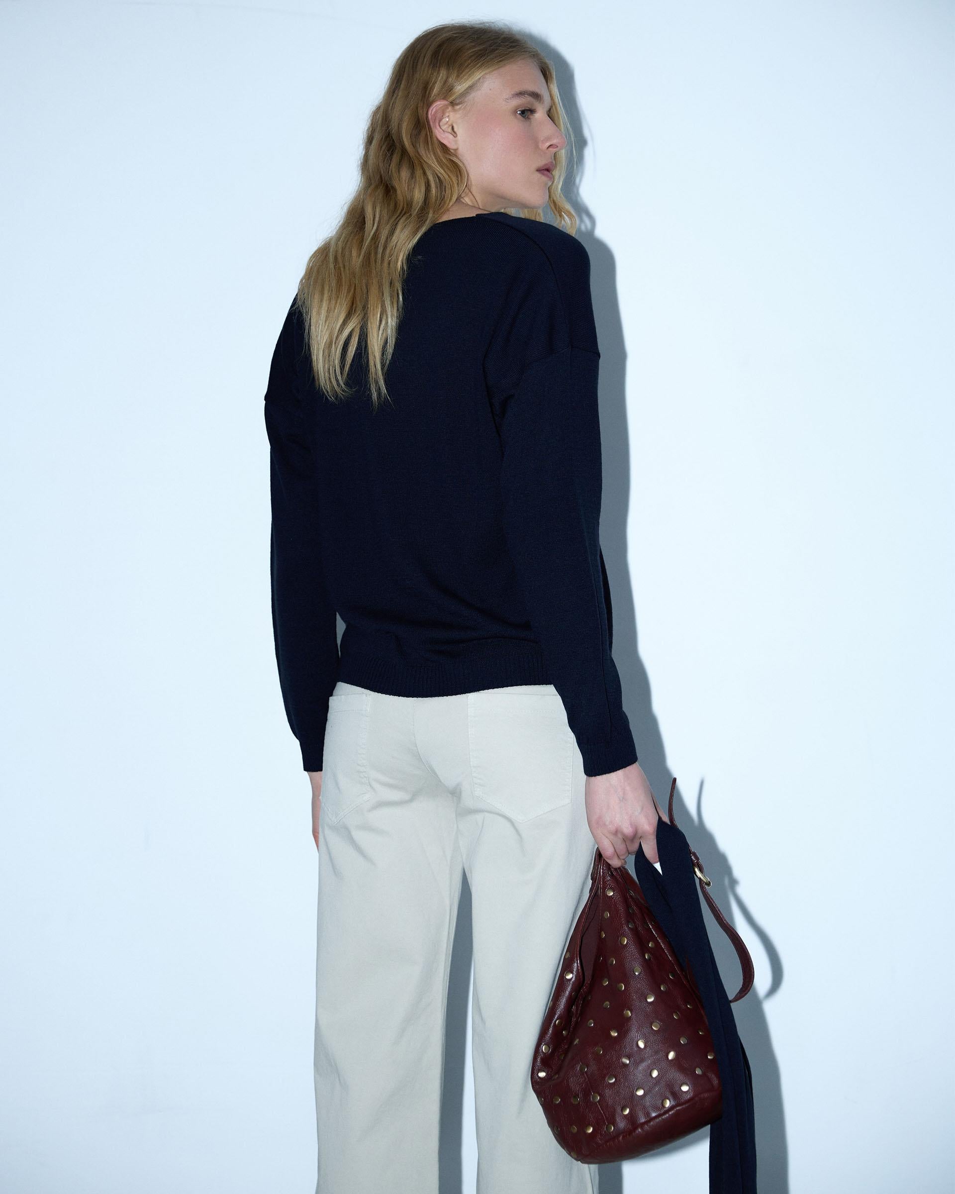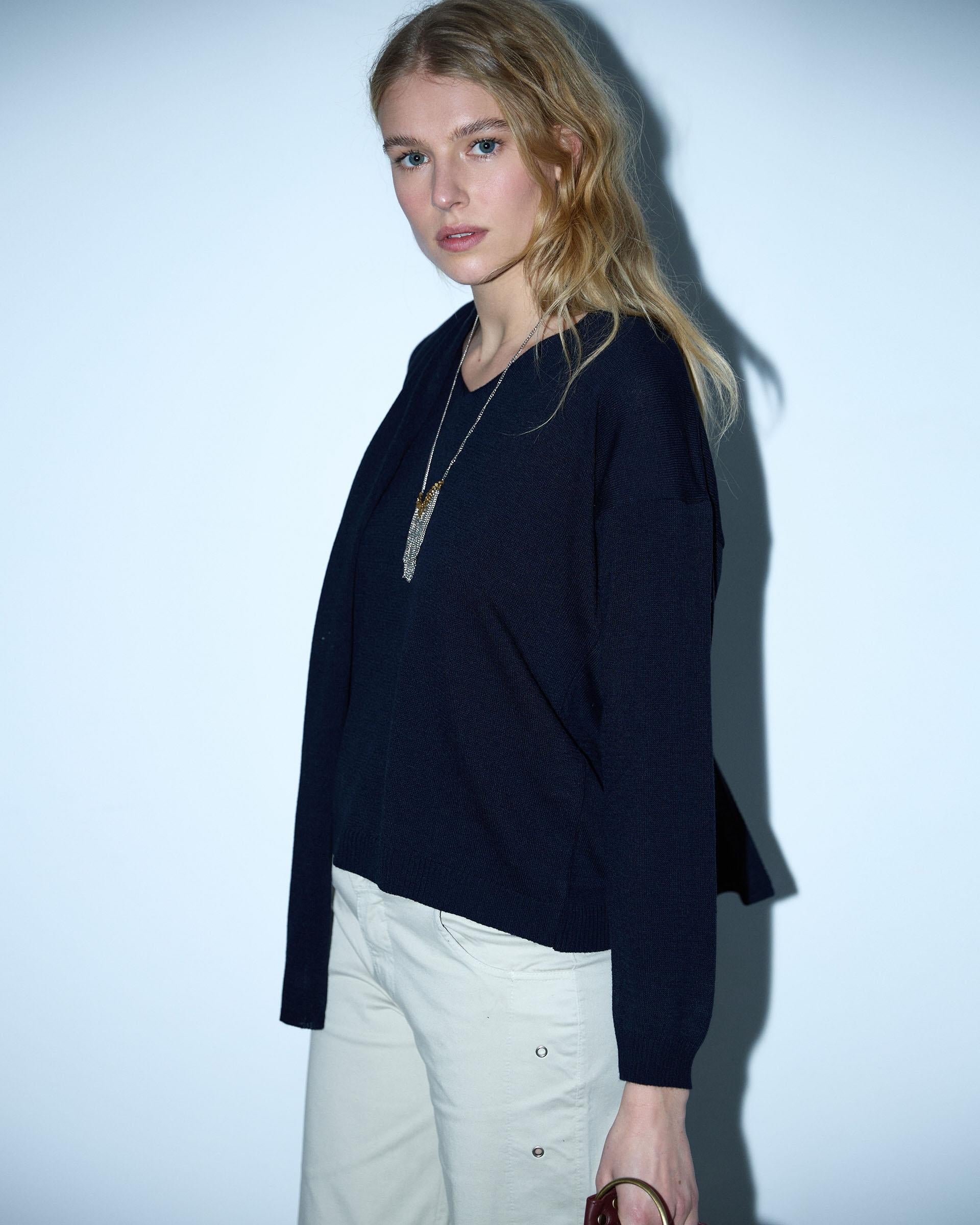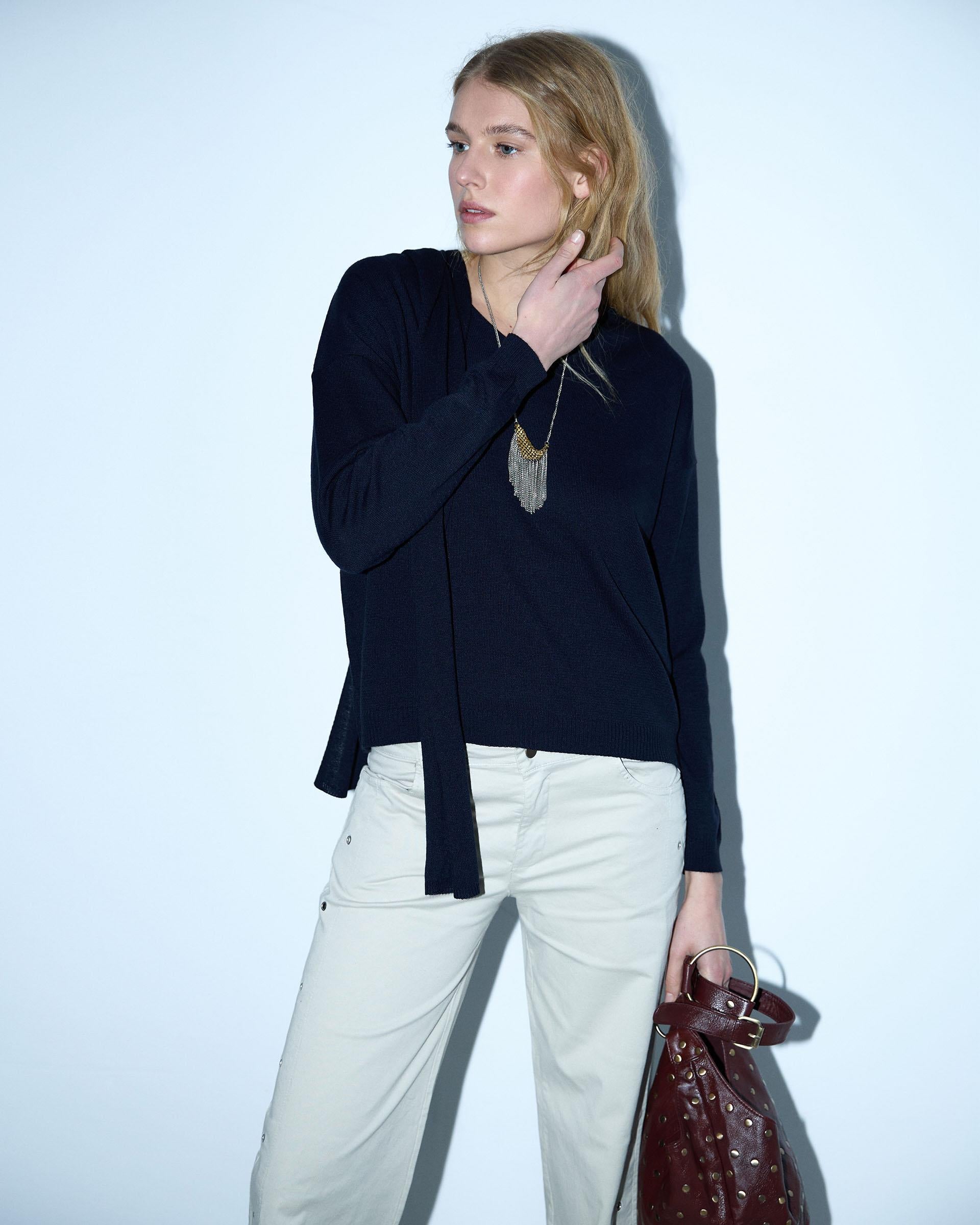 Jersey de punto fino con escote en pico y detalle de bufanda, en color azul marino.