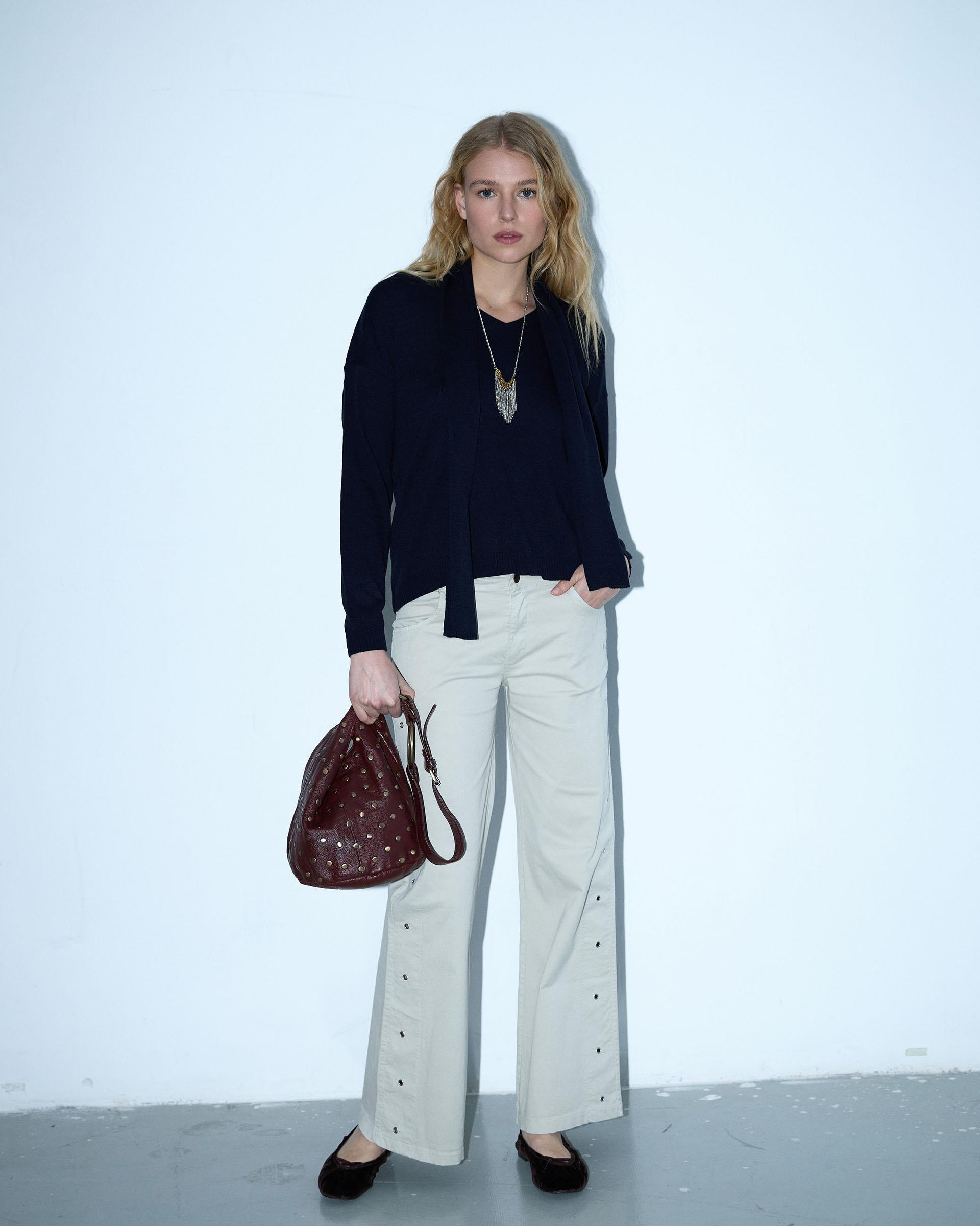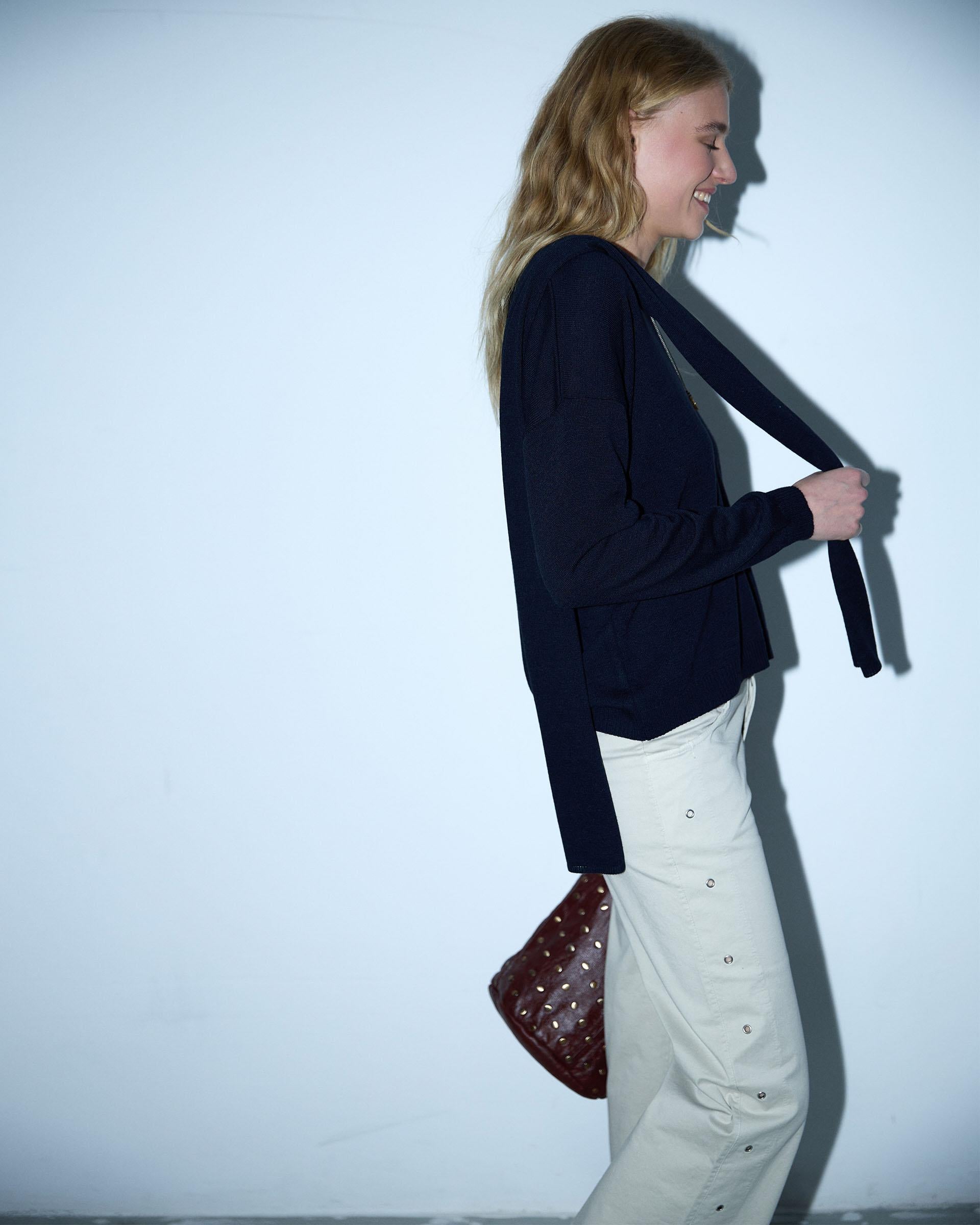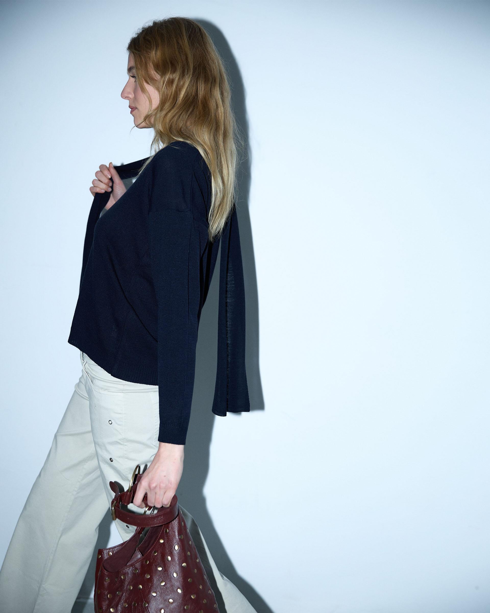 Jersey de punto fino con escote en pico y detalle de bufanda, en color azul marino.