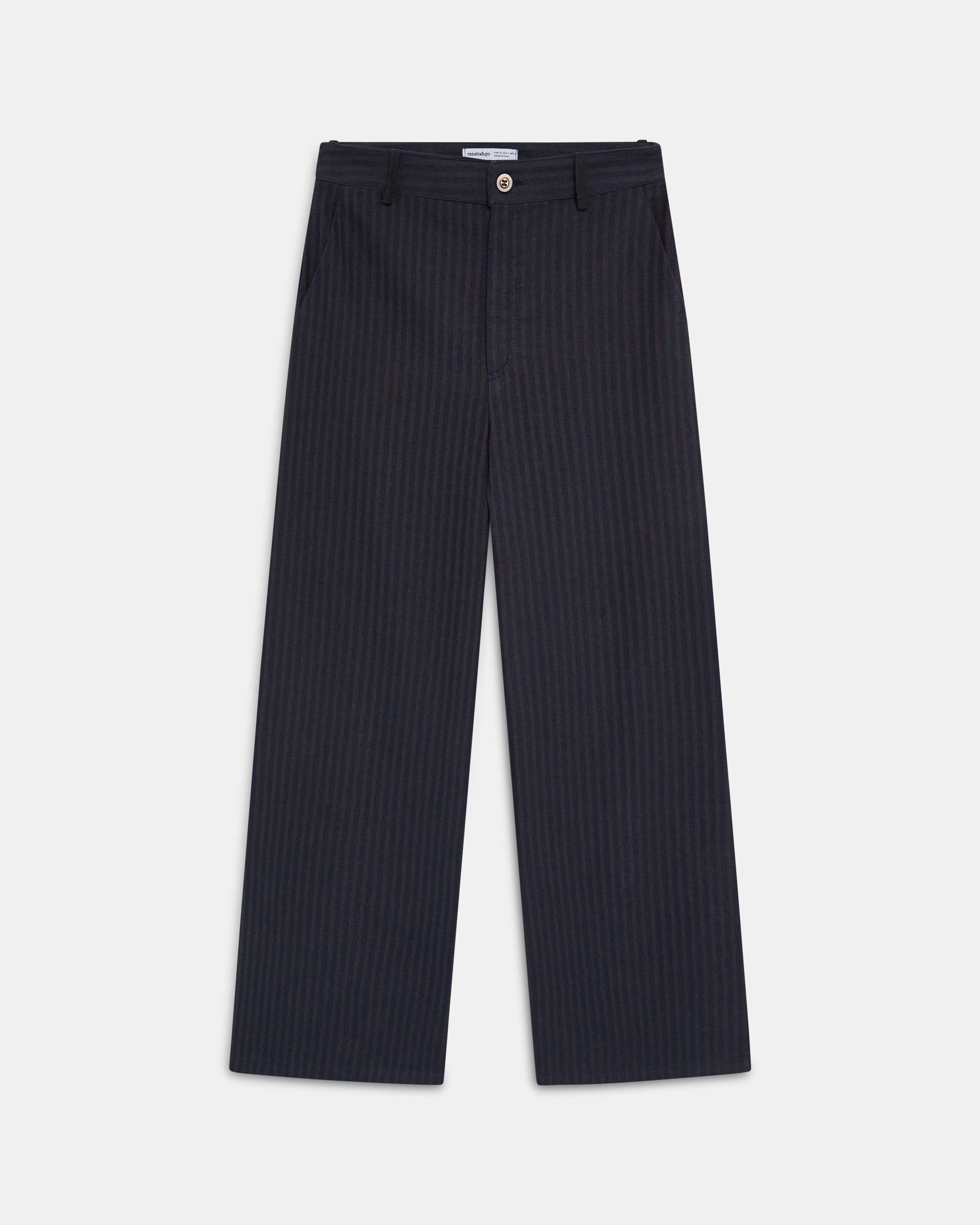 Pantalón largo fluido de rayas en color azul marino y marrón y cierre con cremallera y botón.