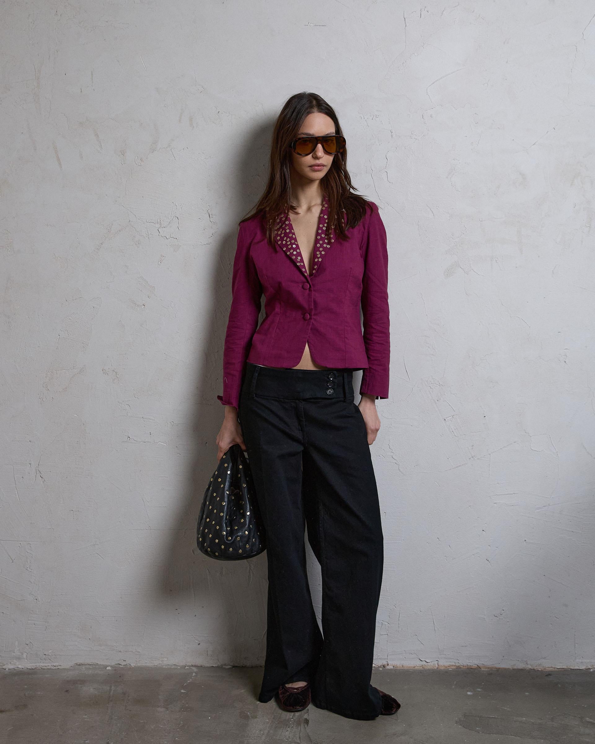 Chaqueta tipo blazer con tejido rústico y detalle de lentejuelas en dorado en solapas, de color rosa oscuro.