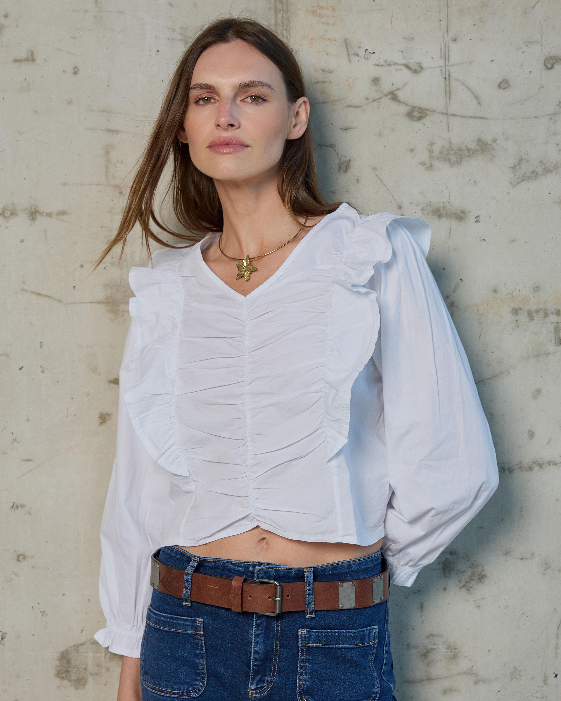 Blusa de manga larga de color blanco con cuello pico, fruncido en delantero y volantes laterales.