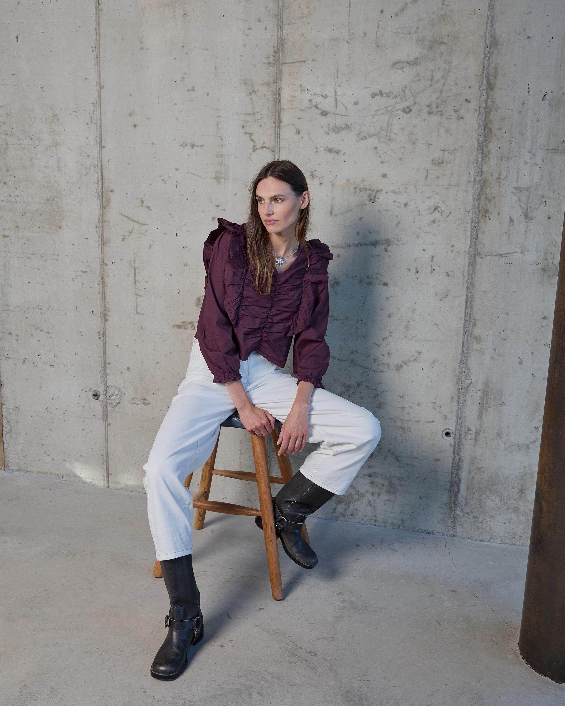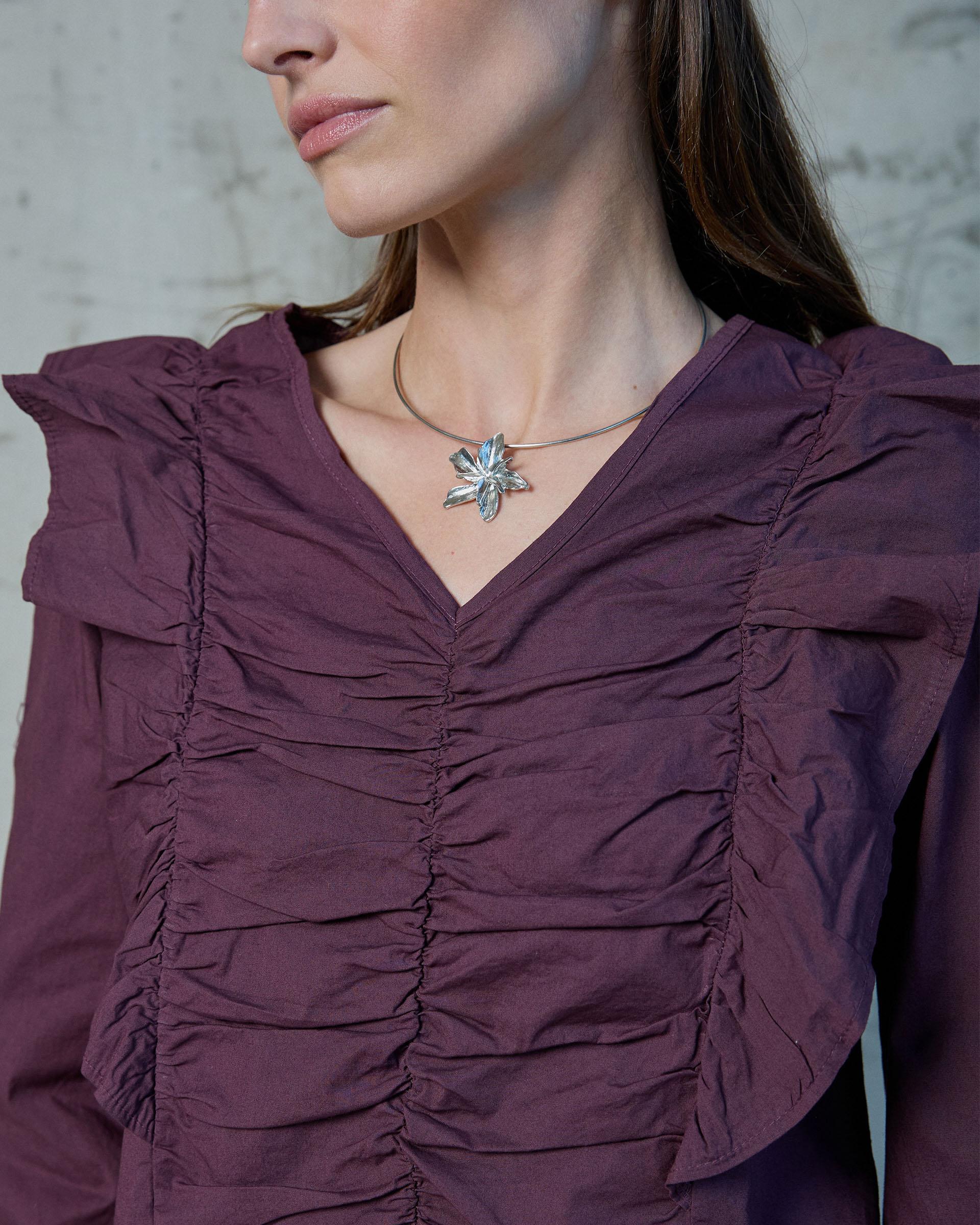 Blusa de manga larga de color morado con cuello pico, fruncido en delantero y volantes laterales.