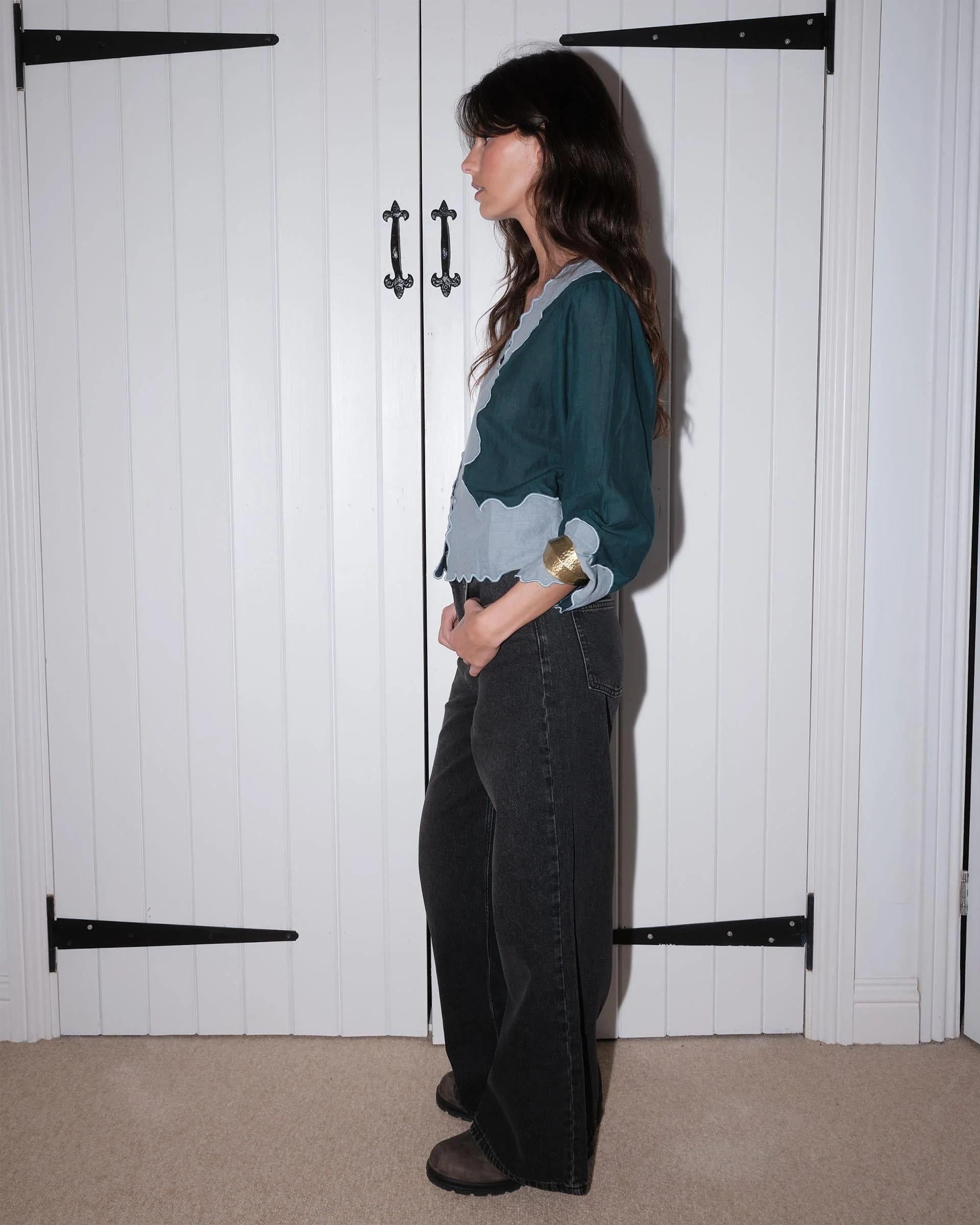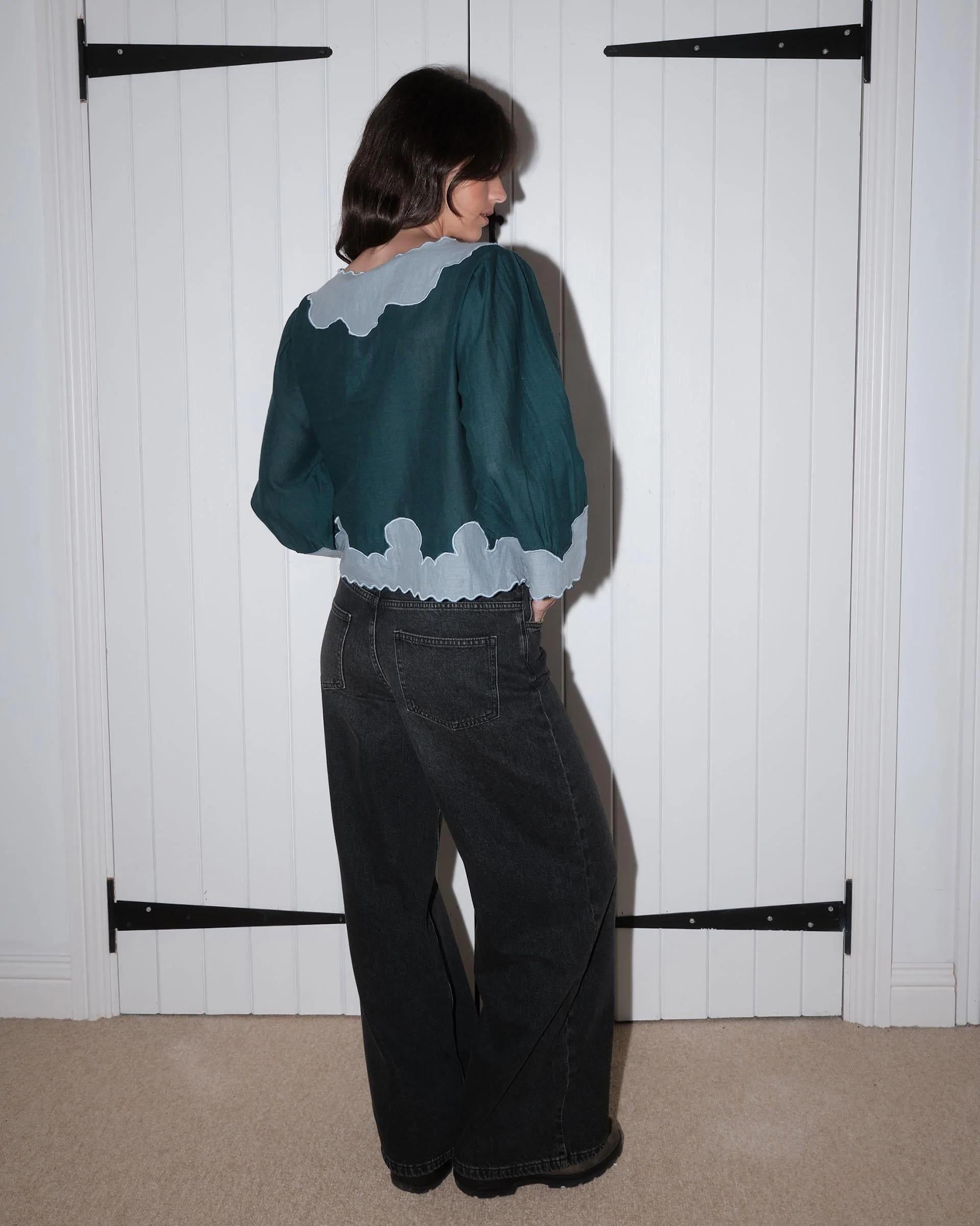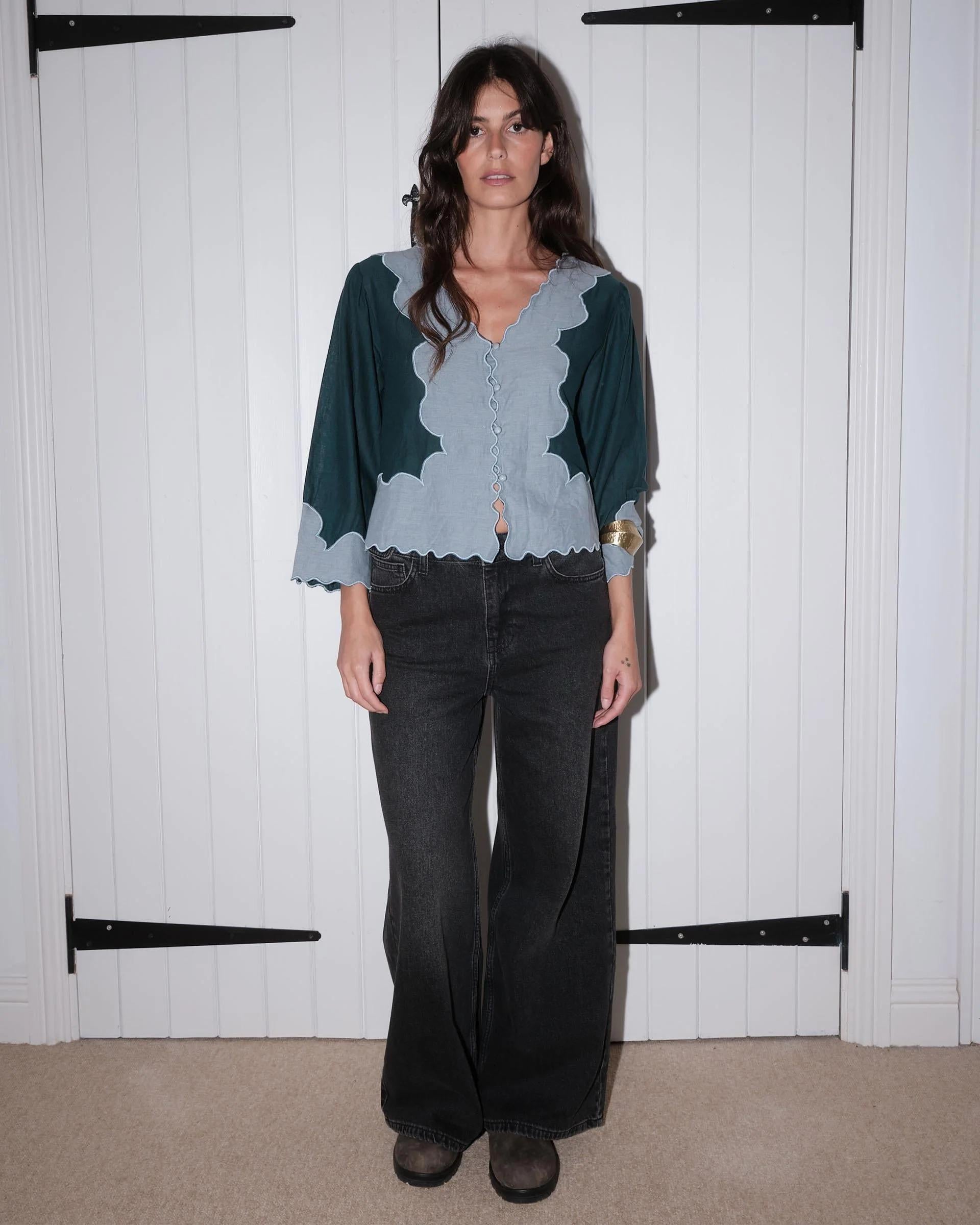 Blusa de manga francesa con detalle de festoneado en contraste, escote en V y cierre con botones a tono en delantero.