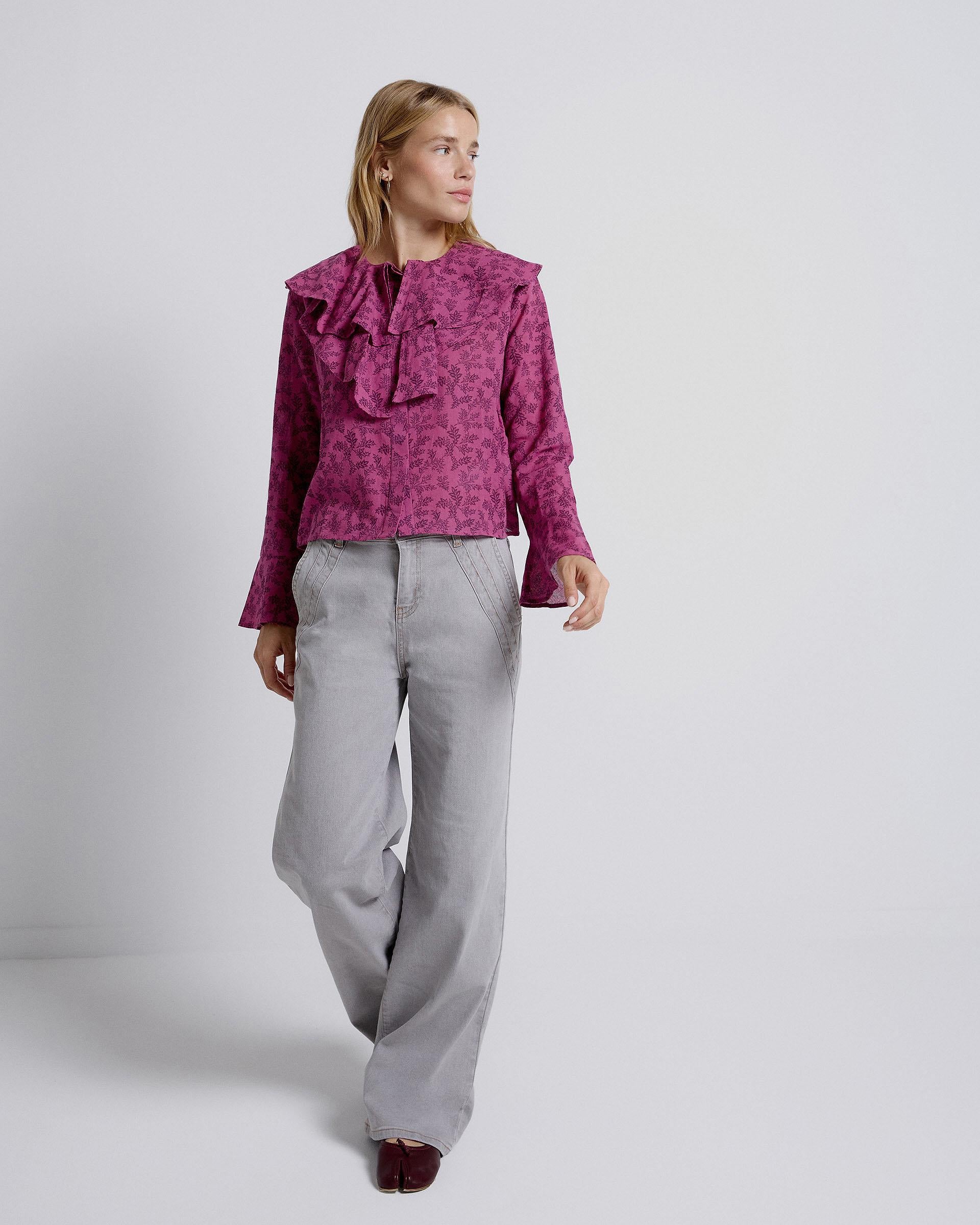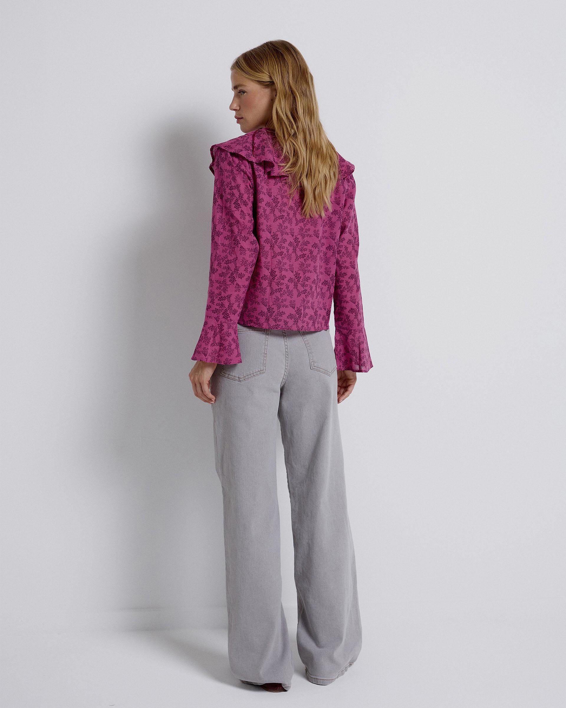 Blusa de manga larga con volantes asimétricos en delantero y espalda, con botones a modo de cierre, de estampado en tonos rosas.