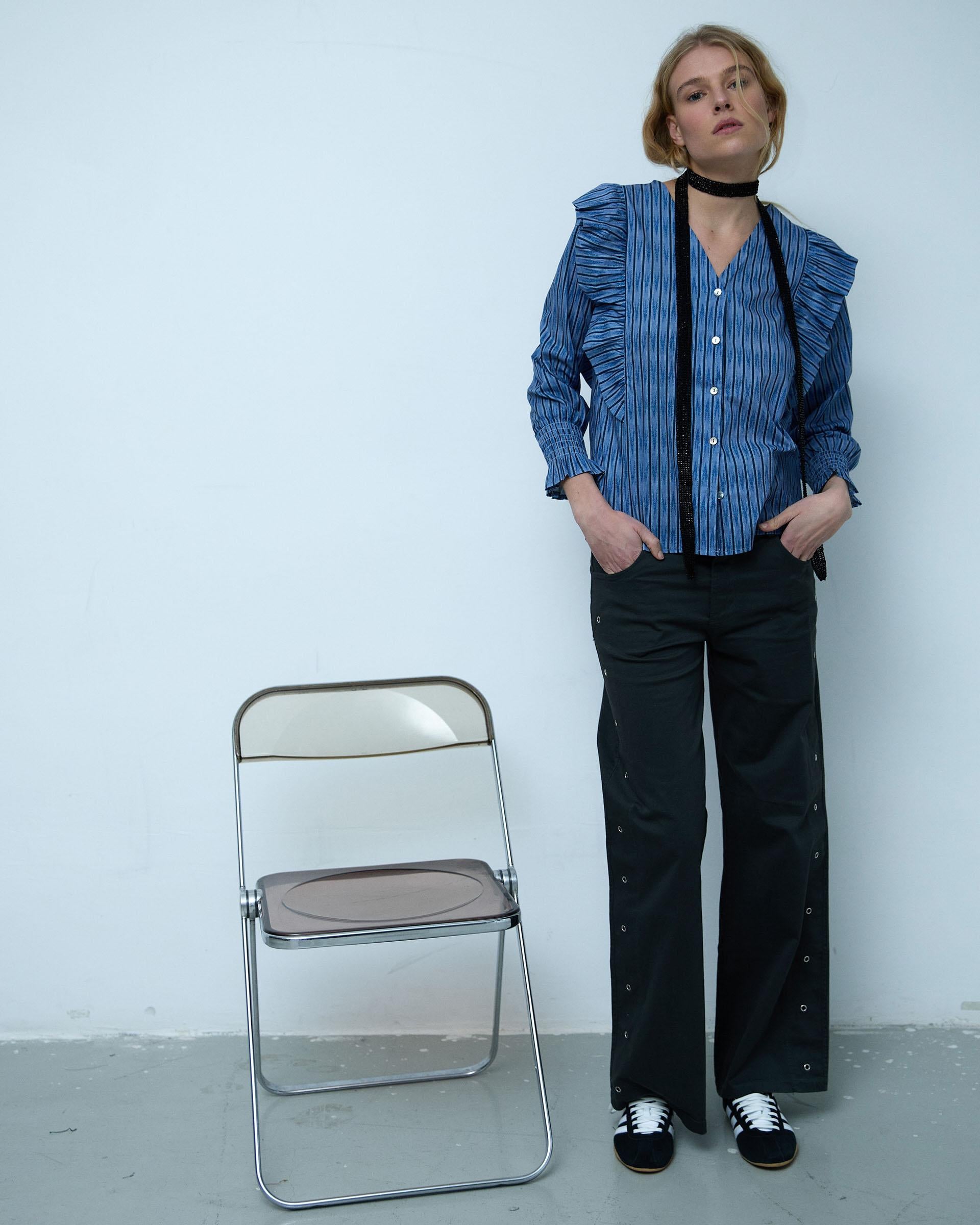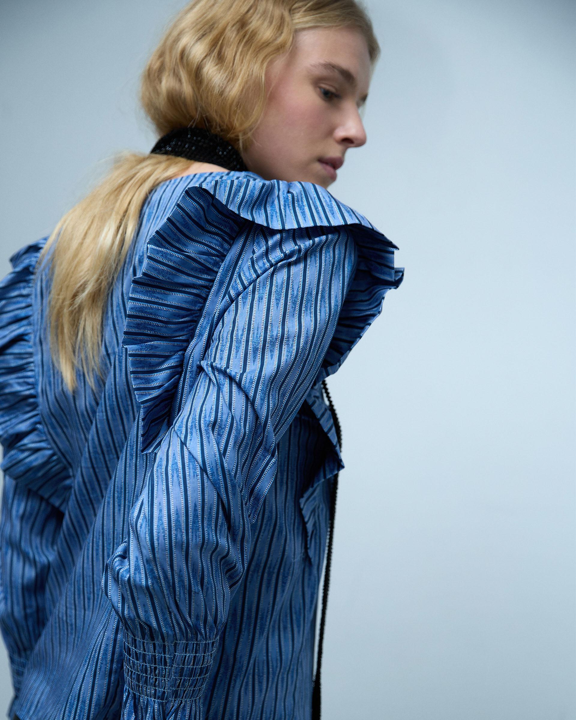 Blusa de manga larga con estampado tipo étnico en color azul, detalle de volantes y escote en pico.