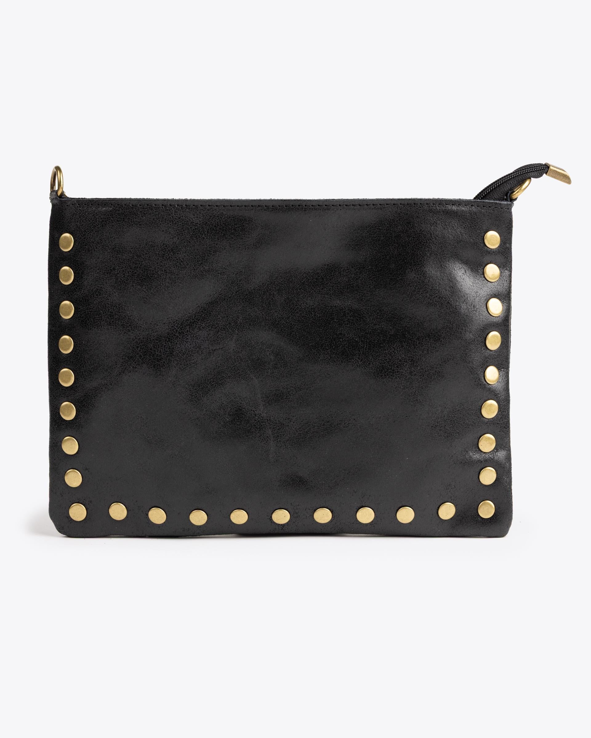 Bolso tipo cartera con asa larga y tachuelas, de color negro.