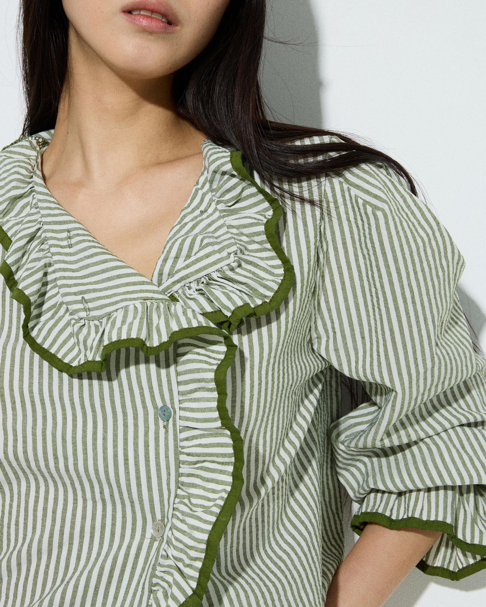 Camisa de manga larga con estampado de rayas en color verde, botones en lateral y volante con ribete.