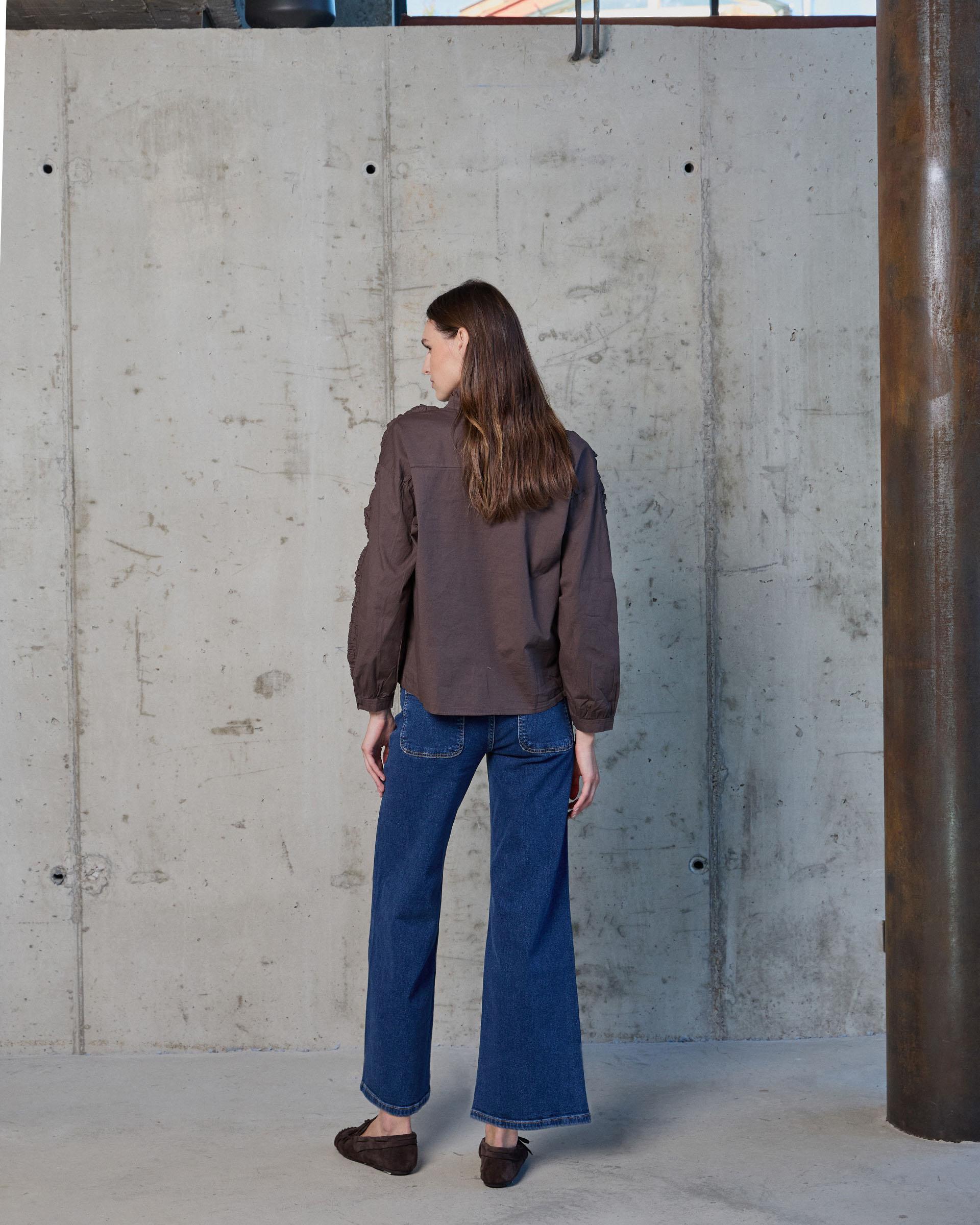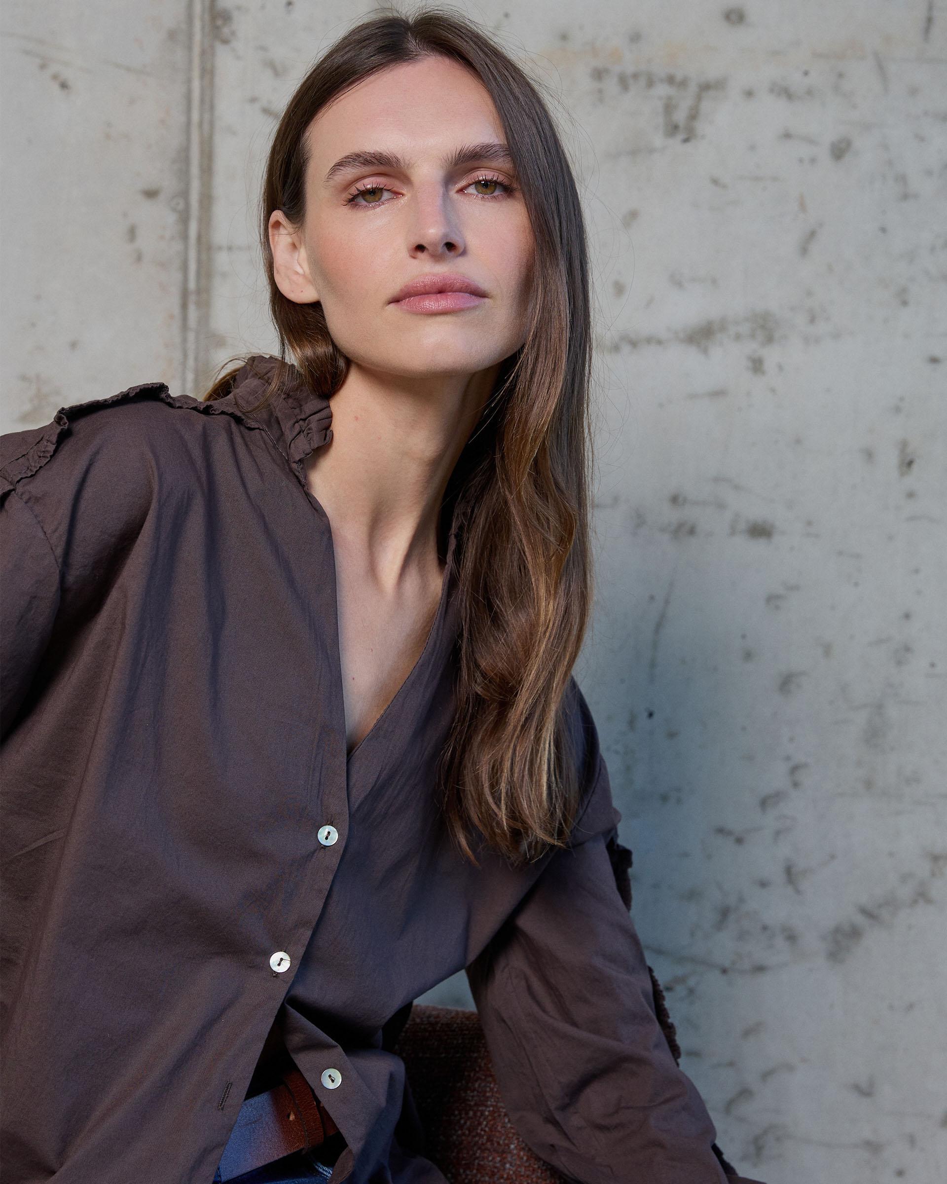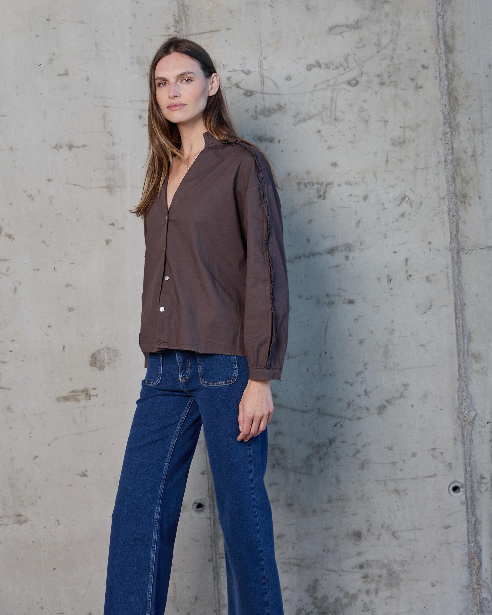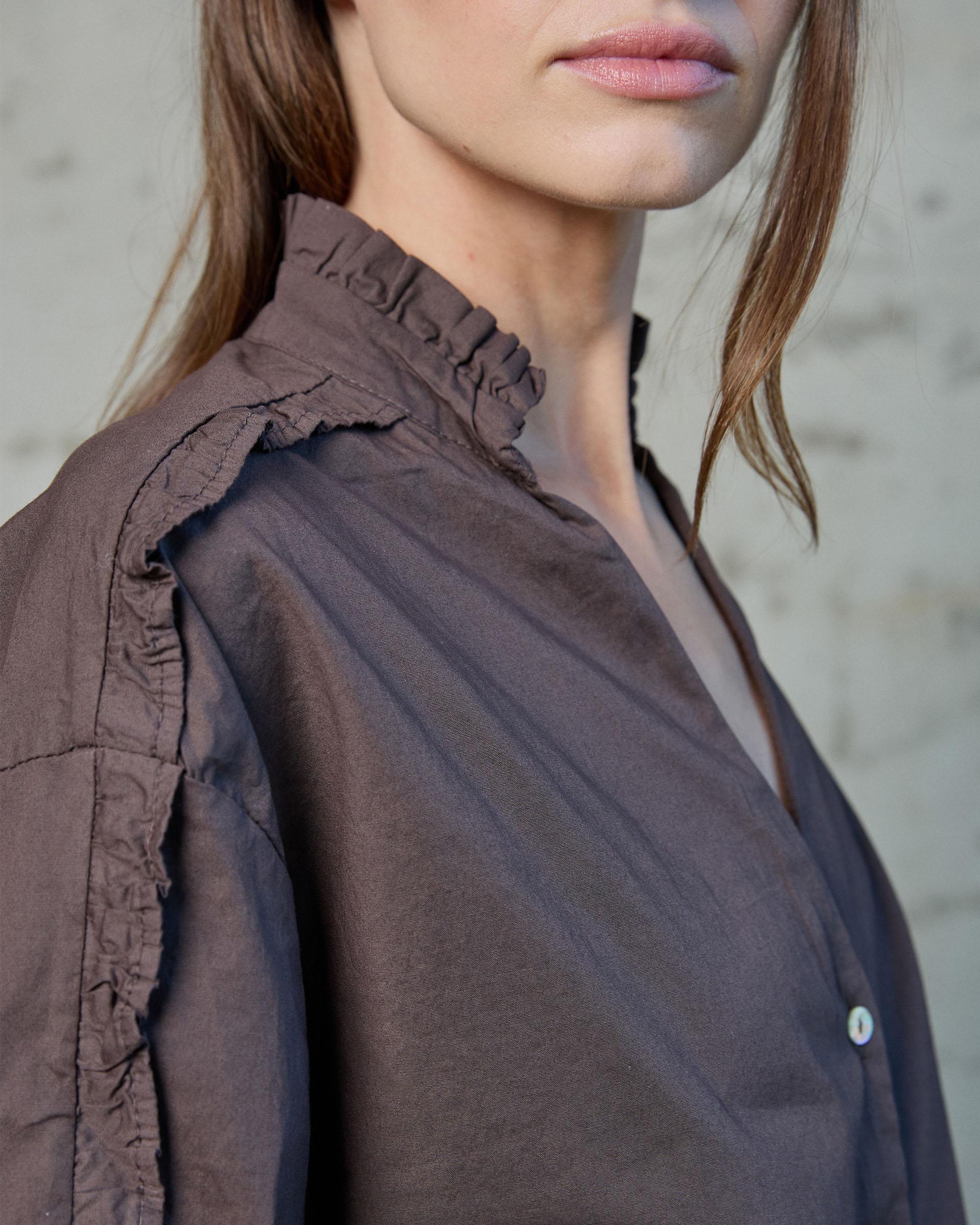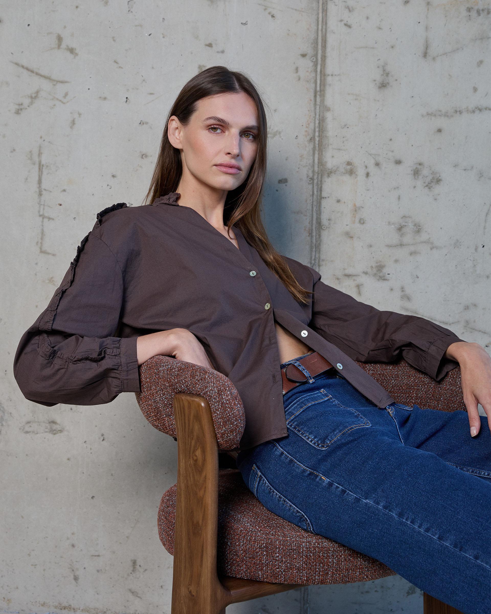 Camisa de color marrón con cuello mao y detalle de volante en mangas y hombros.