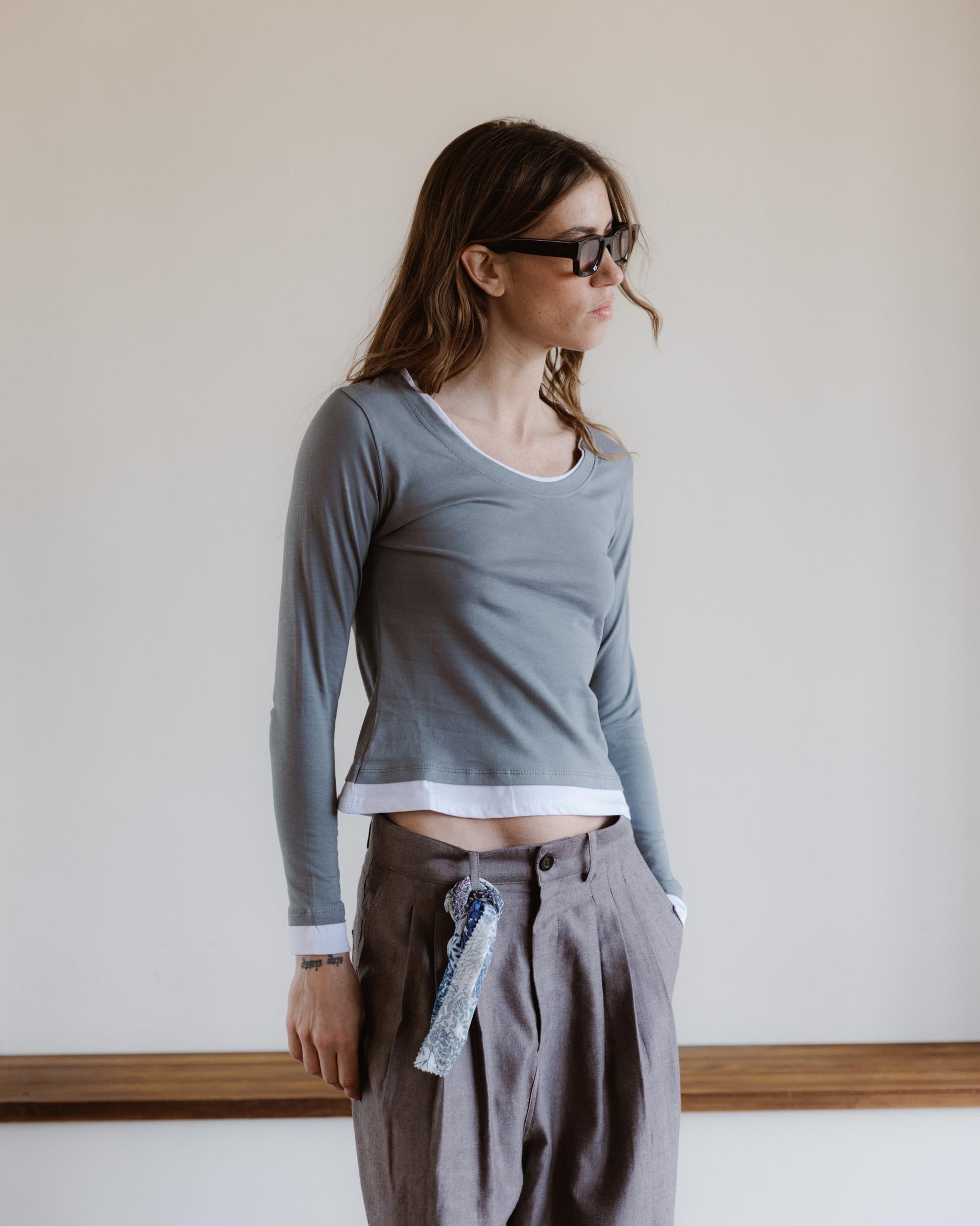 Camiseta de escote redondo y manga larga con acabados efecto doble camiseta, en color gris con contraste en blanco.