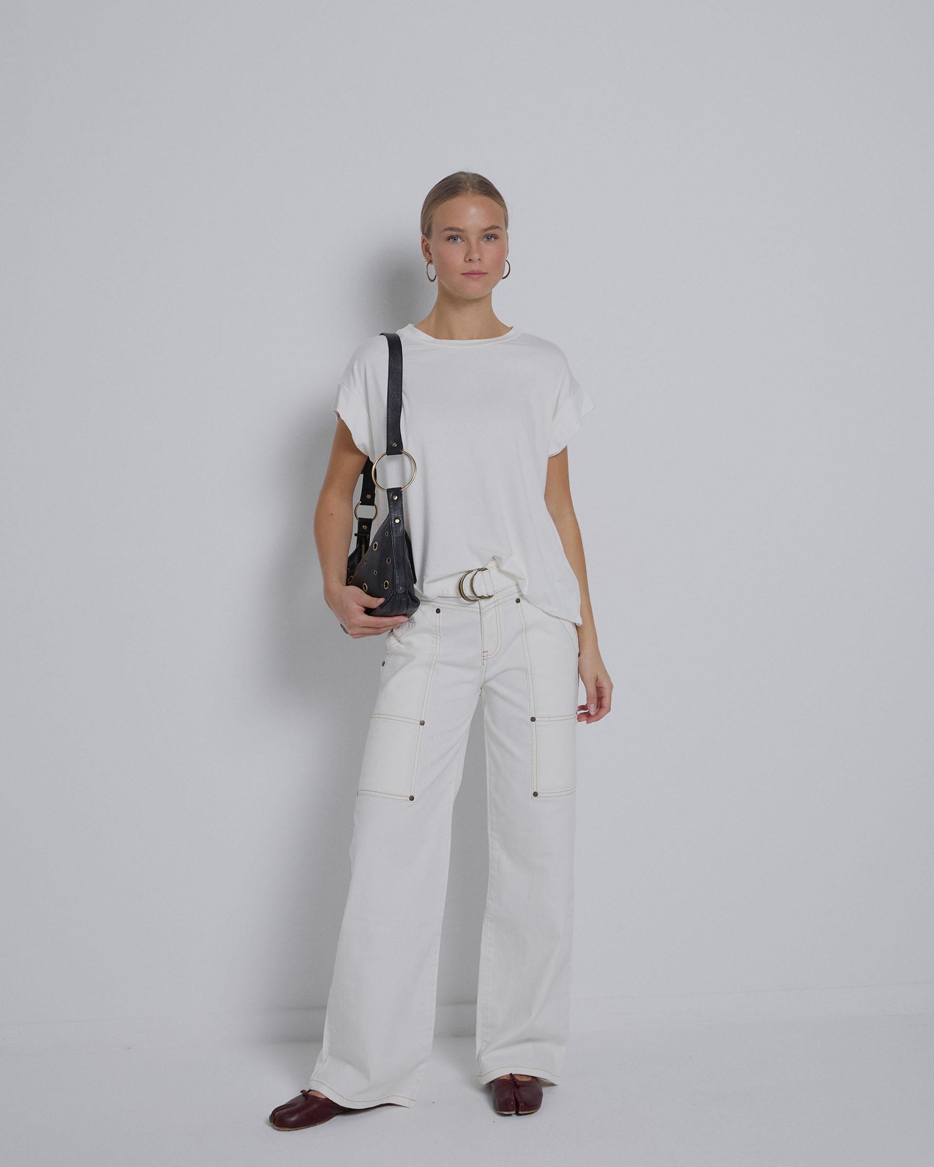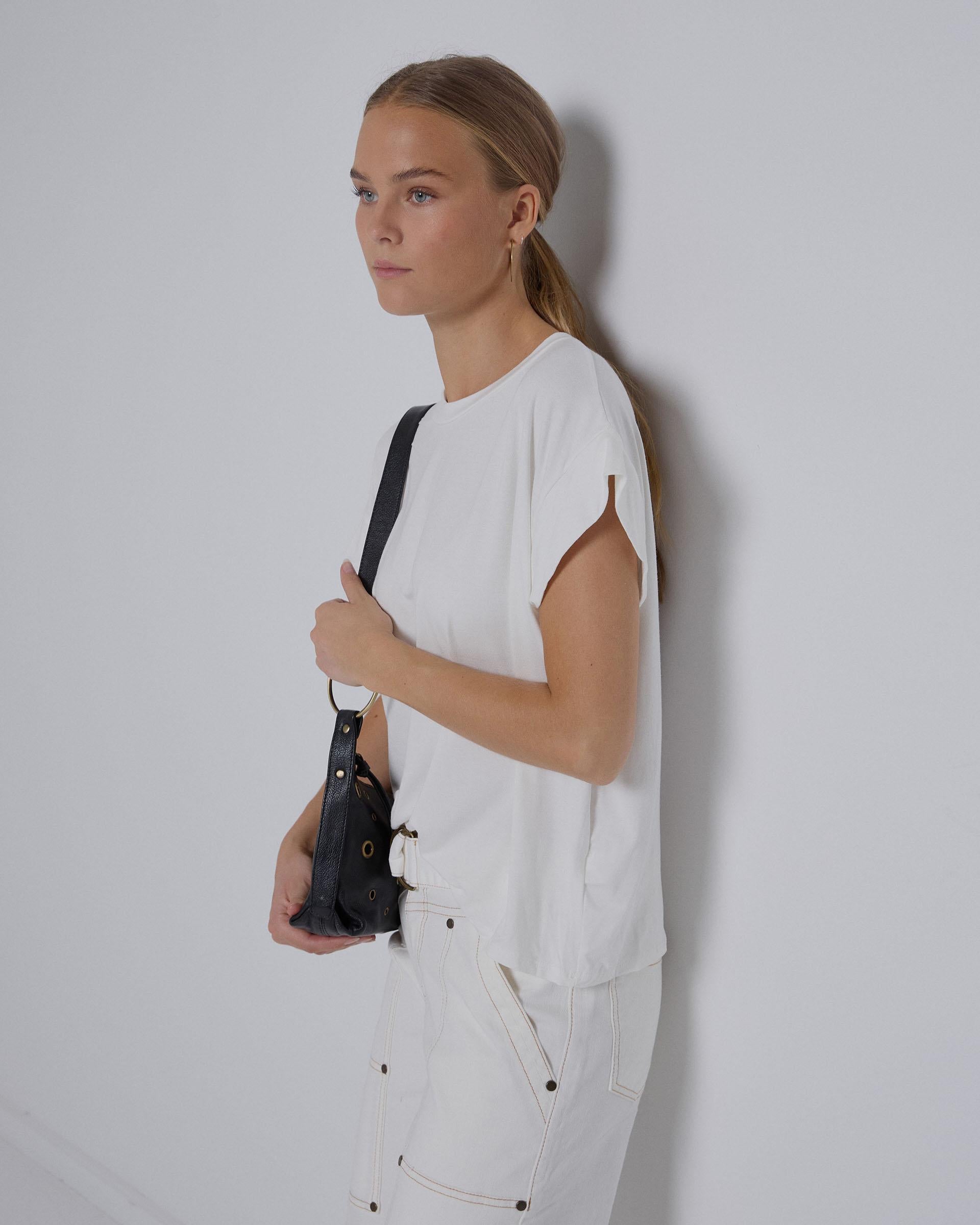 Camiseta de manga corta con sisa amplia, de color blanco.