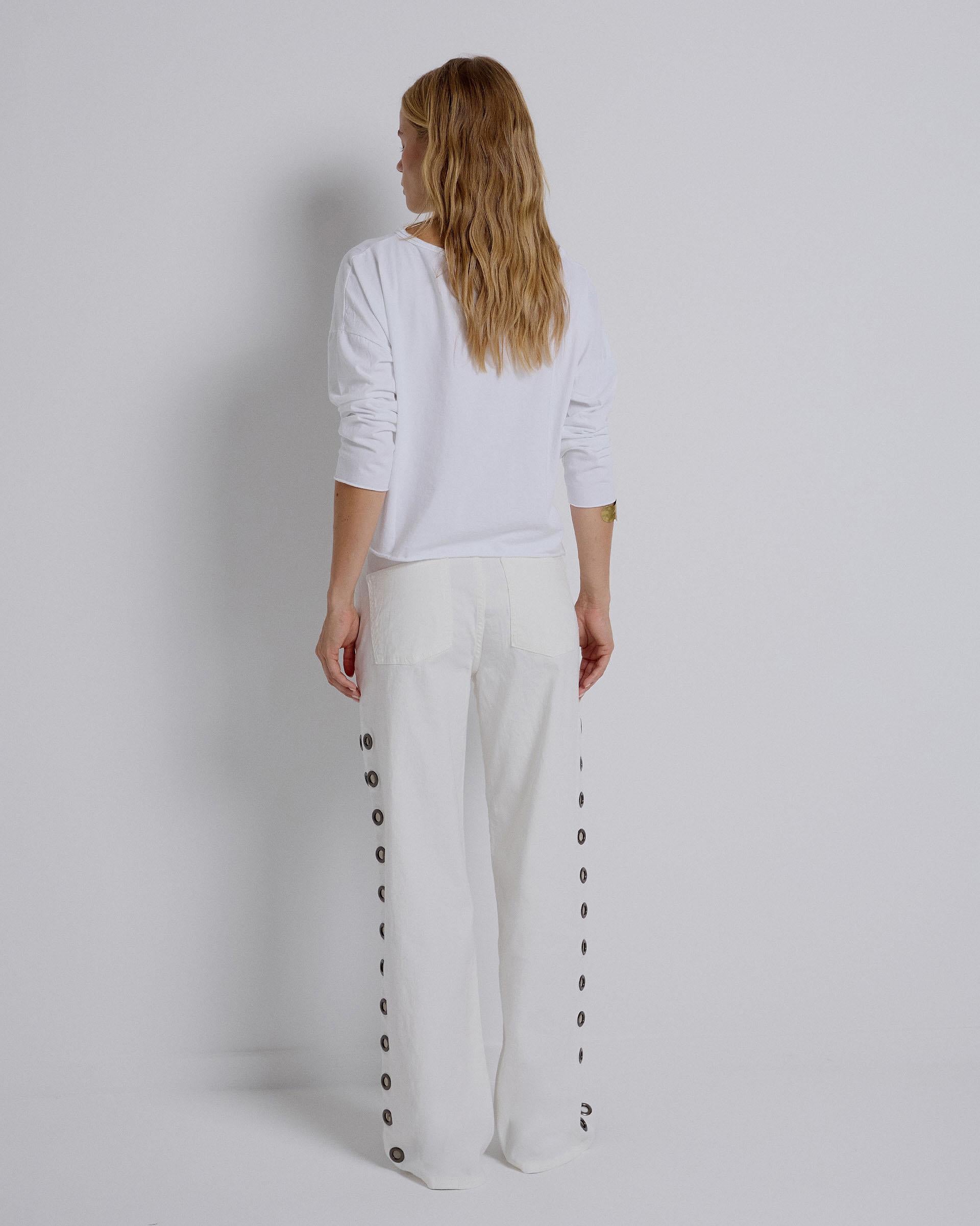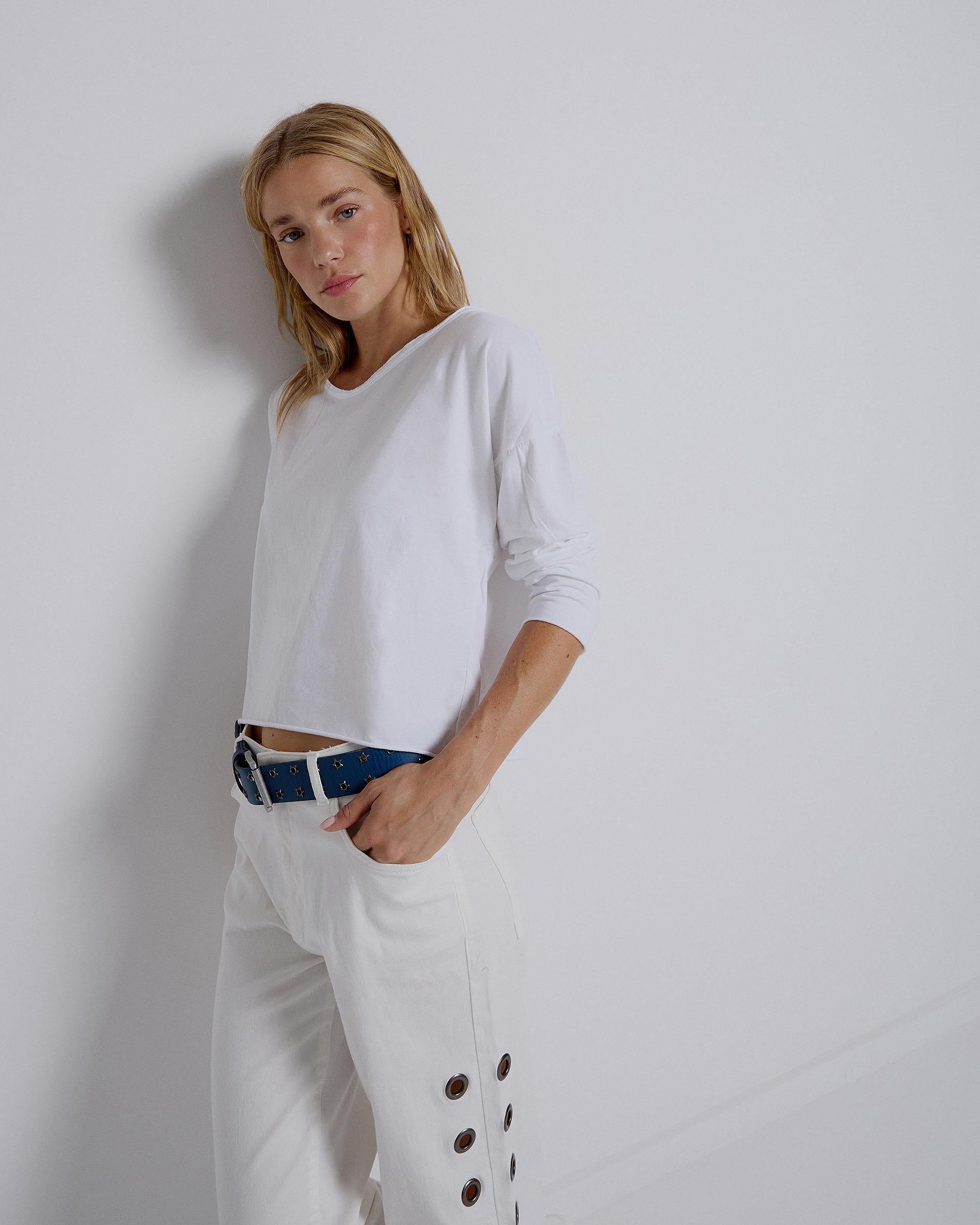 Camiseta básica de color blanco de manga larga con cuello pico.