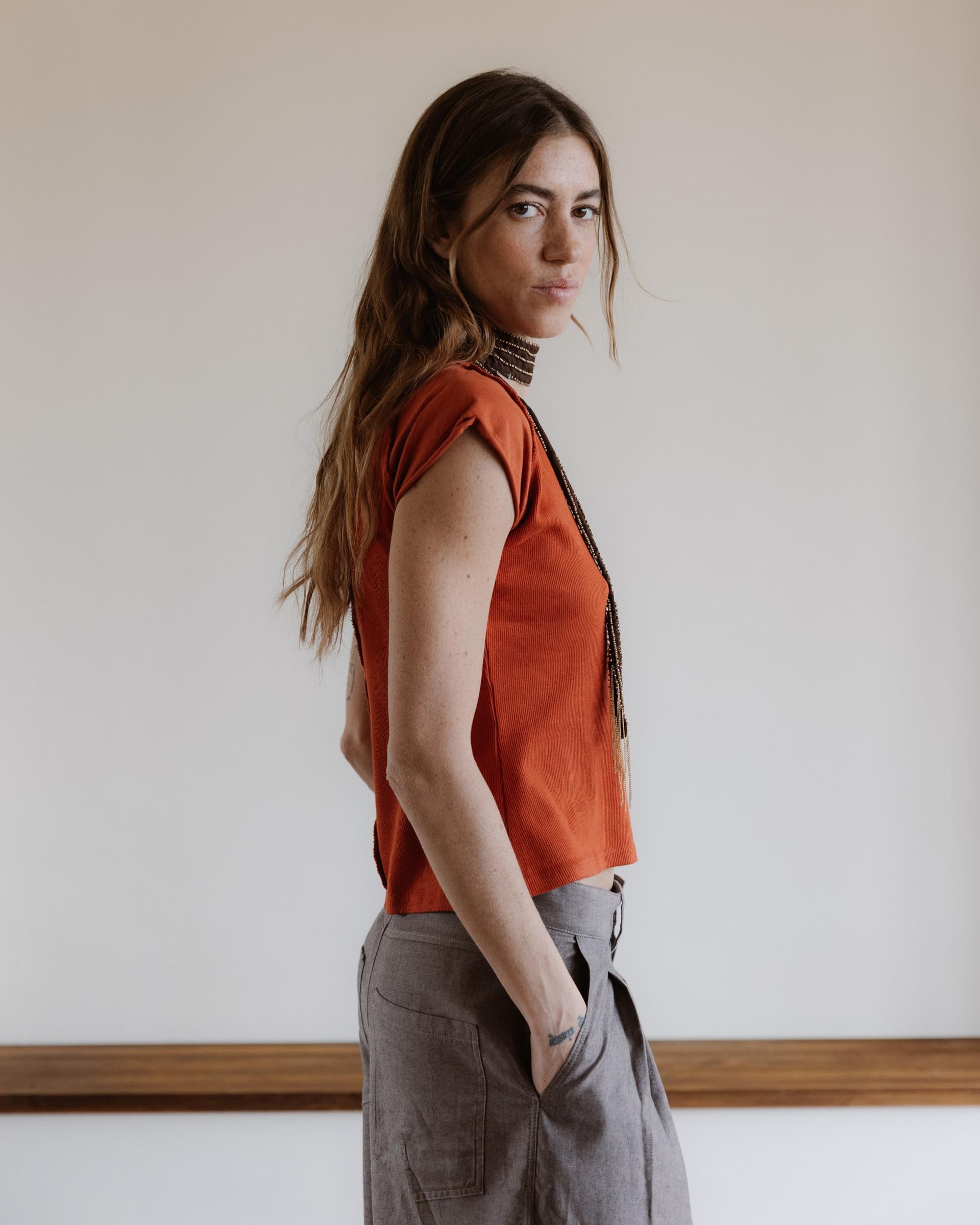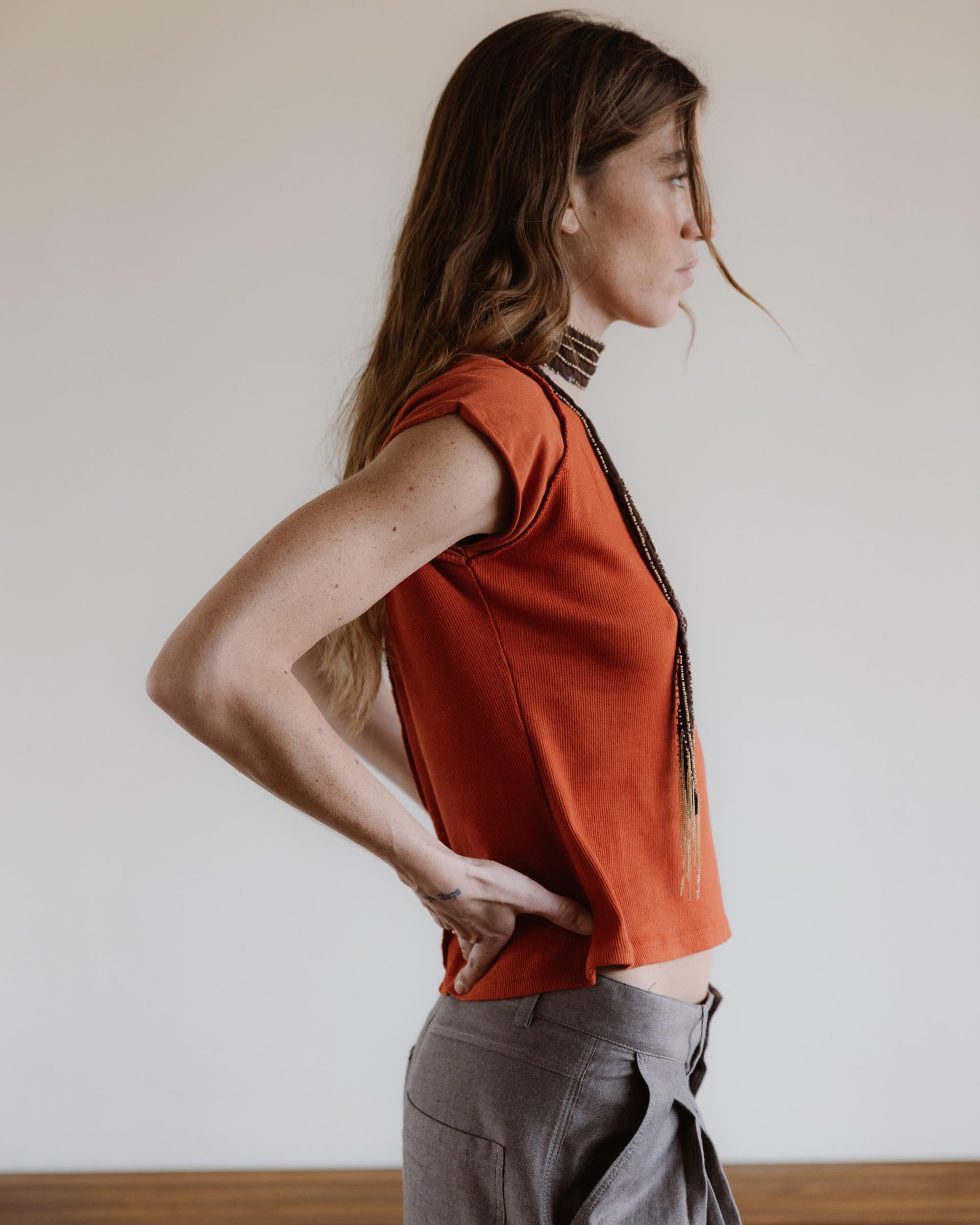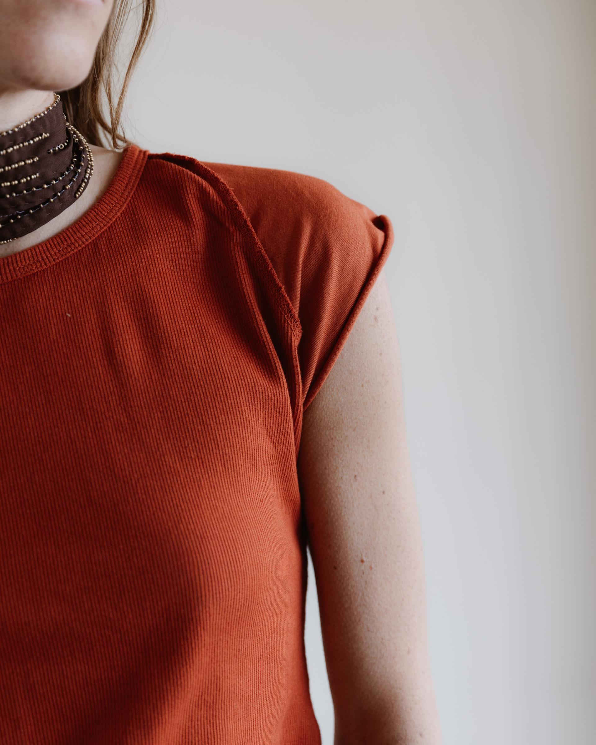 Camiseta ajustada en color naranja, con media manga y detalle de manga ranglan.