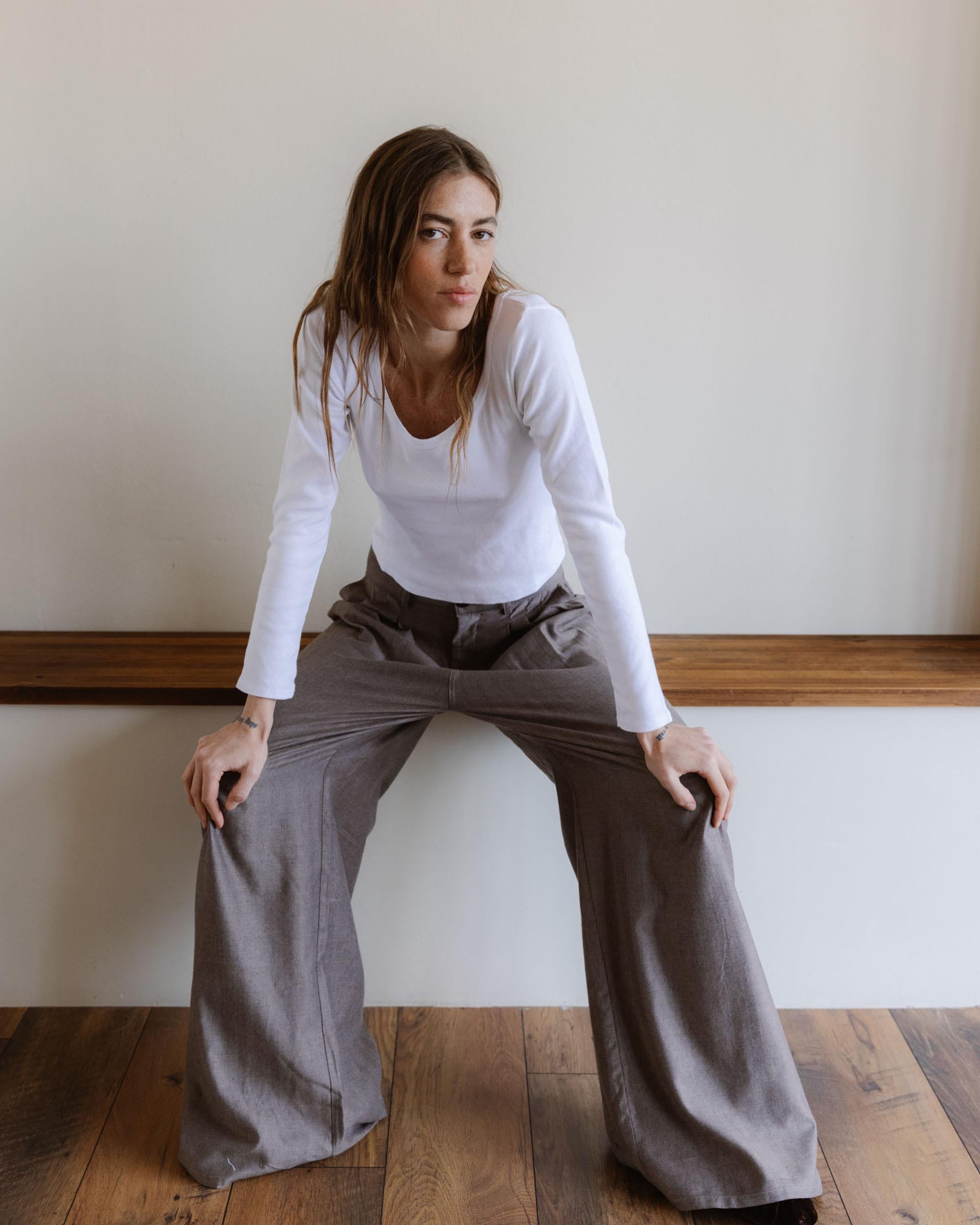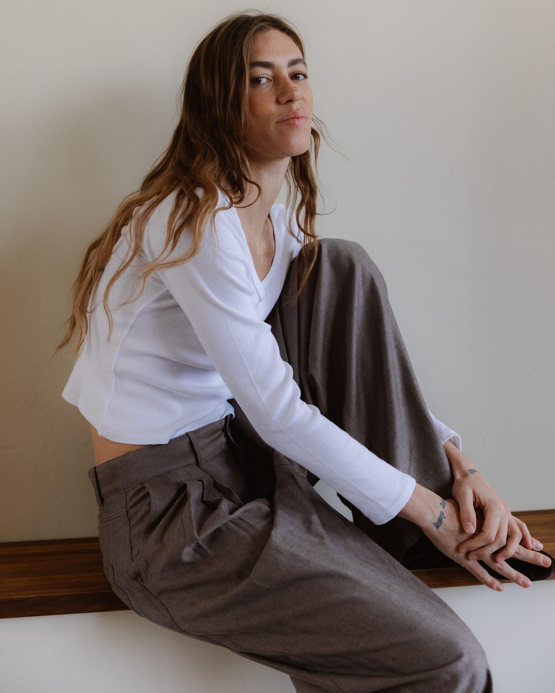 Camiseta de rib con escote redondo y manga larga, en color blanco.