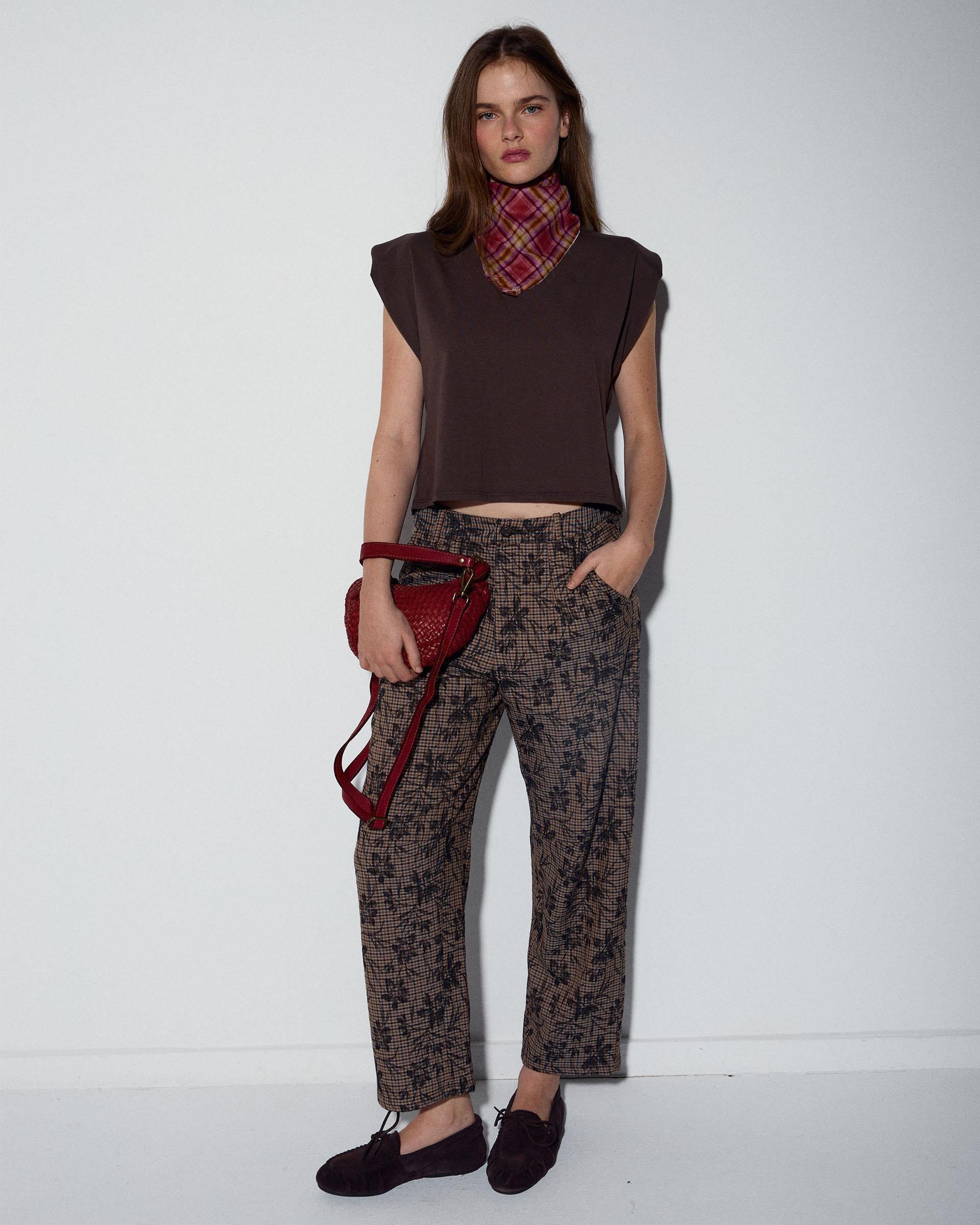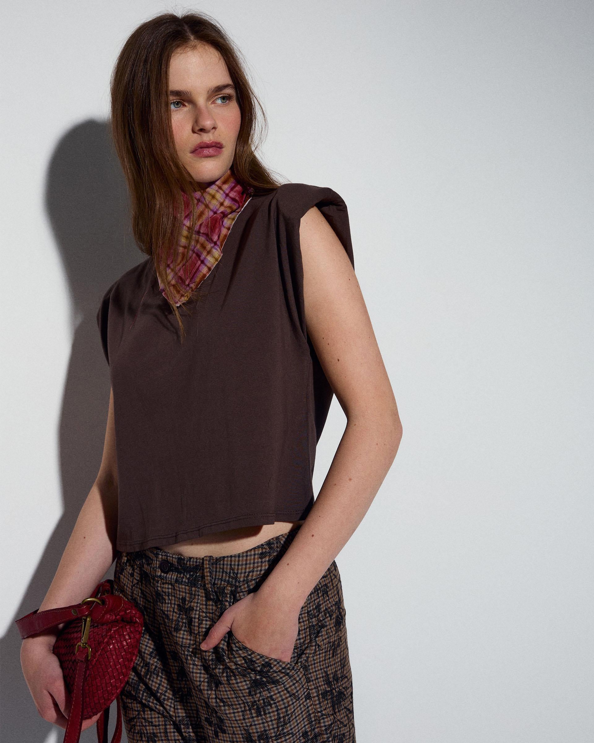 Camiseta sin mangas de color marrón con detalle de hombreras.