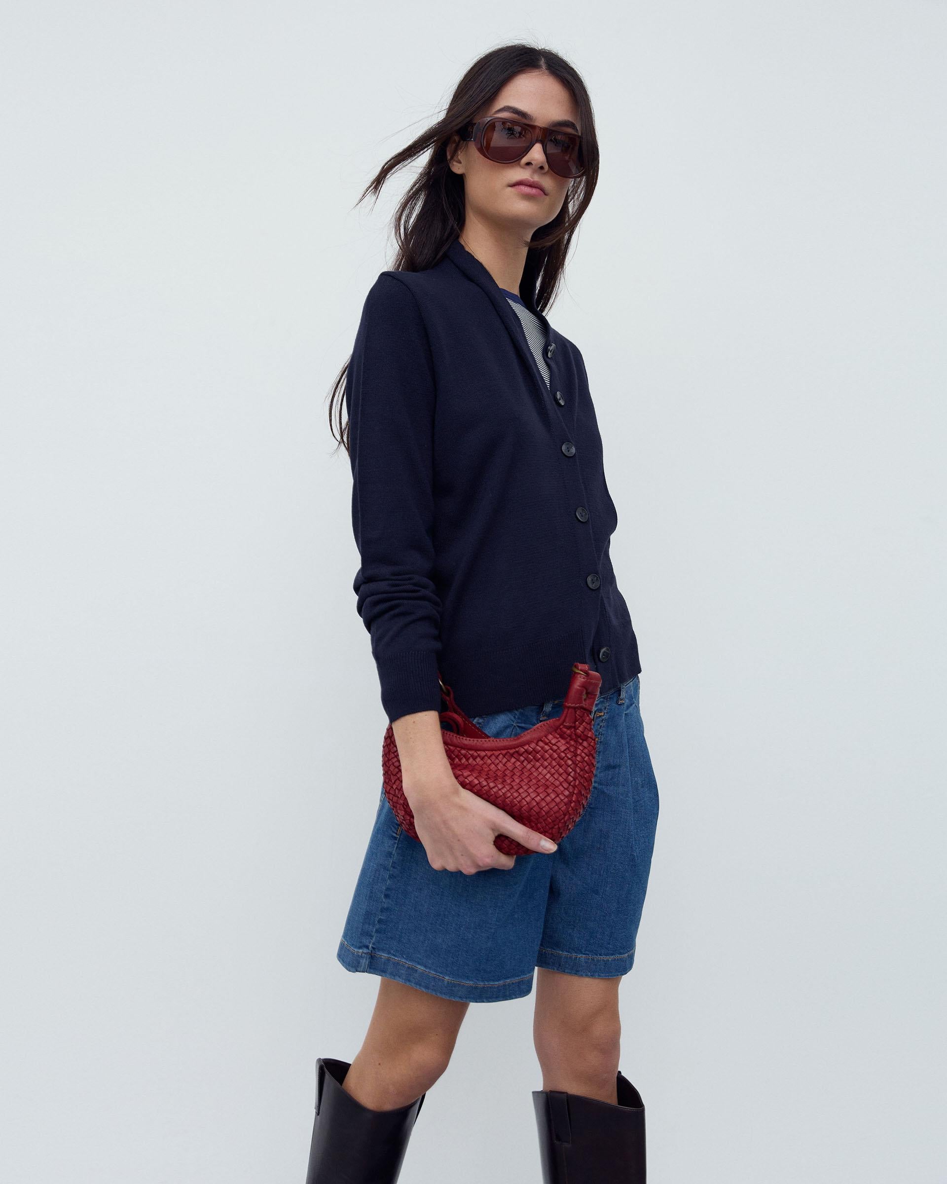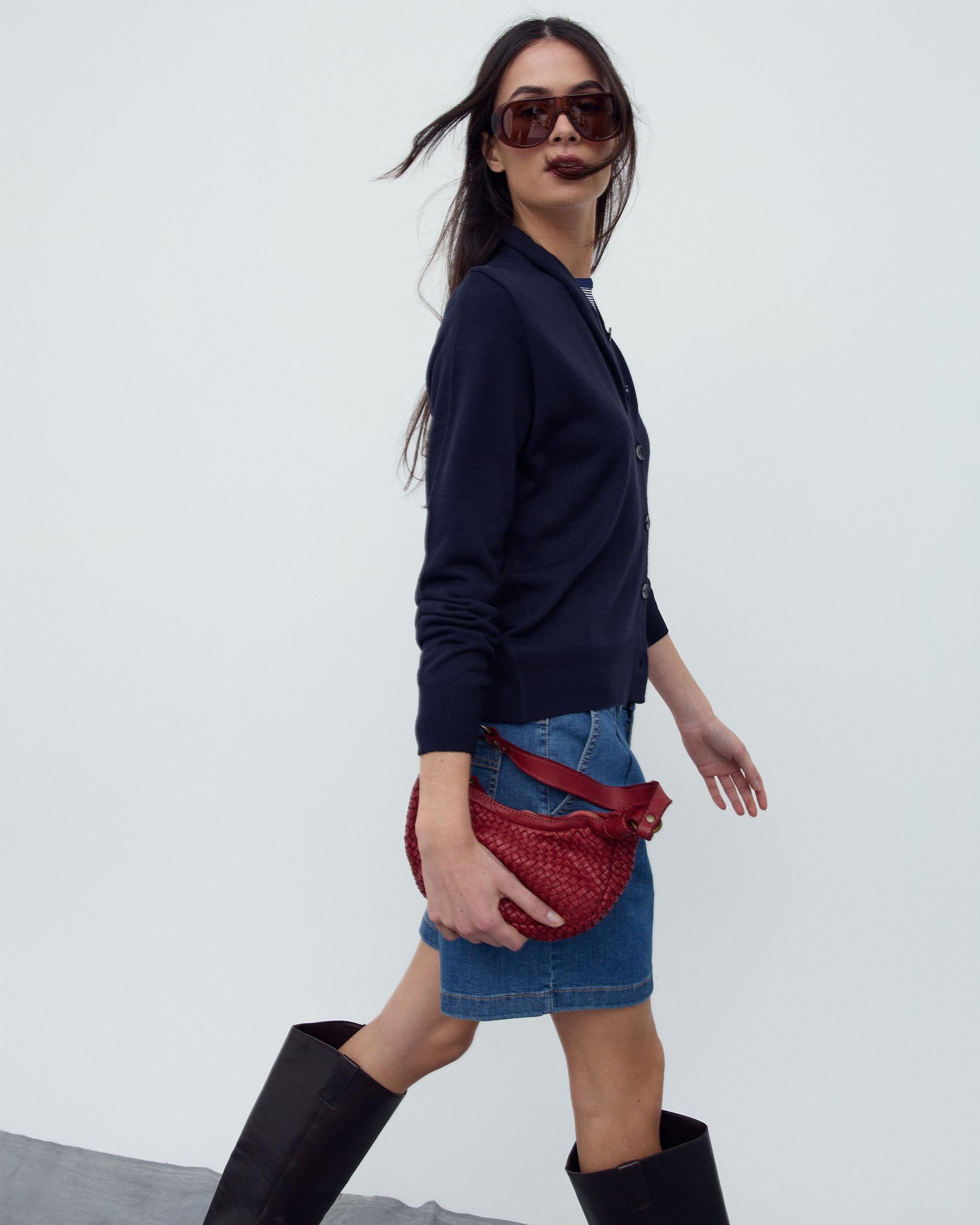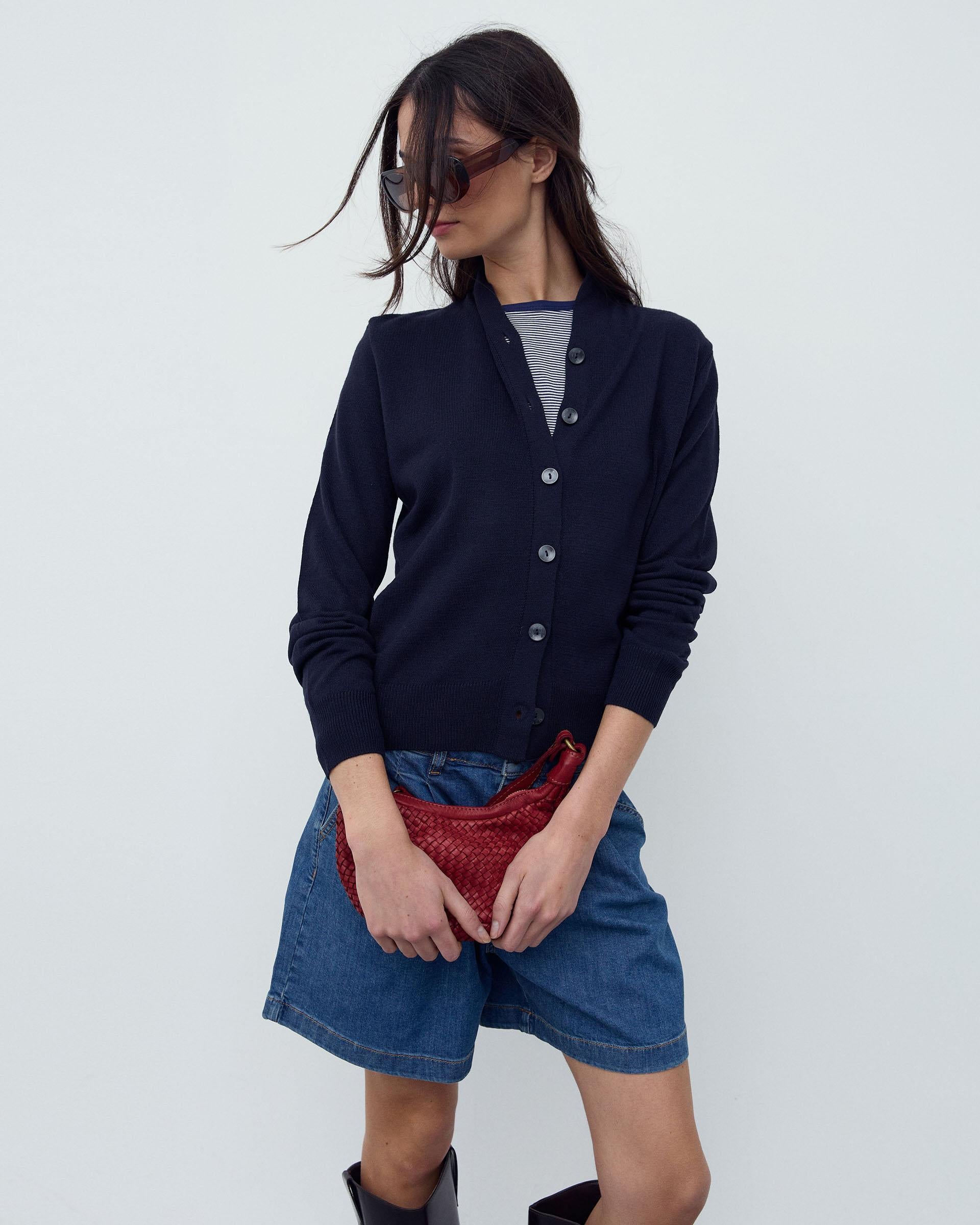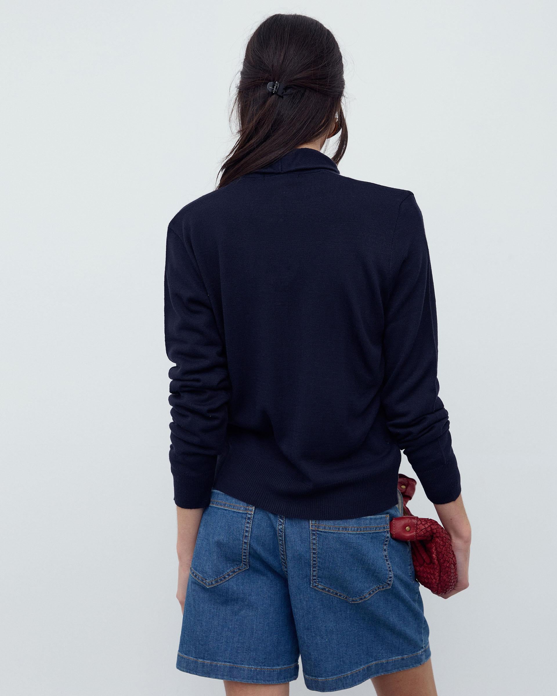 Chaqueta de punto en color azul marino con cuello subido y en pico.