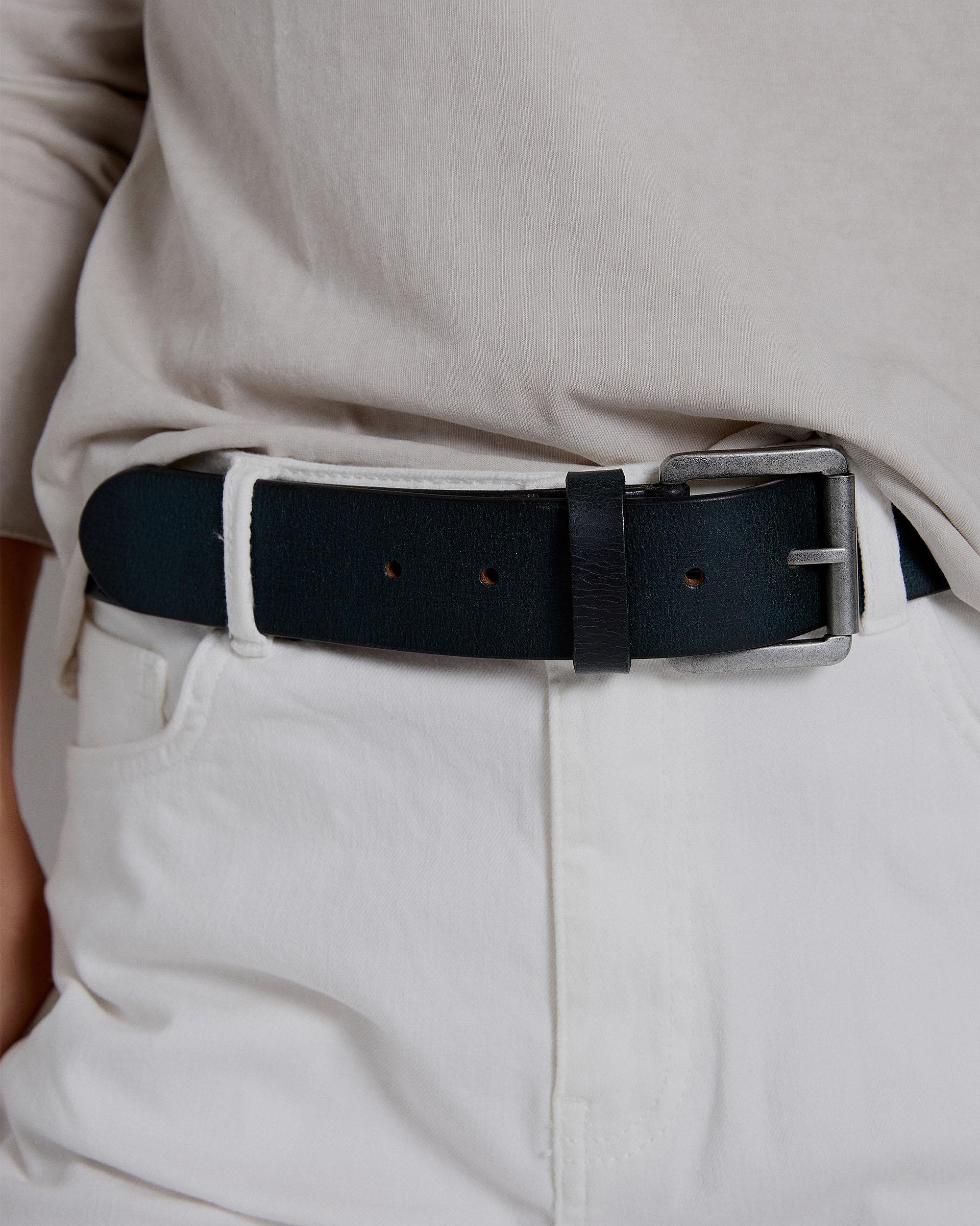 Cinturón de piel azul petróleo con apliques y tachuelas en plata vieja.
