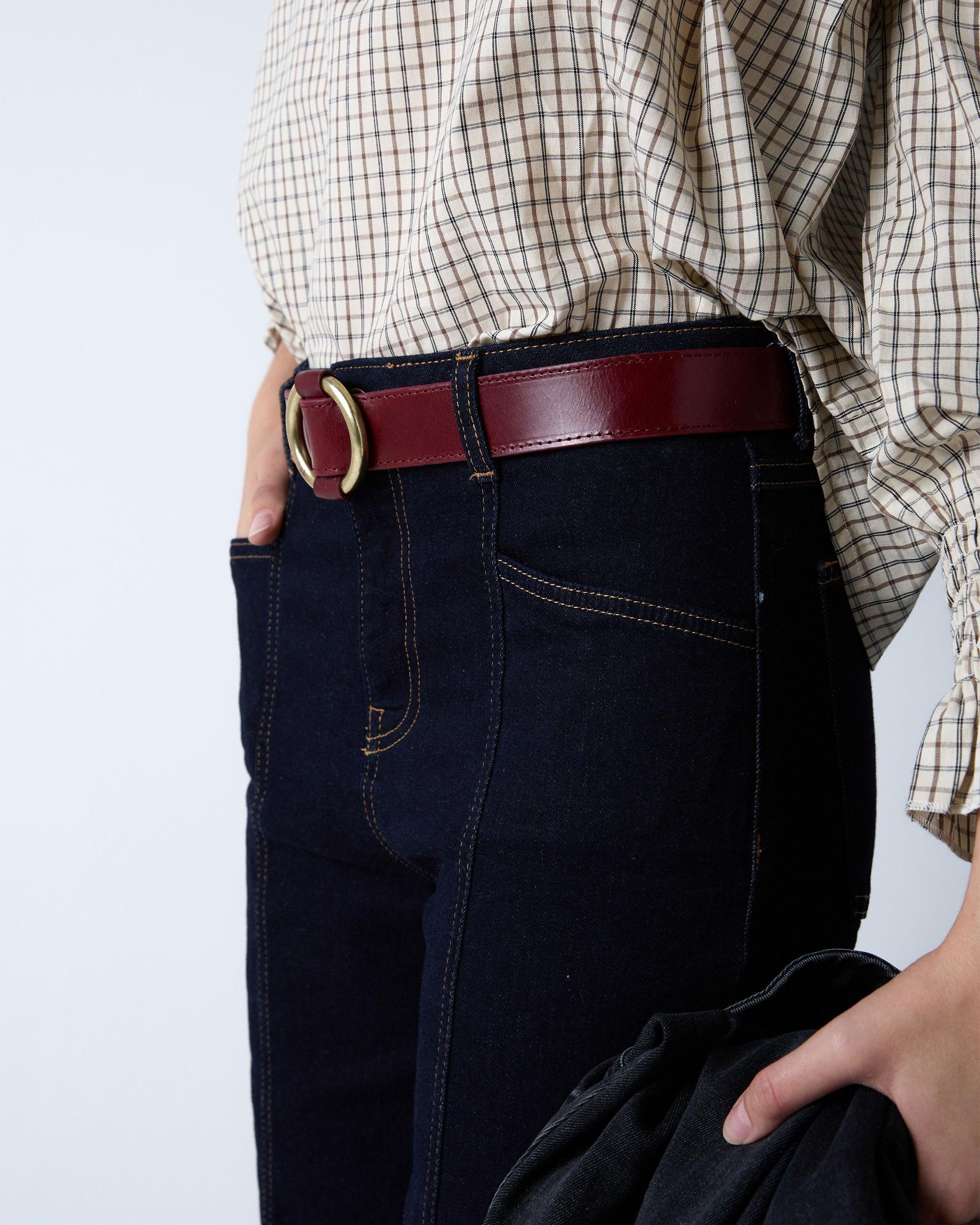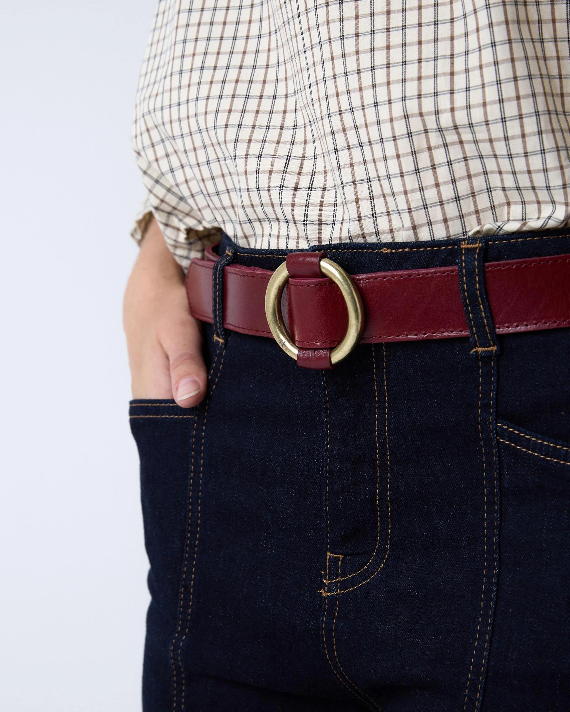 Cinturón de piel en color rojo con detalle de hebilla circular.