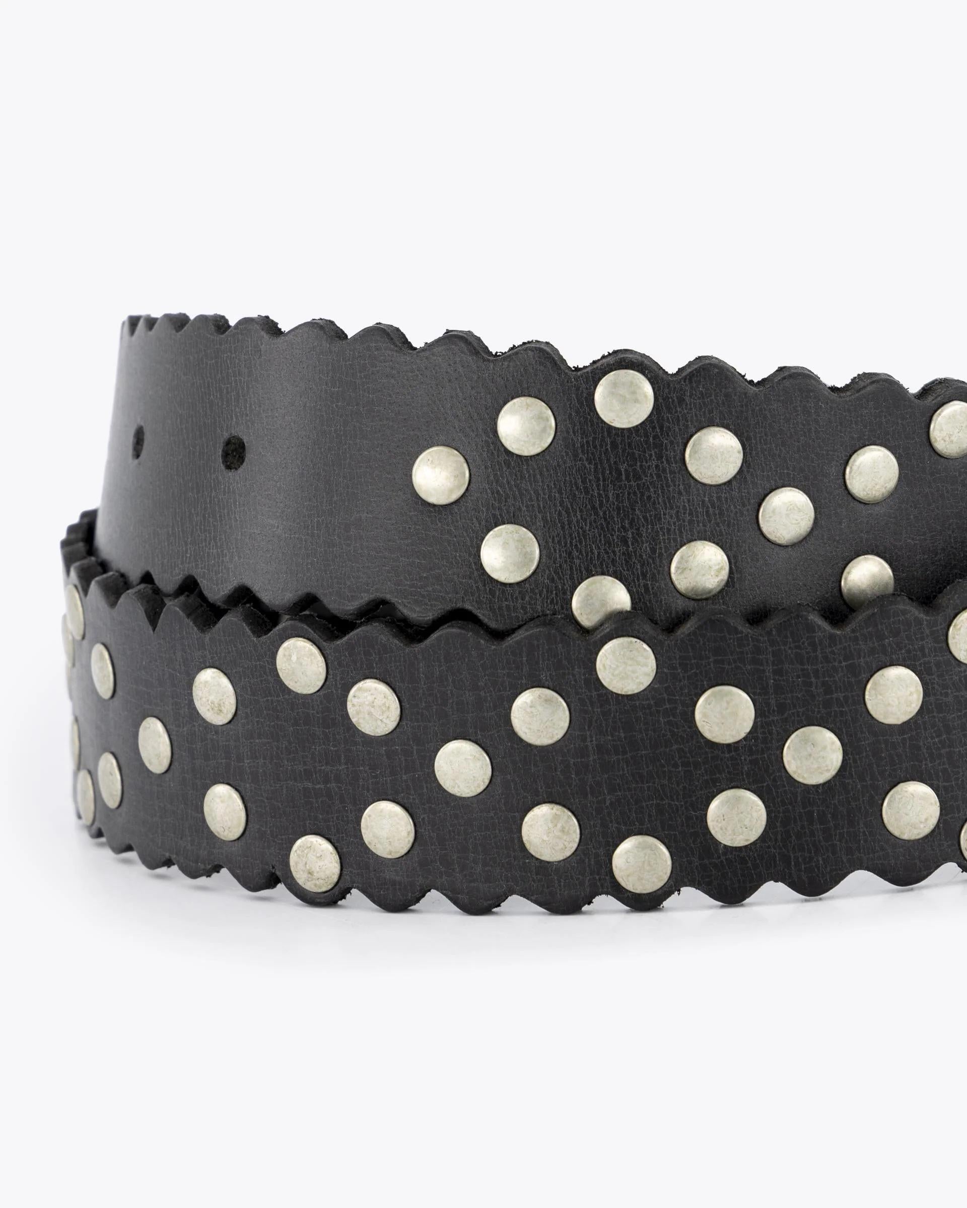 Cinturón de piel de color negro. Detalle de ondas y tachuelas de color plata vieja.