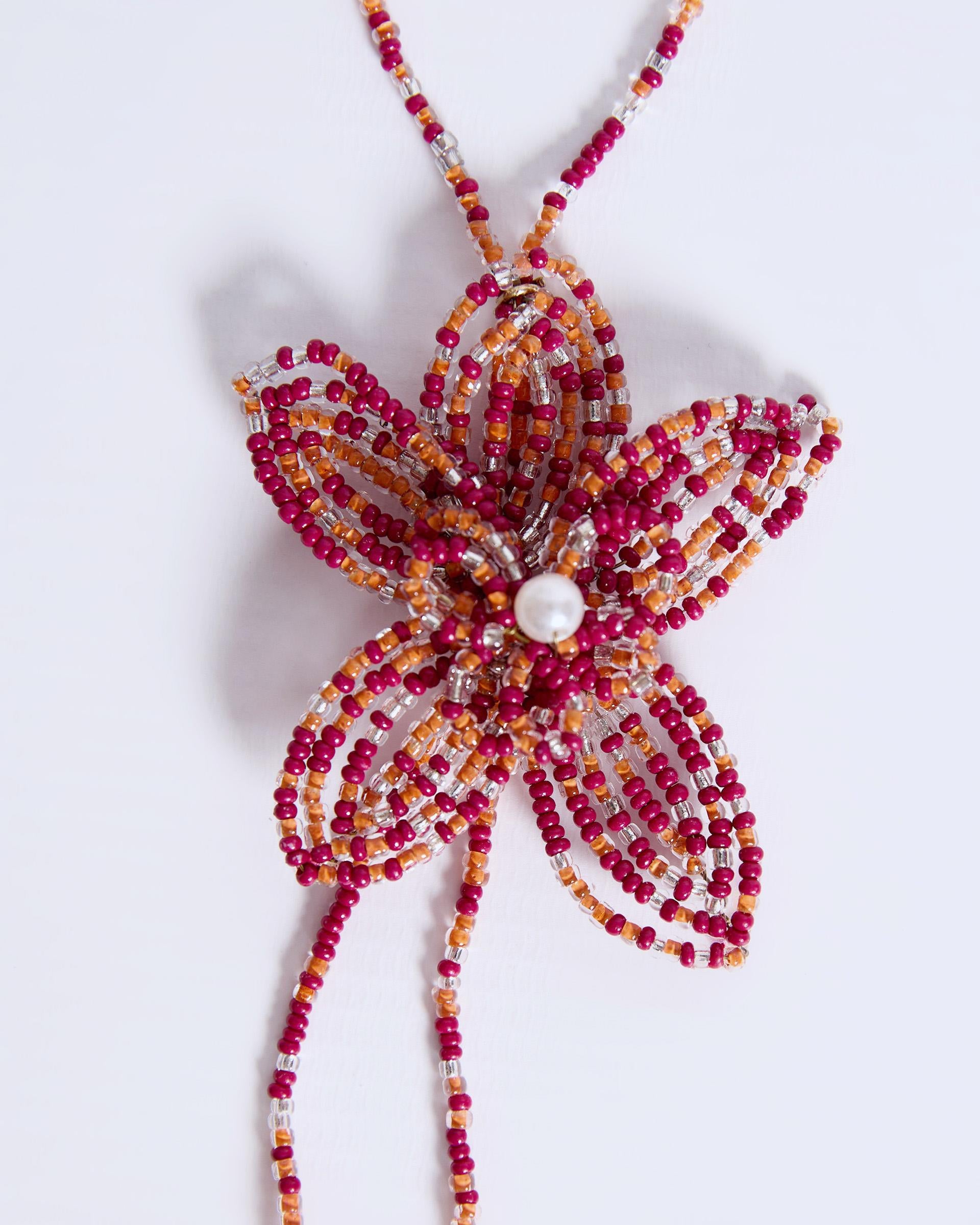 Collar largo con forma de flor de bolitas en tonos grnaates y naranjas.