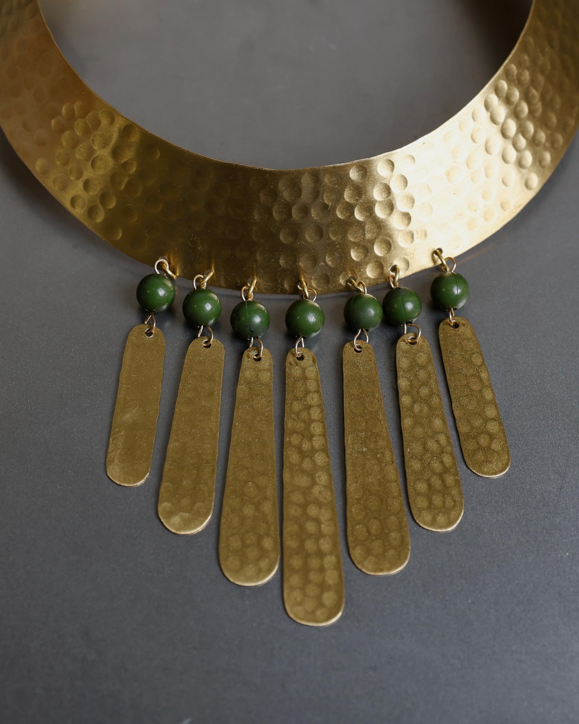 Collar rígido de color dorado con bolitas de color verde.