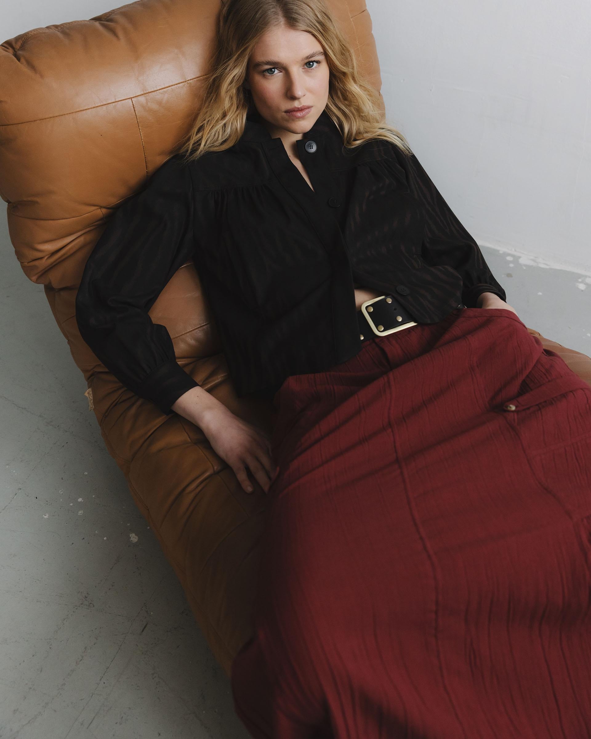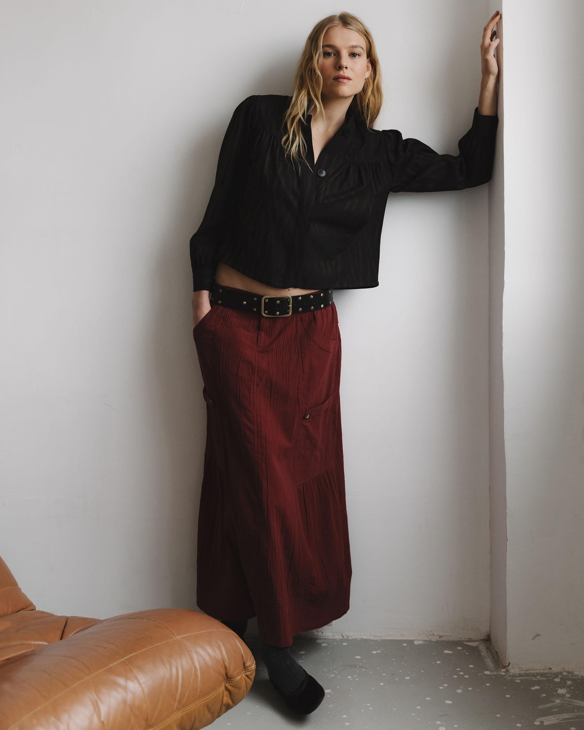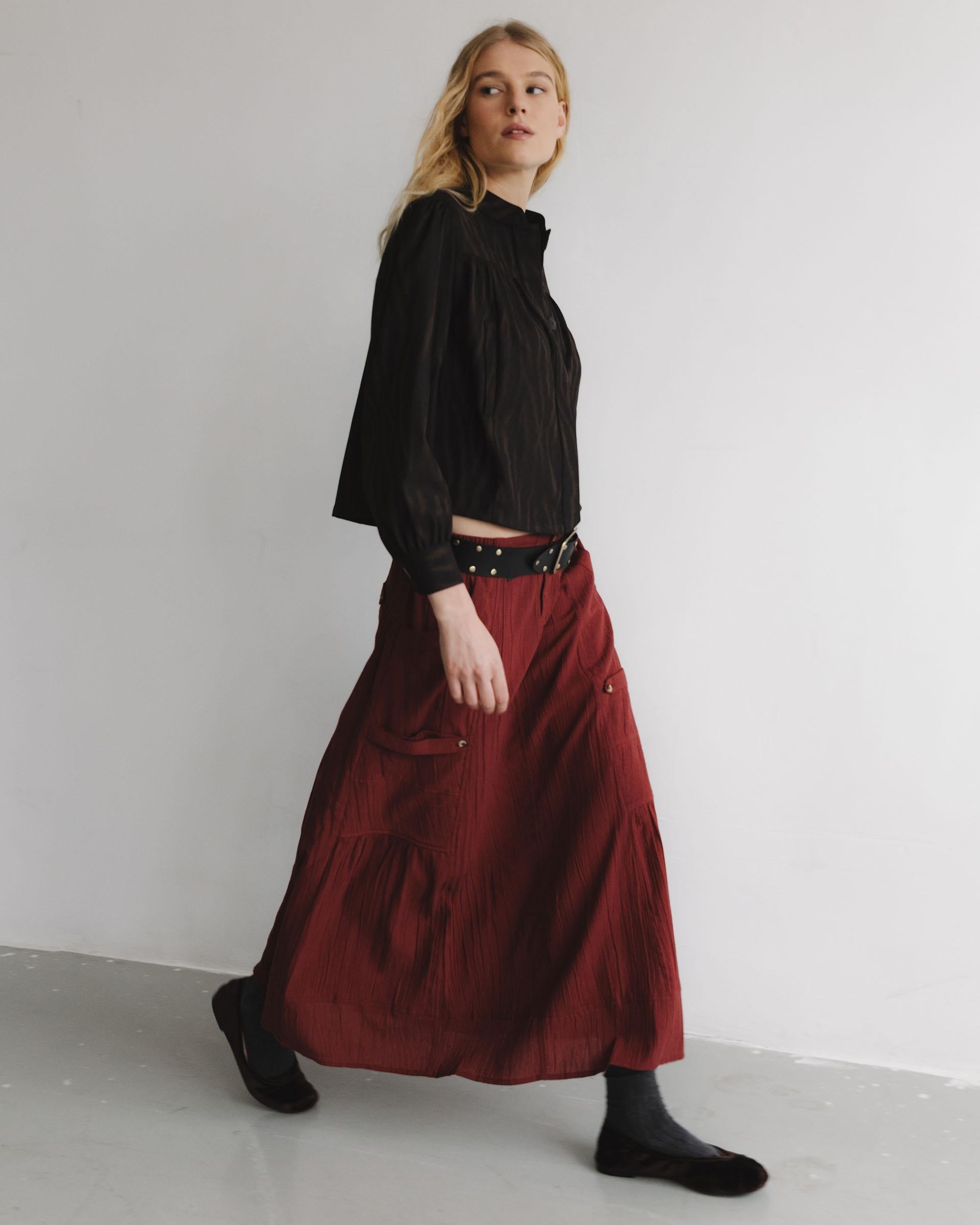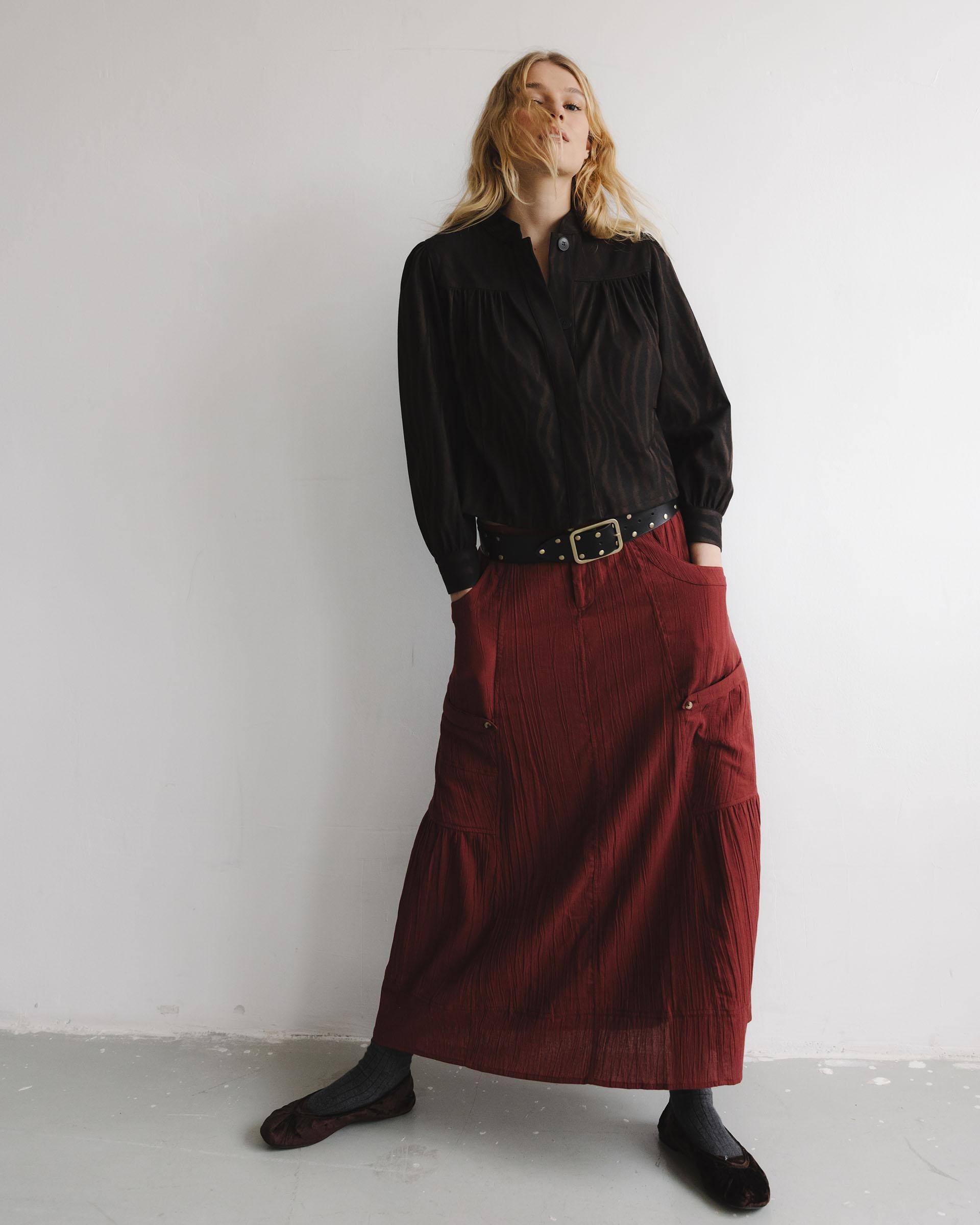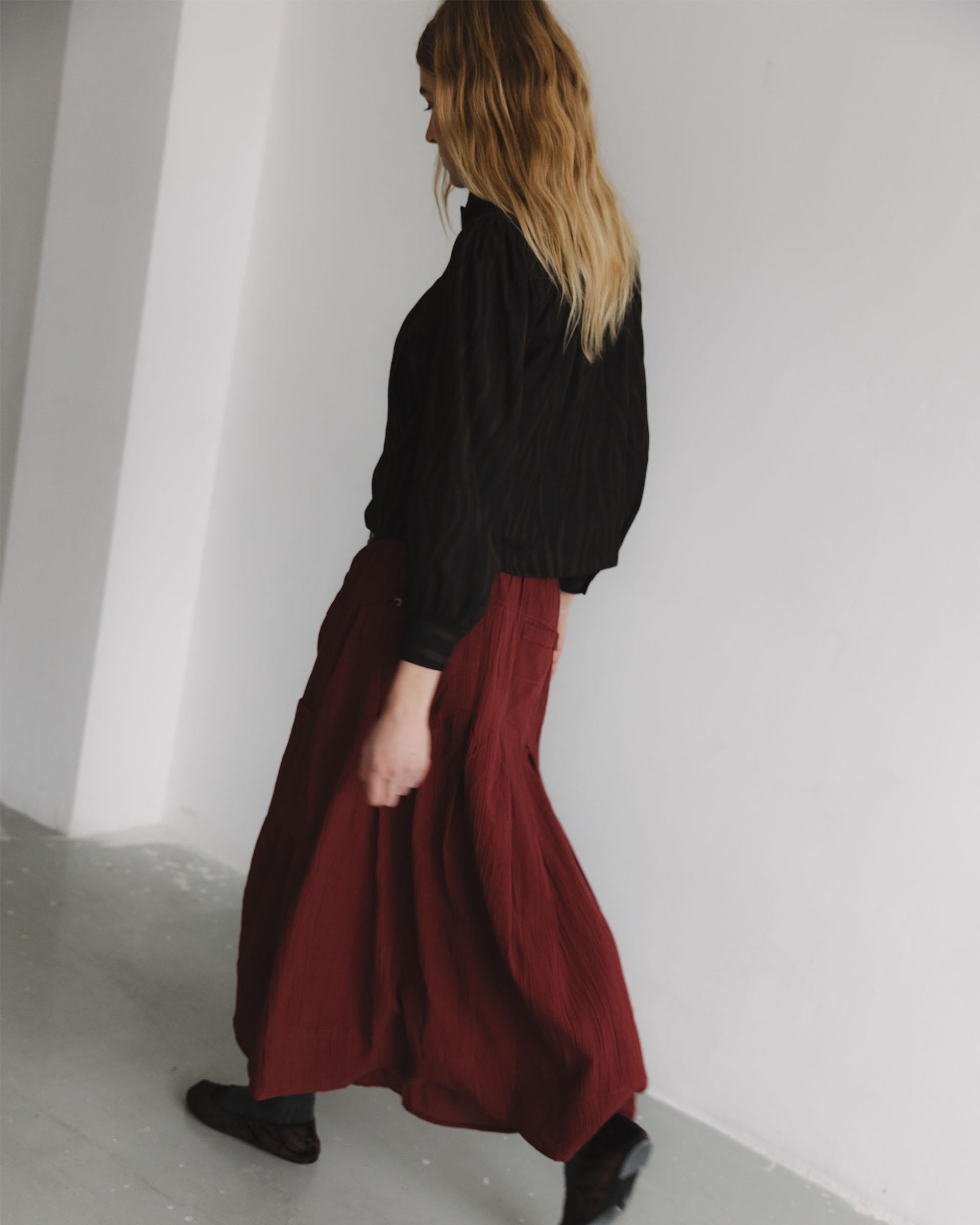 Falda larga de color granate con goma en cinturilla, detalle de bolsillos en laterales tipo cargo y cierre con cremallera y doble botón.