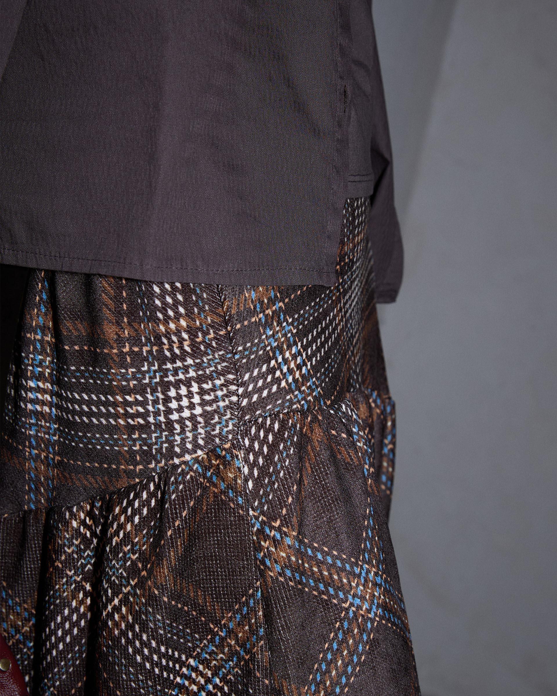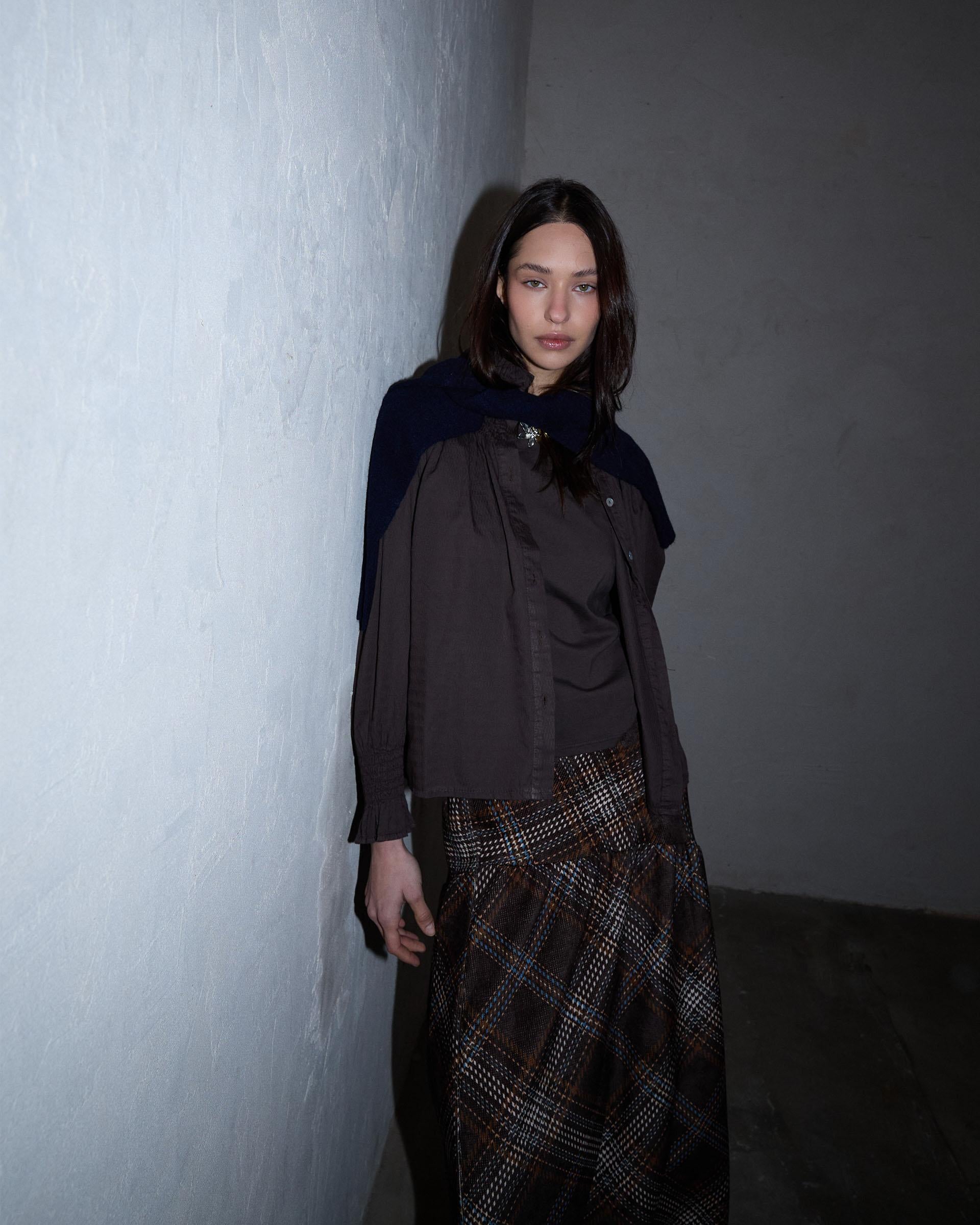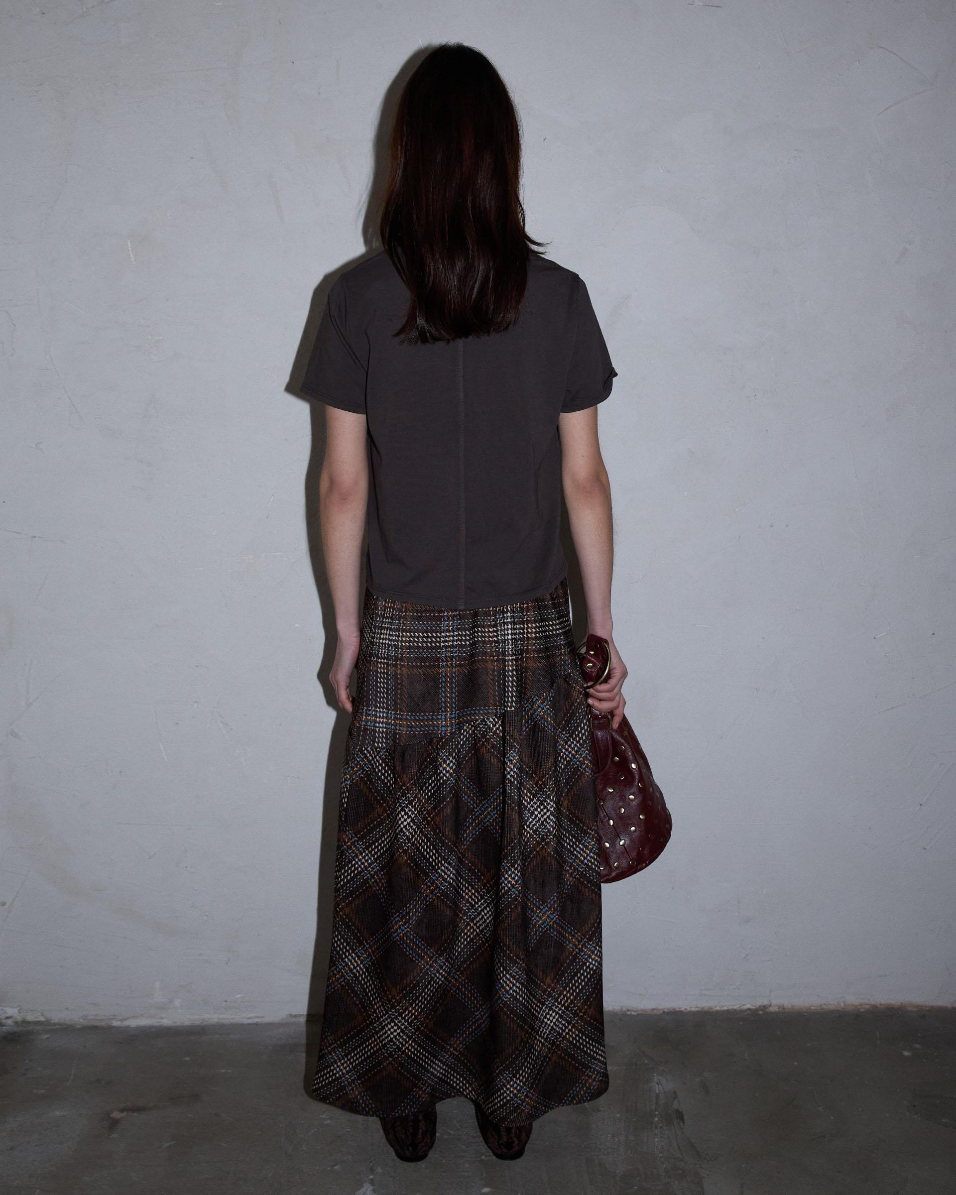 Falda larga de cuadros en color marrón con detalle de canesú asimétrico.