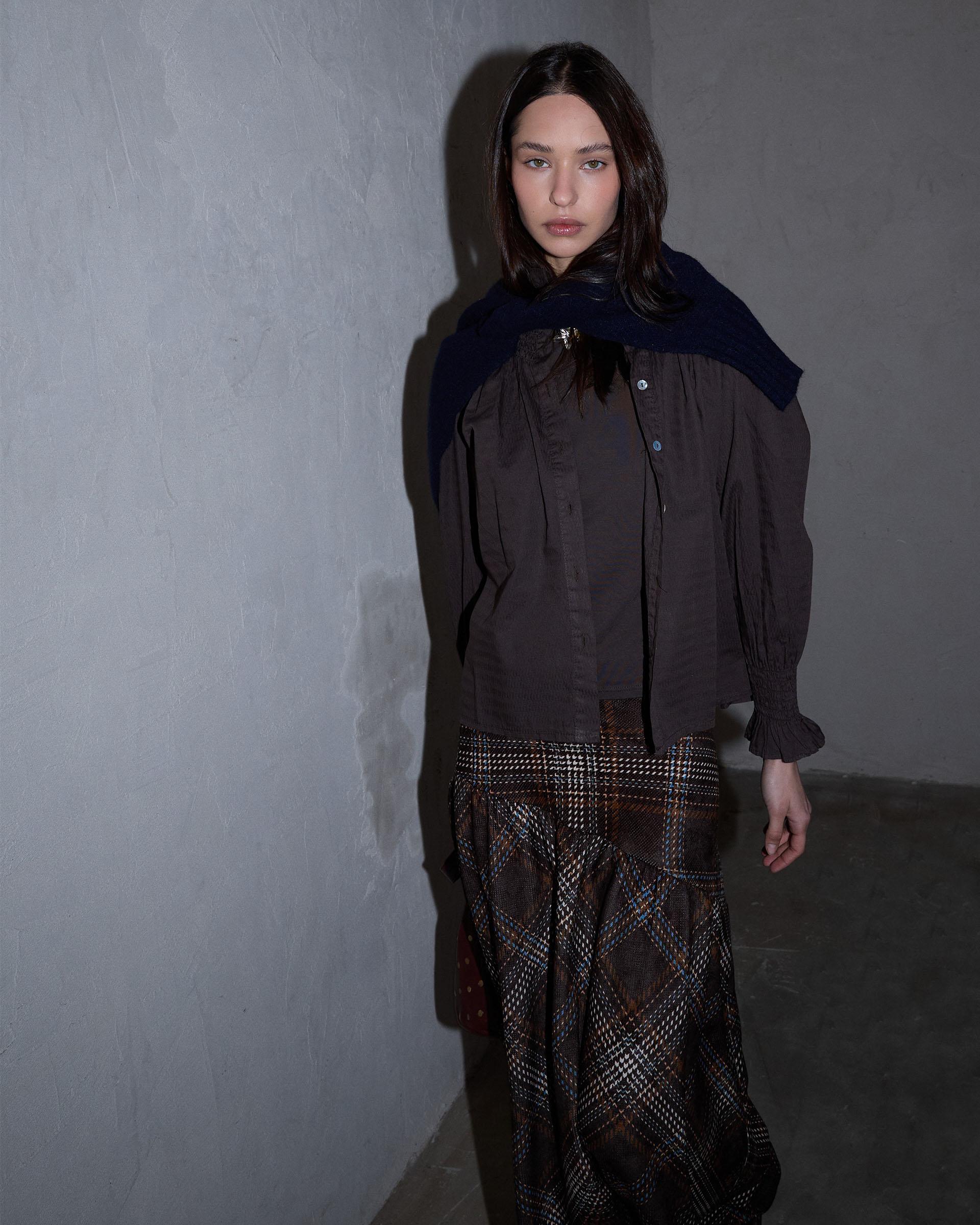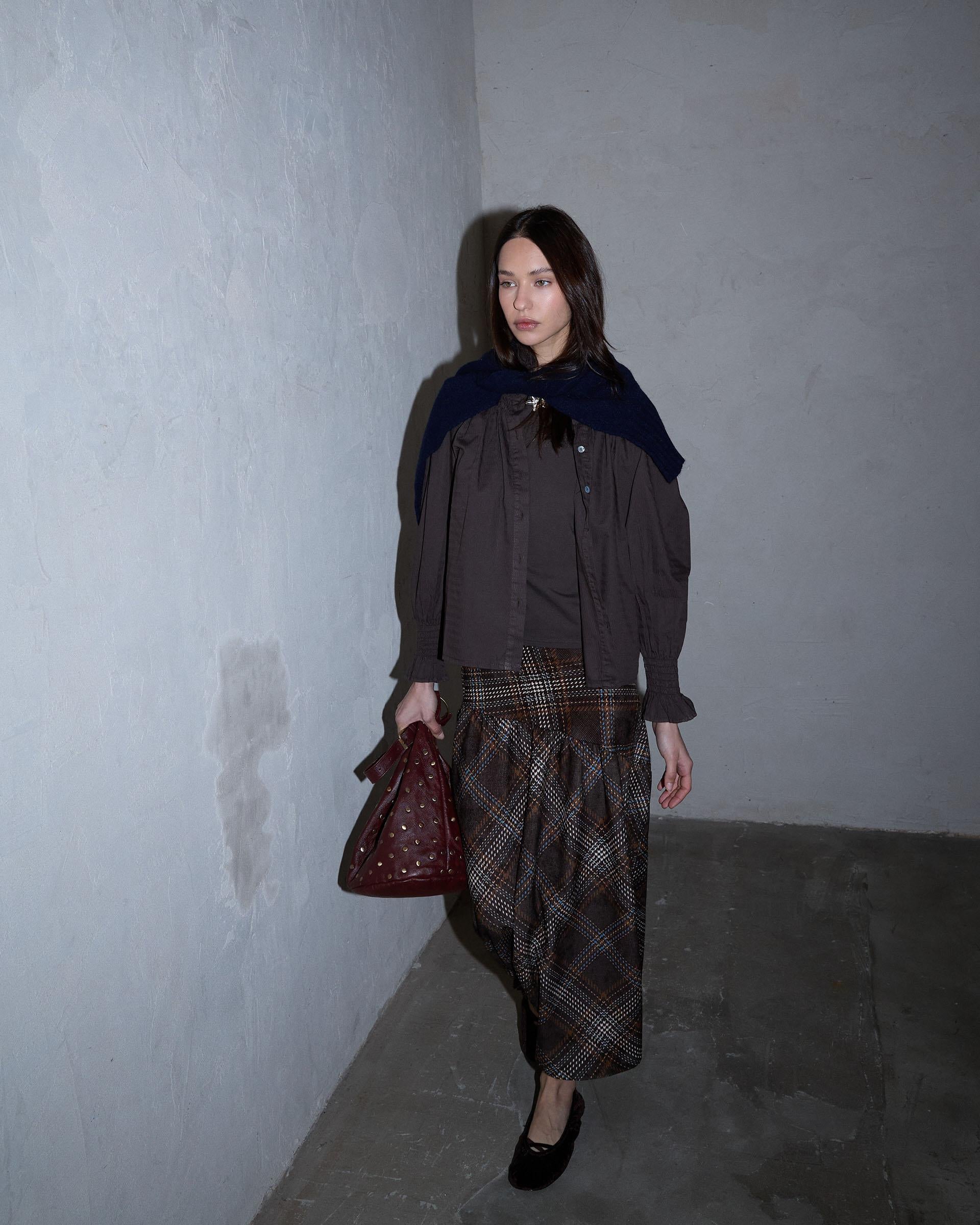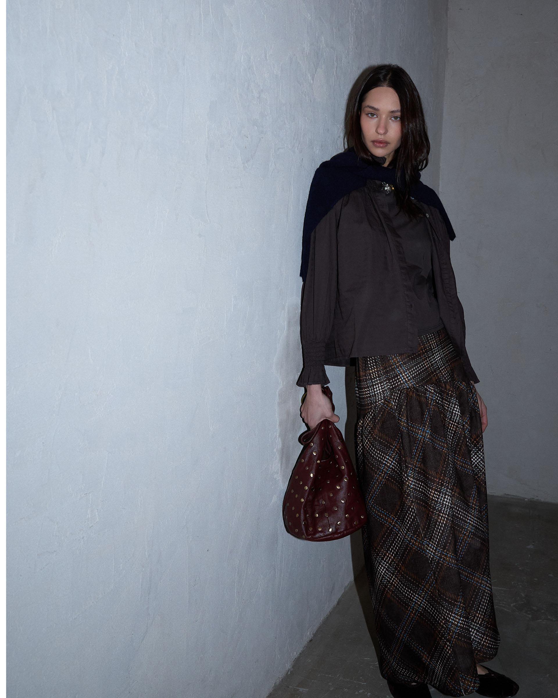 Falda larga de cuadros en color marrón con detalle de canesú asimétrico.