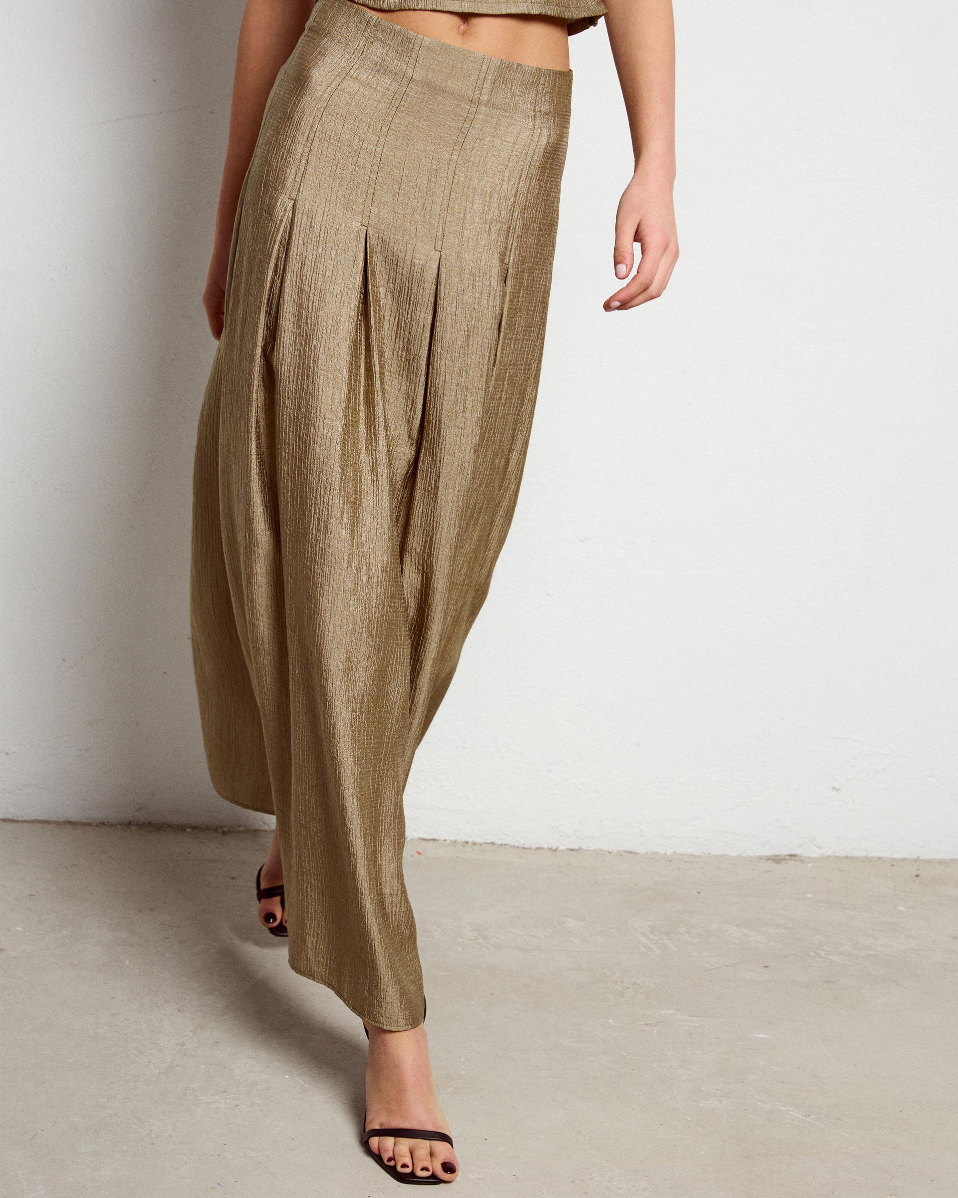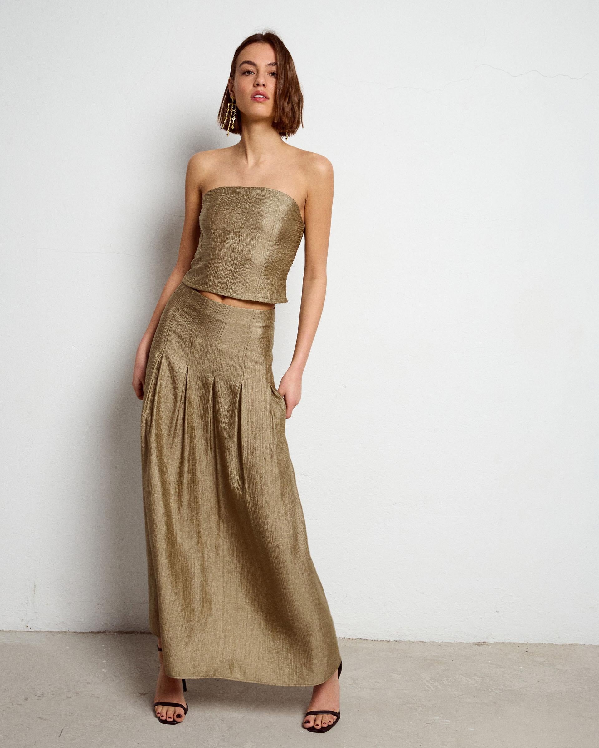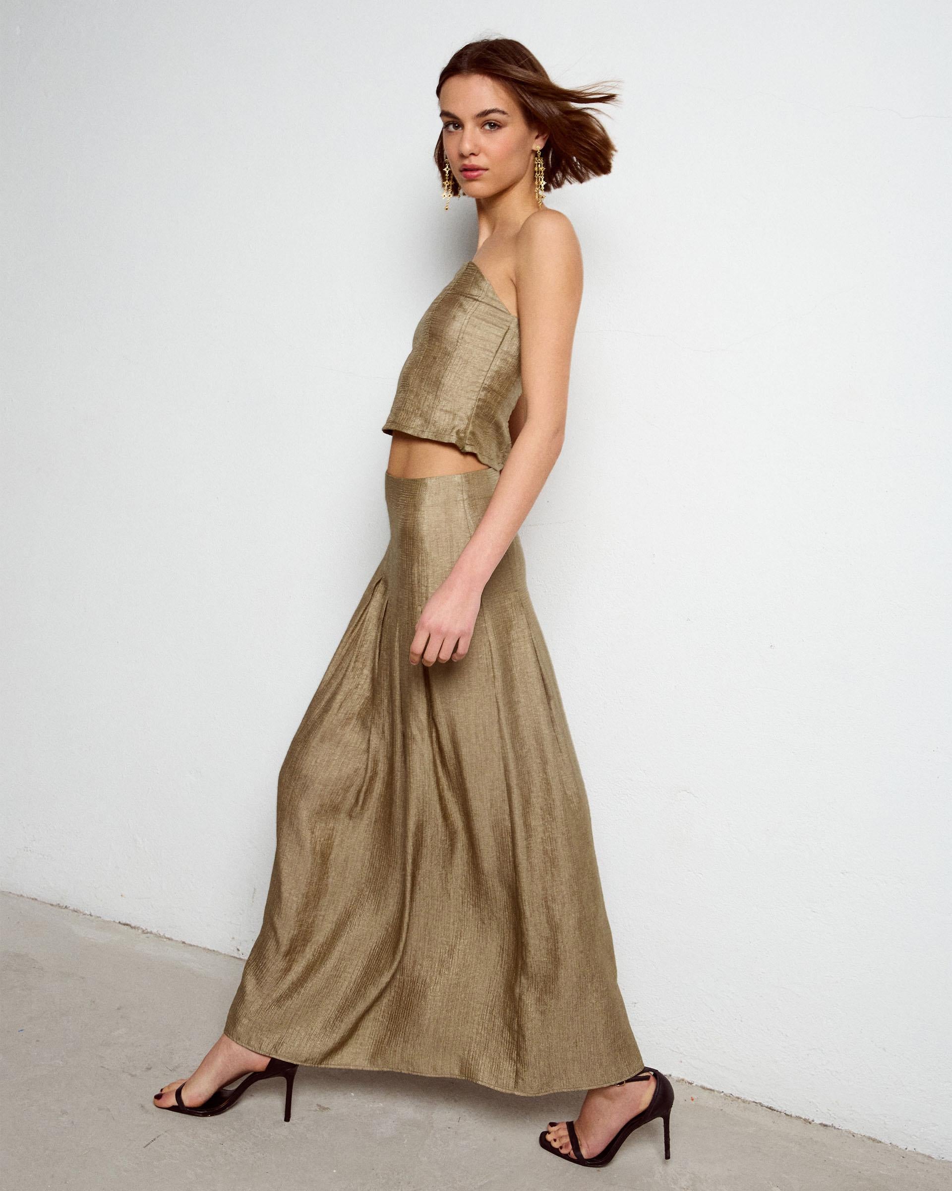 Falda larga en color verde con brillo, detalle de tablas y costuras y cierre con cremallera.