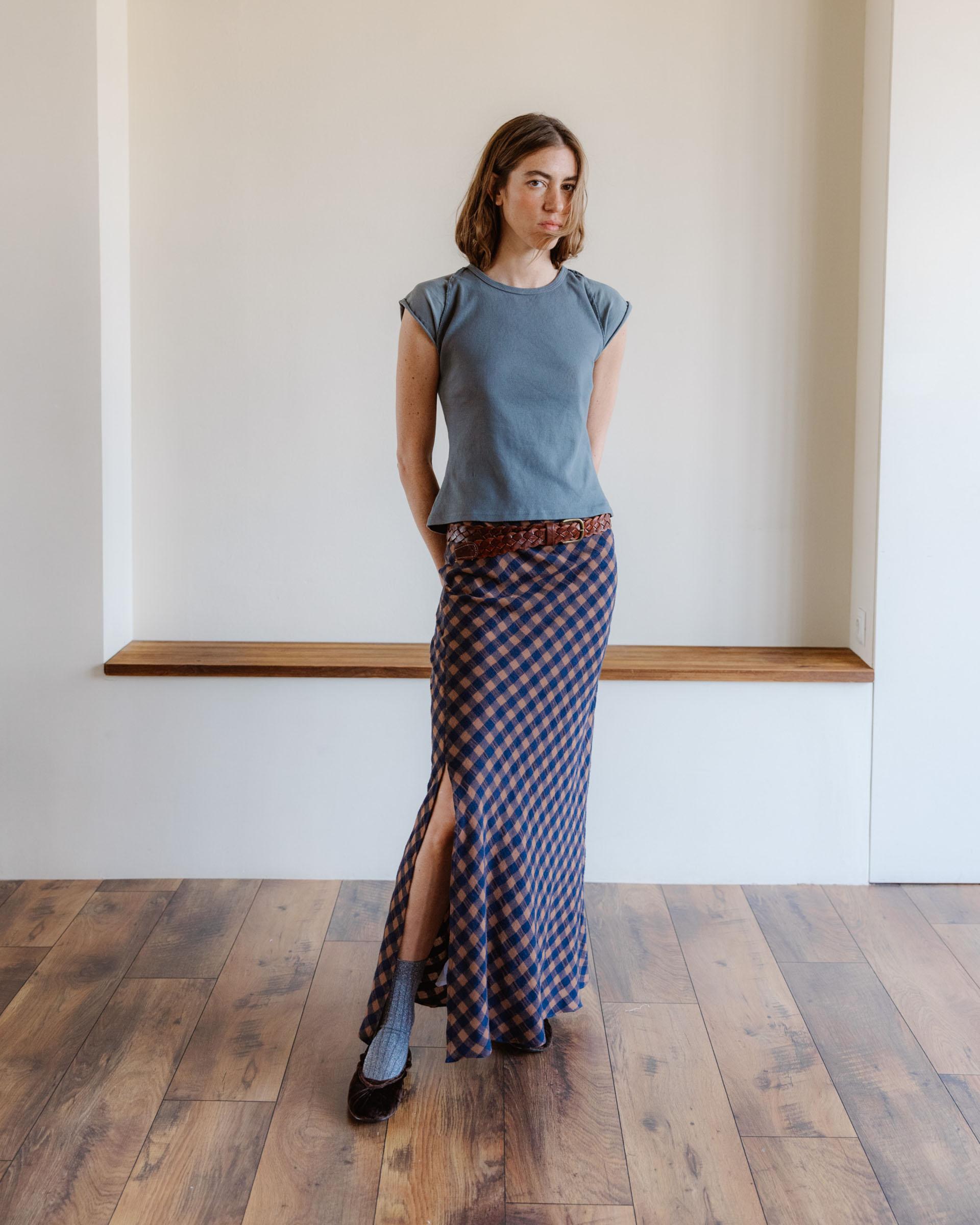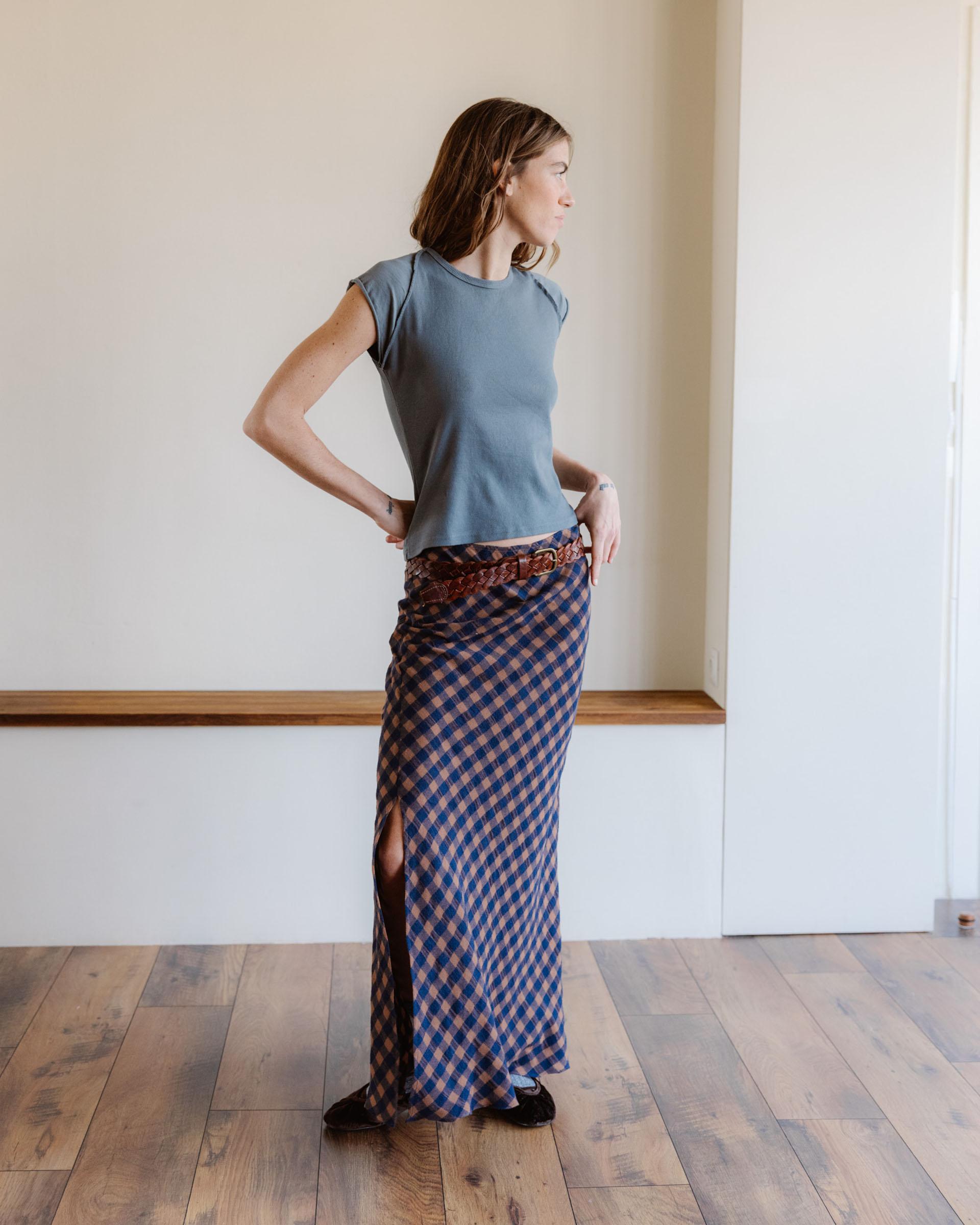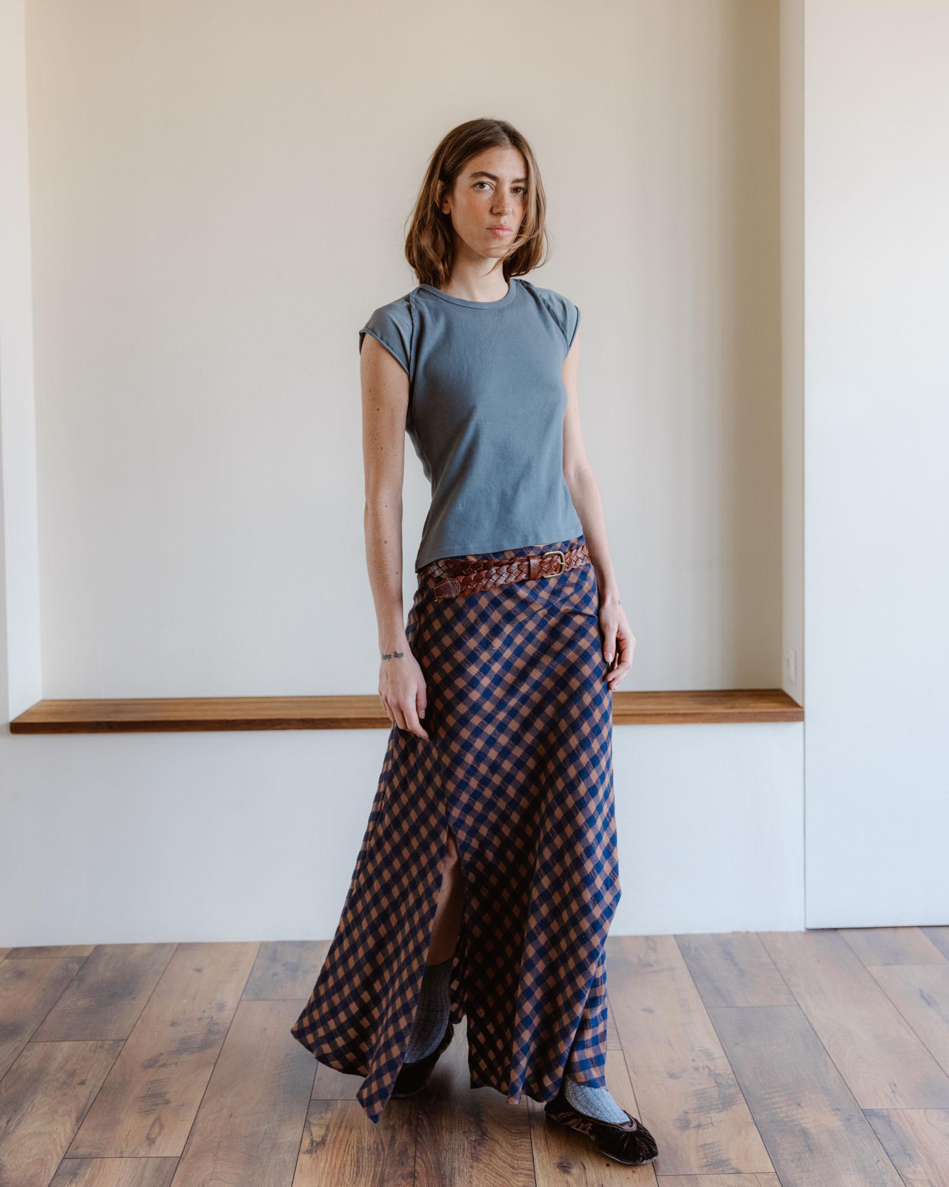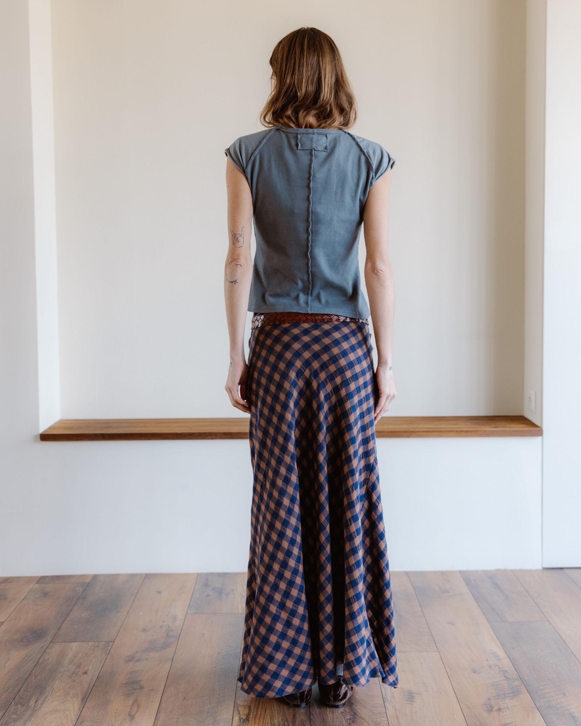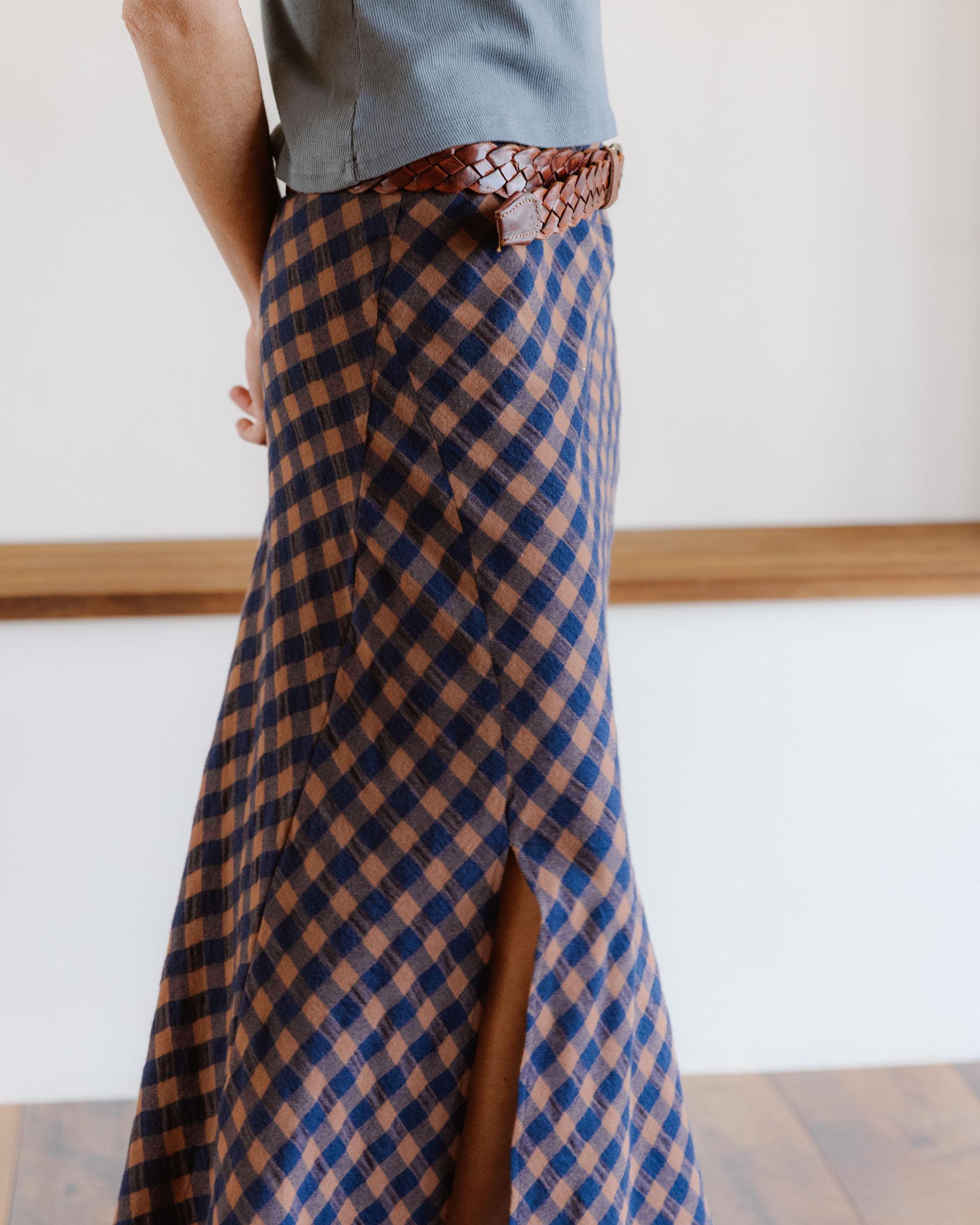 Falda larga con estampado de cuadros en azul marino y marrón con goma en cinturilla.