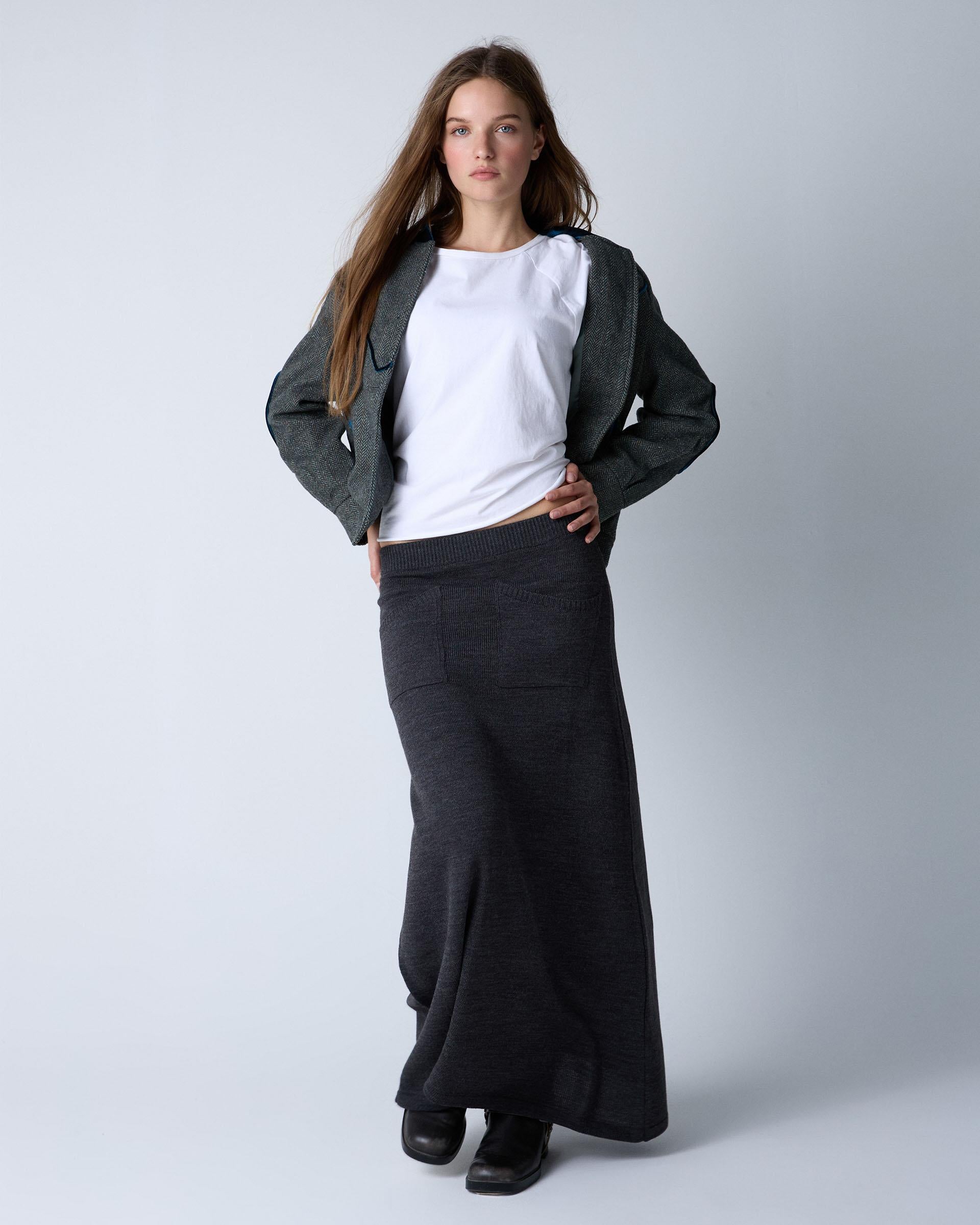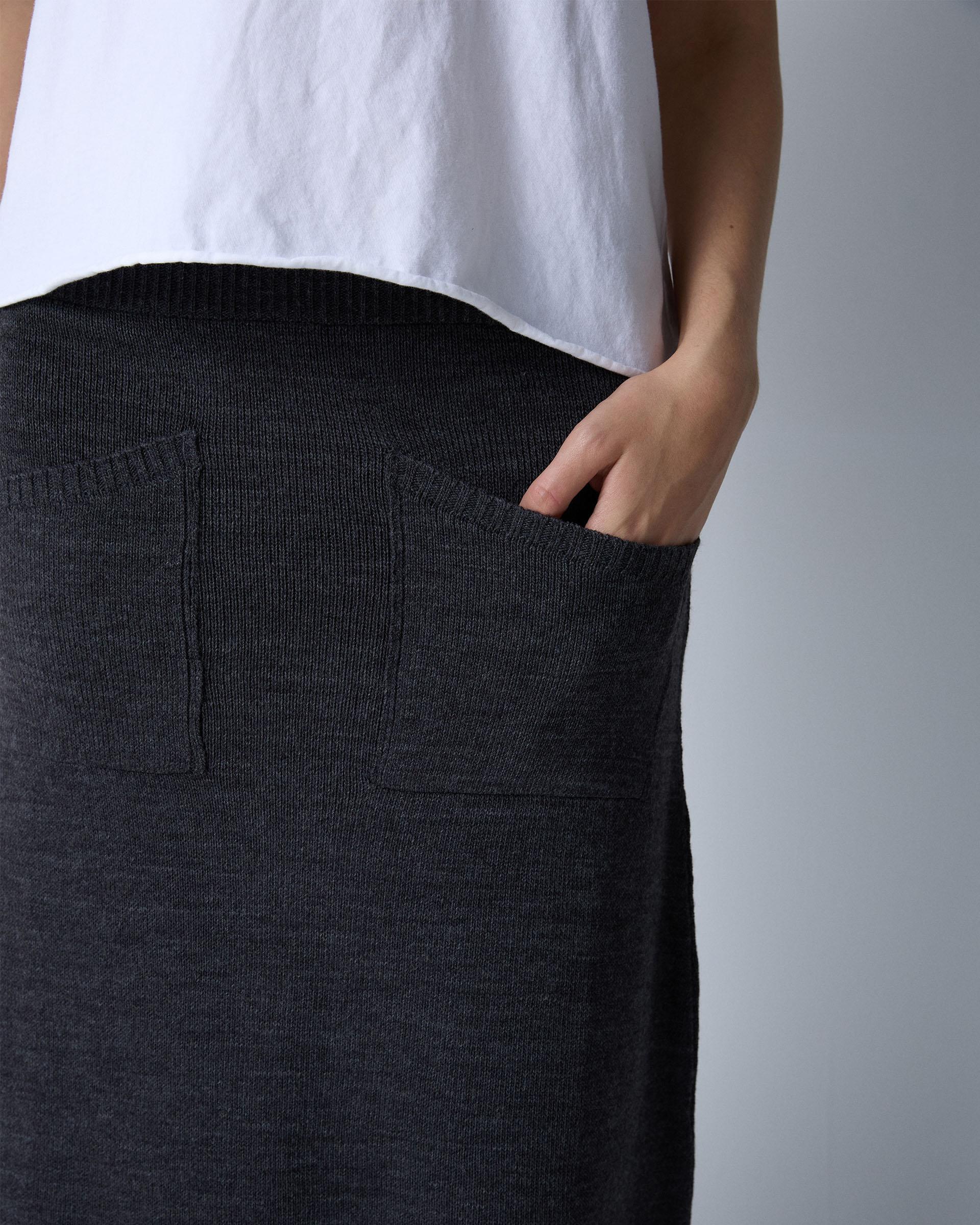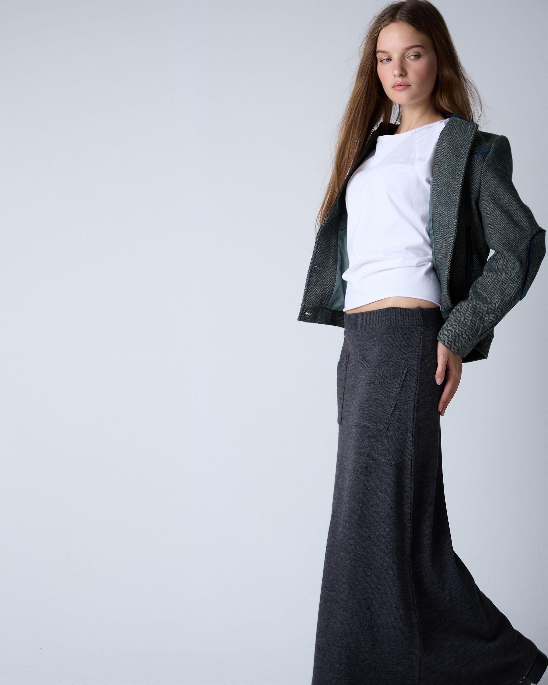 Falda larga de punto de color antracita con bolsillos en delantero y goma en cinturilla.