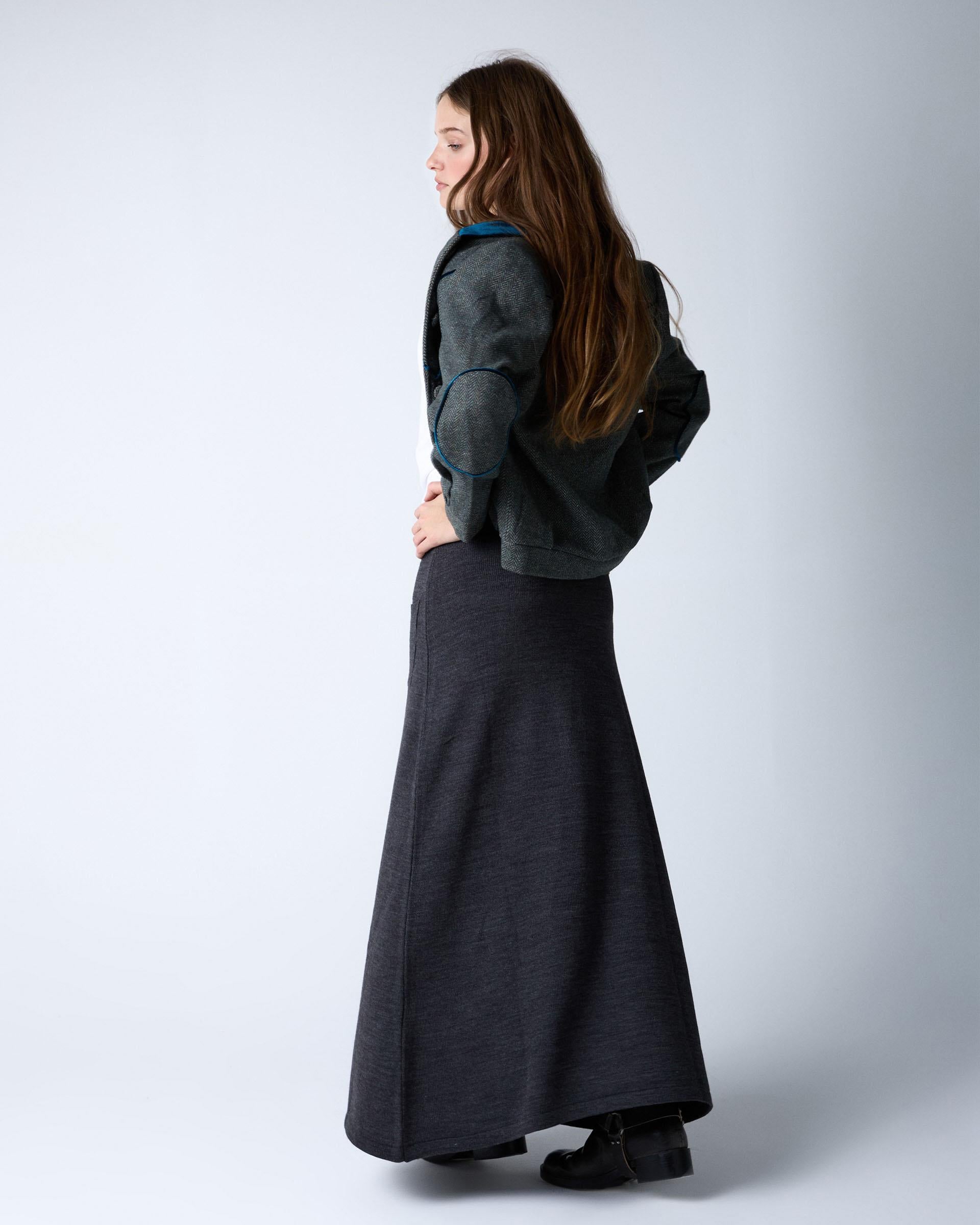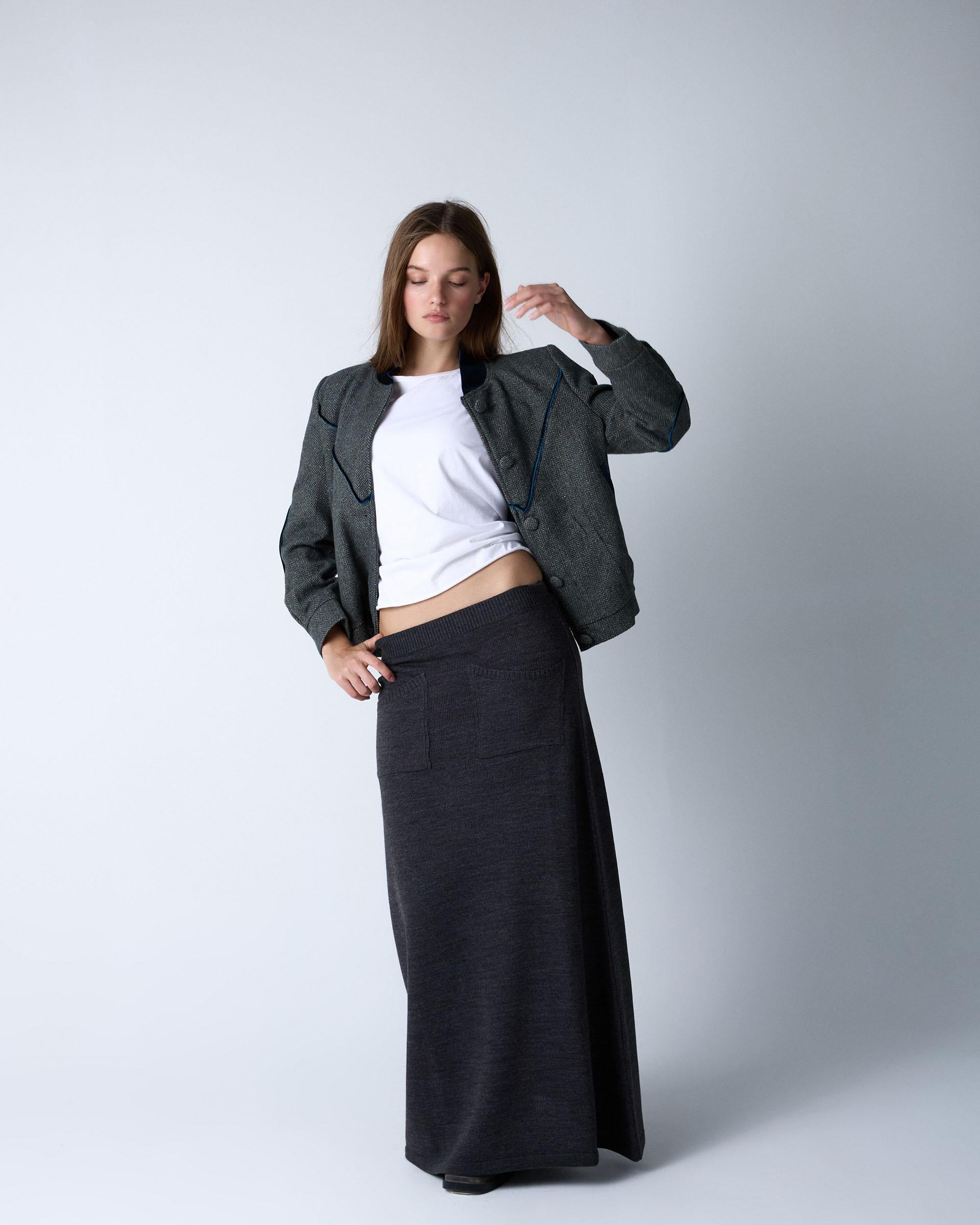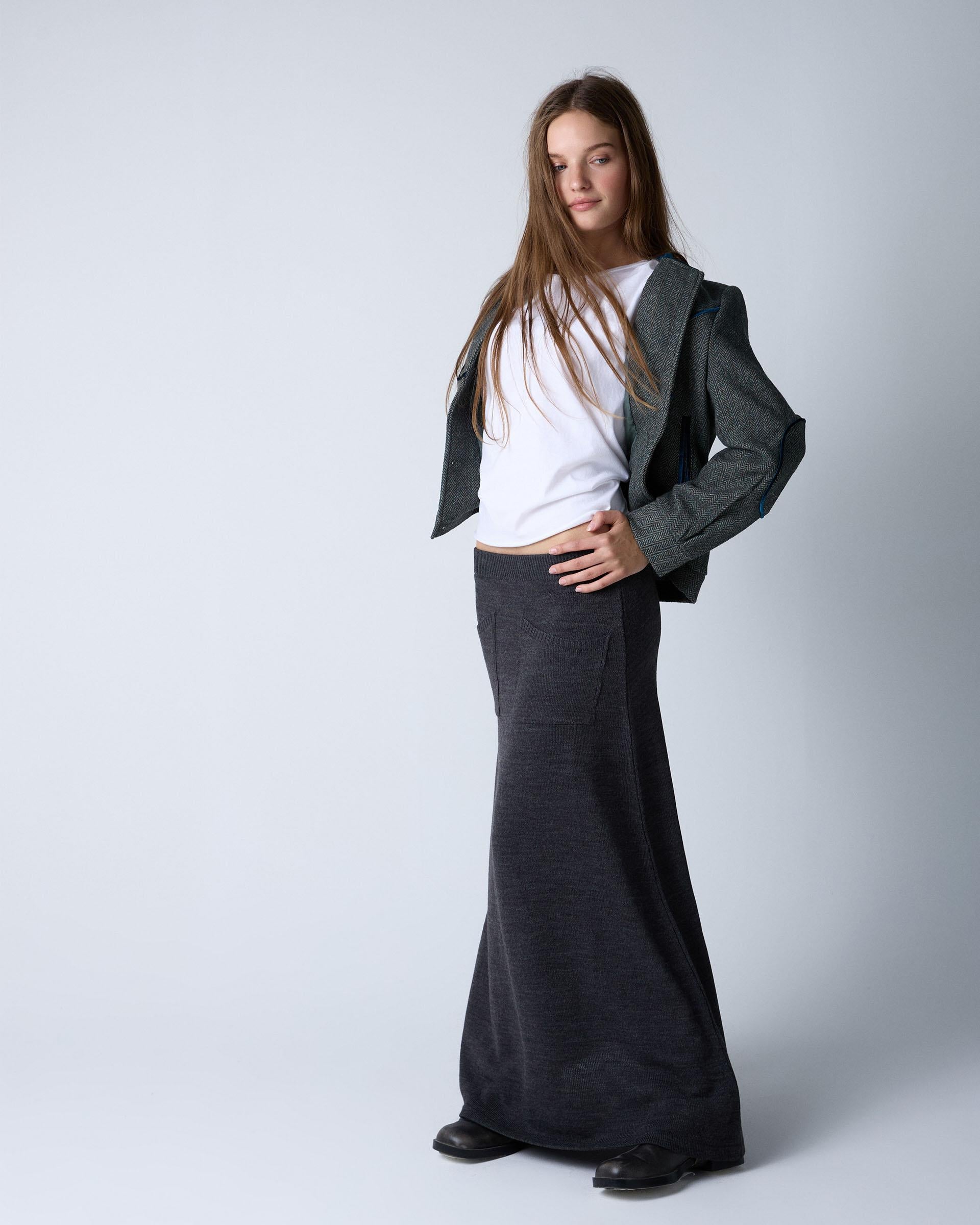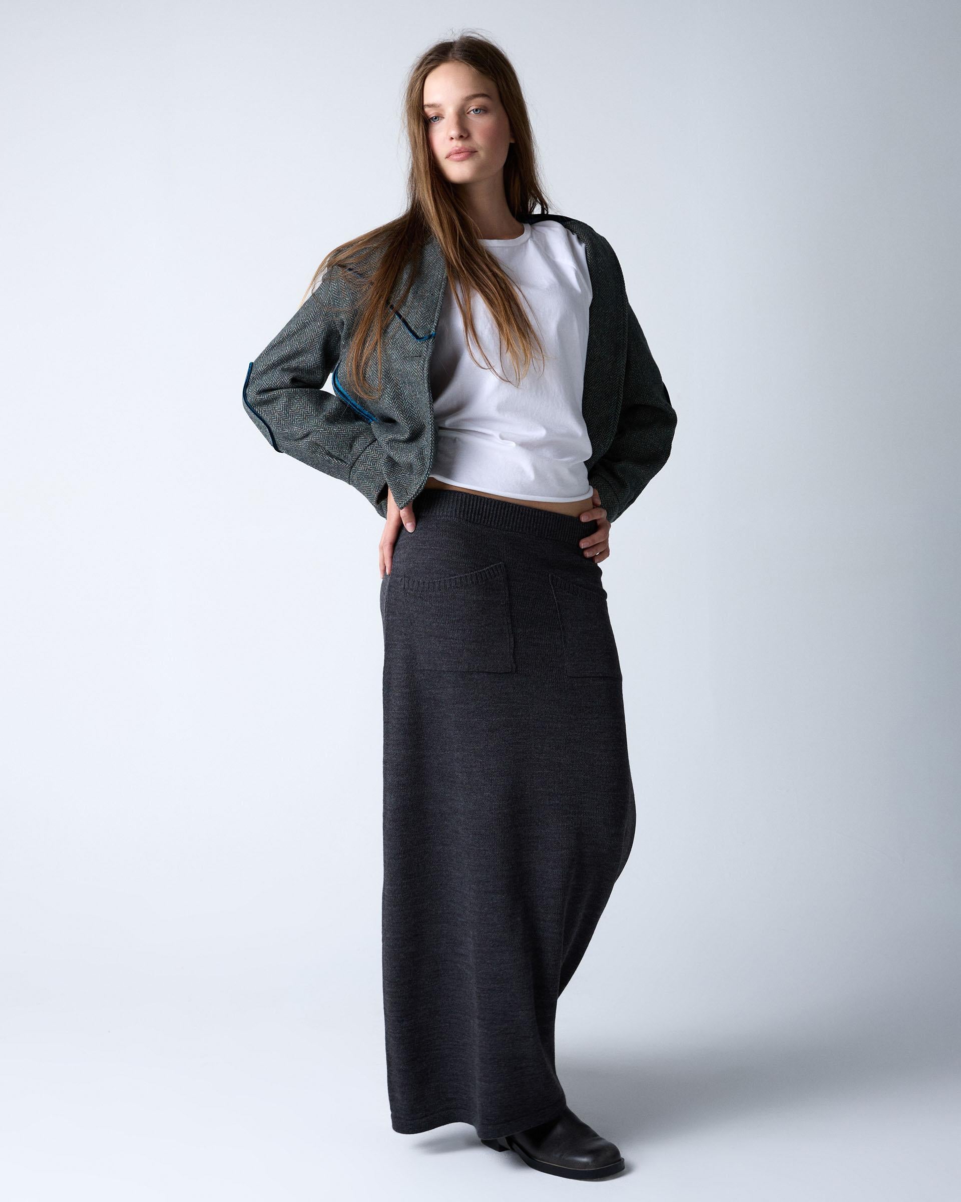 Falda larga de punto de color antracita con bolsillos en delantero y goma en cinturilla.